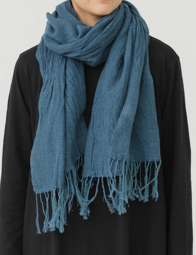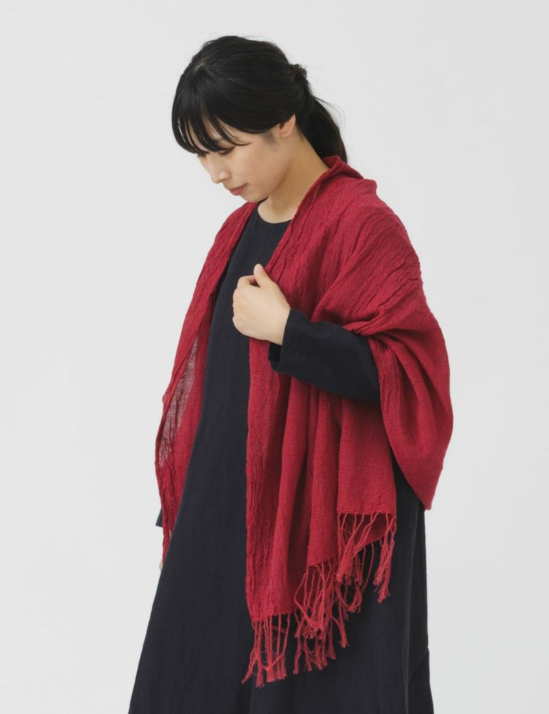 しわ感の強い生地とふらっとな生地を、大きな市松状に切り替えたパターンのウール混ショールです。伸縮性があるので身体にフィットするように着けていただけ、大人っぽさと個性をプラスしてくれます。アレンジもしやすく、羽織ったり巻いたりして、コーディネートをお楽しみください。