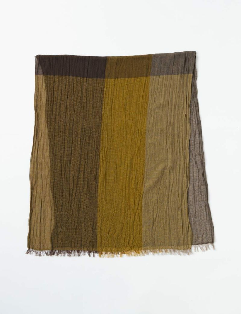綿とウール素材を使用した、大きな格子柄の大判ストールです。程よくしわ感があることでふんわりとしており、しっとりした柔らかな肌触り。薄地で透け感のある厚みなので巻き心地も軽く、羽織っても巻いてもお使いいただけます。コンパクトにたためるので、バッグに収納するときもかさばらす持ち運びも便利です。