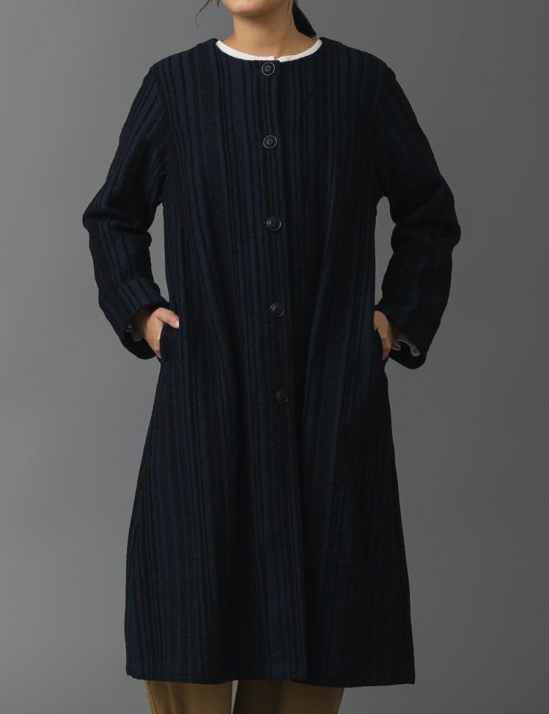 刺繍を施したような立体的なジャガード織のロングジャケットです。手仕事から生まれる温もりや優しさを、こぎん刺子やギャッベの柄からインスパイアされ織柄で表現しました。綿モール糸をストライプ状に織り込み、立体的で肌ざわりのよい仕上がりになっています。