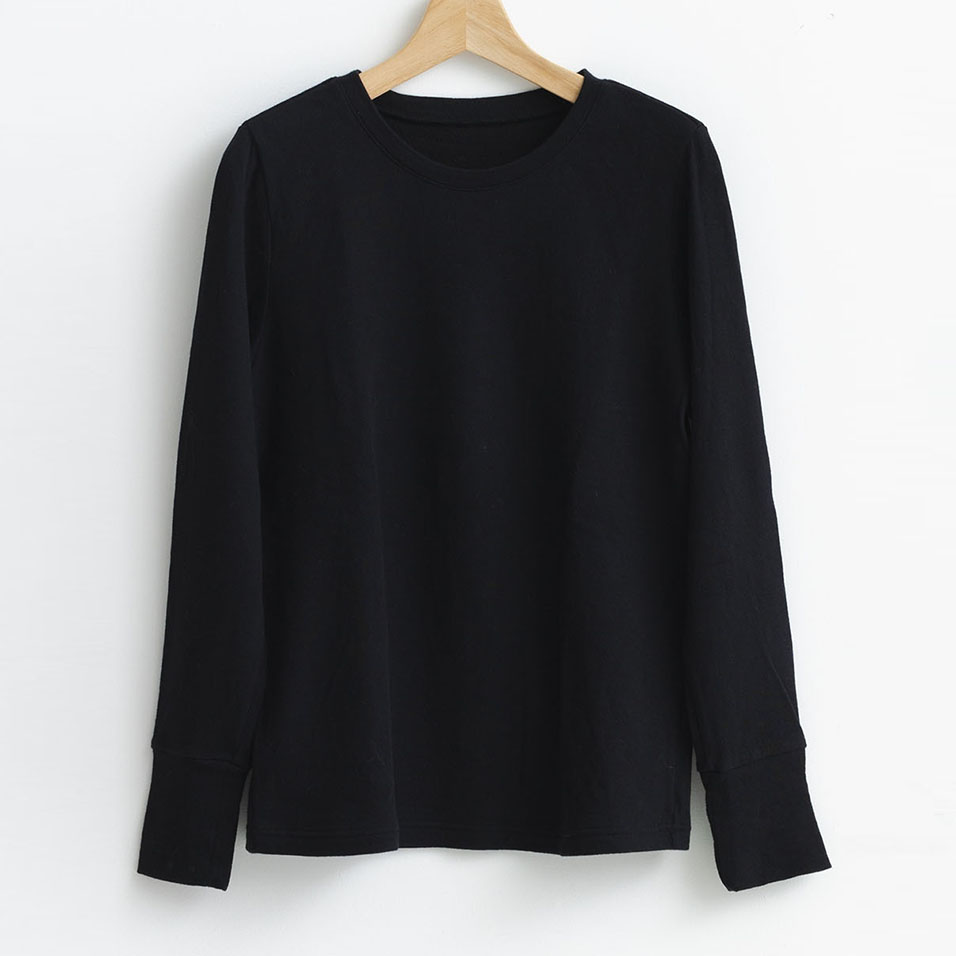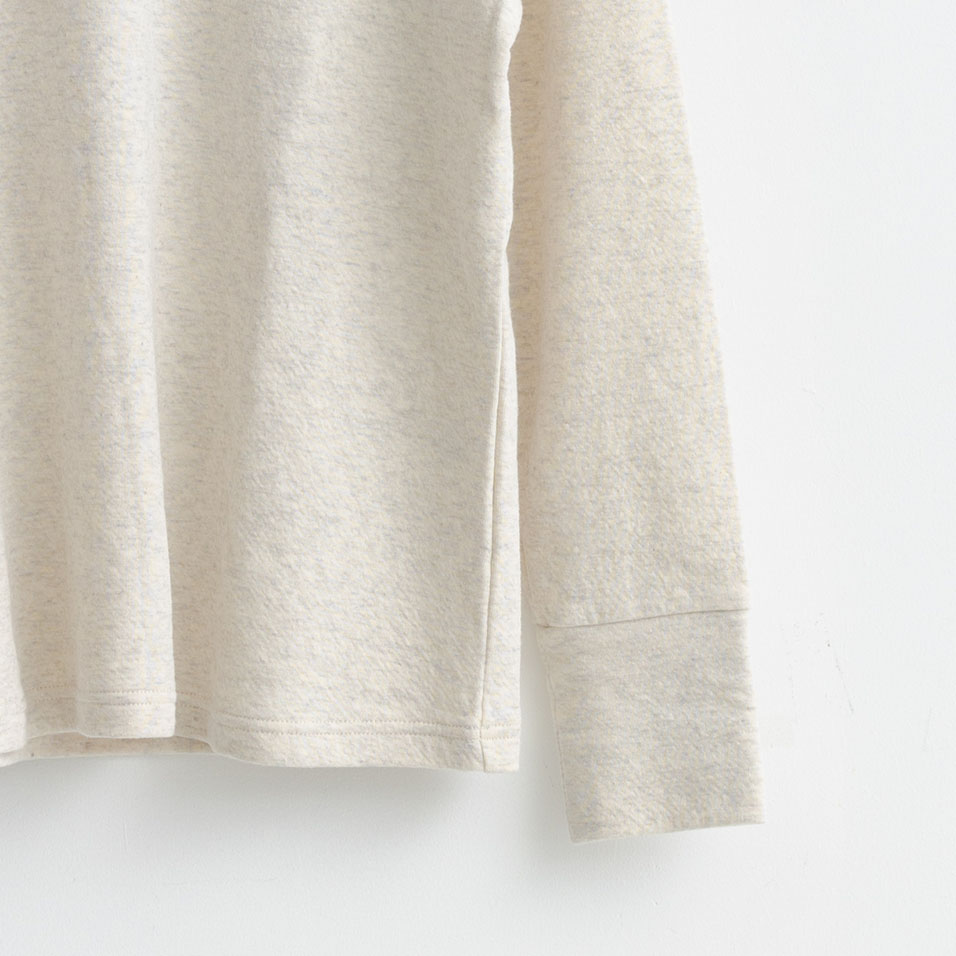 外側は綿、内側は綿ウール素材を使用。肌にあたる内側の部分はウールを芯に、外側を綿でカバーした糸を使用しているため肌あたり柔らかく、お肌が弱い方も安心して着ていただけます。透けにくく一枚で着やすく、重ね着にもぴったりなので色々なコーディネートで合わせていただけます。