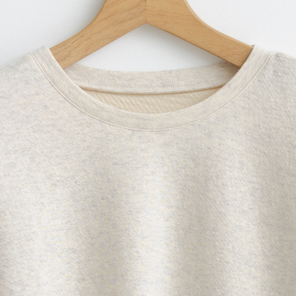 生地は外側は綿、内側は綿ウール素材を使用。肌にあたる内側の素材は、ウールを芯に外側を肌触りが良い超長綿のピマコットンでカバーした糸を使うことで、肌あたりやさしくあたたかい一枚に仕上がりました。ウール混の素材でありながら手洗いできるお手入れの手軽さも嬉しいポイントです。
