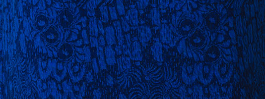 柄は、器の絵付け柄をパッチワーク状に並べた複雑で味わいのある柄です。二重構造になっている生地の接結部分は配色糸で刺し子調に表現し、奥深い色合いと共にふっくらとしたふくらみのある表情も生んでいます。