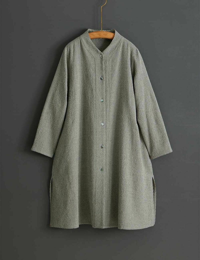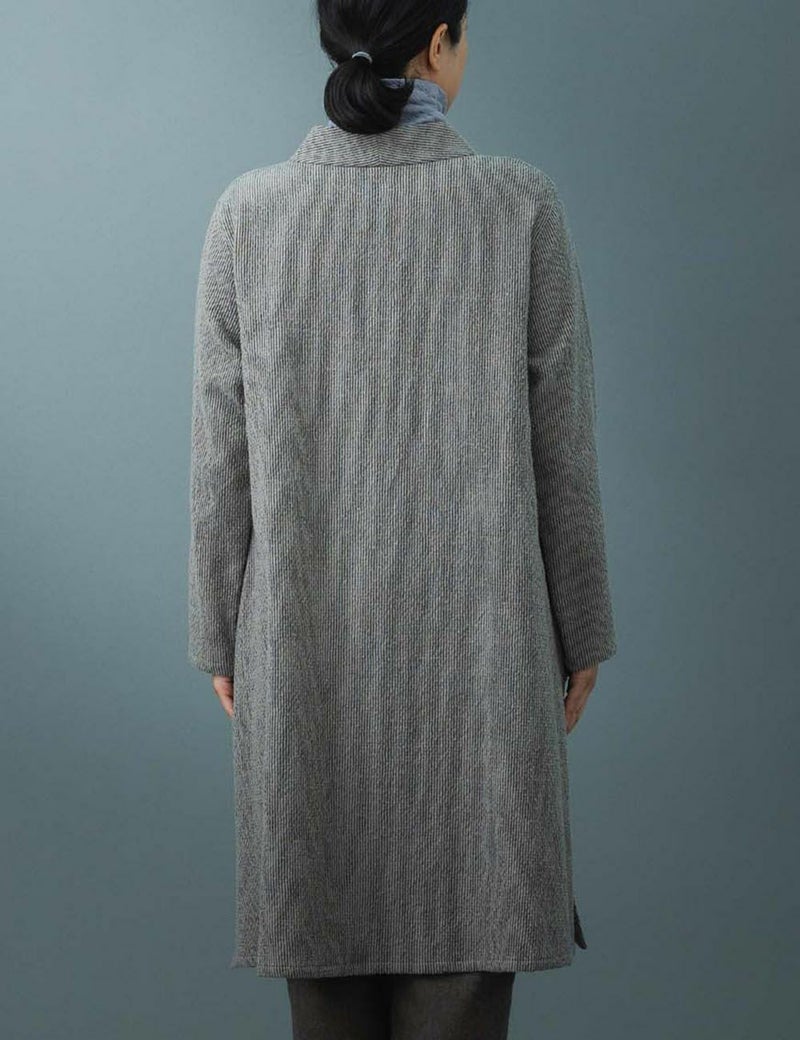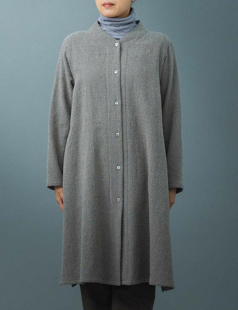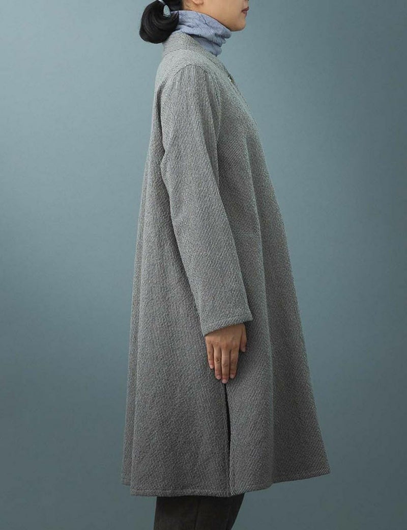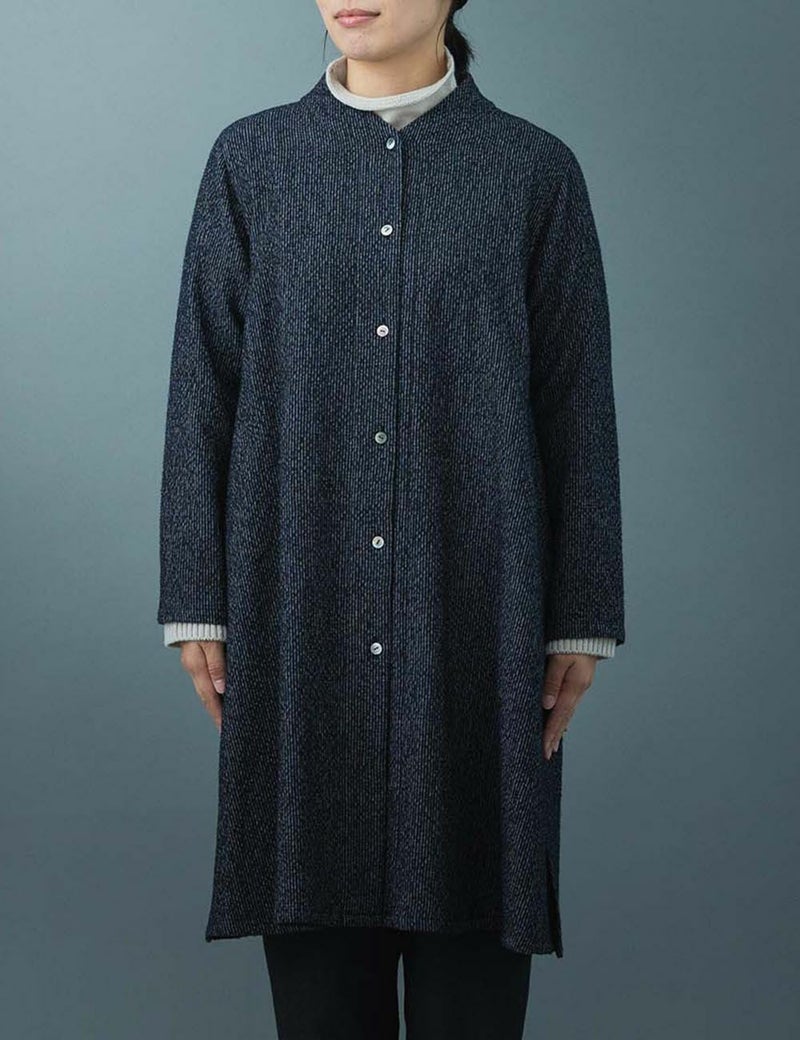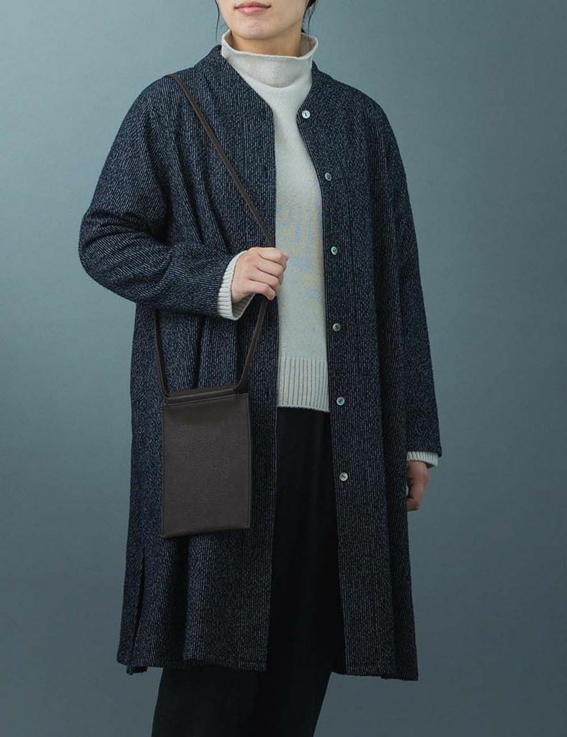 コートを出すまでのアウターとして使うことができ、ノーカラーなので真冬はコートインとしても使える裏地のない一枚仕立てです。長めの着丈は脇のスリットで足さばきもよく、カーディガンのような着こなしもおすすめです。