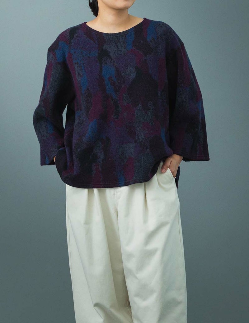 まるで絵画のような繊細な筆致を、ニットにそのまま閉じ込めました。 鹿子の木(カゴノキ)の樹皮が持つ、独特のまだらな模様と繊細な線を、多色使いの原画で表現。国内でも珍しい両面選針機を用いて、その美しい模様を忠実に再現しました。適度な厚みと、もっちりとした柔らかな肌ざわりが温もりを優しく包み込みます。タートルネックとのレイヤードスタイルはもちろん、ワイドパンツやスカートなどボリュームのあるボトムスとも好相性。一枚で季節の変わり目を彩る、絵画のような美しいニットです。
