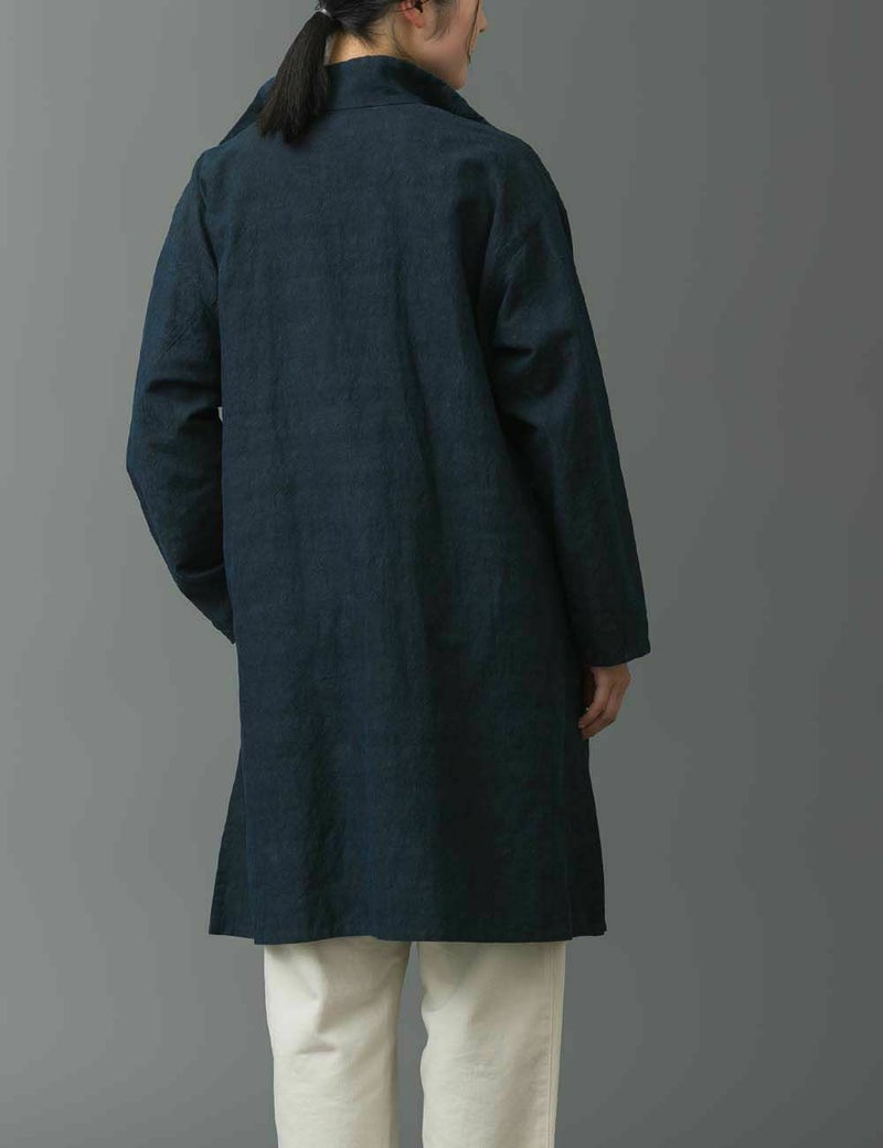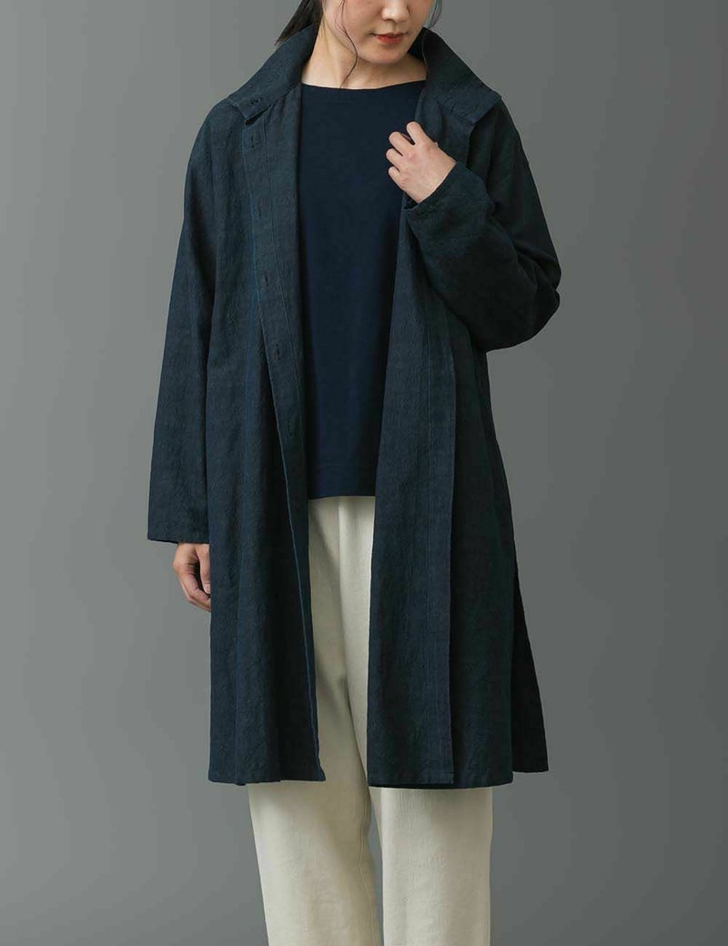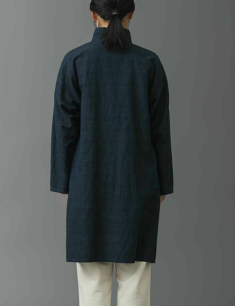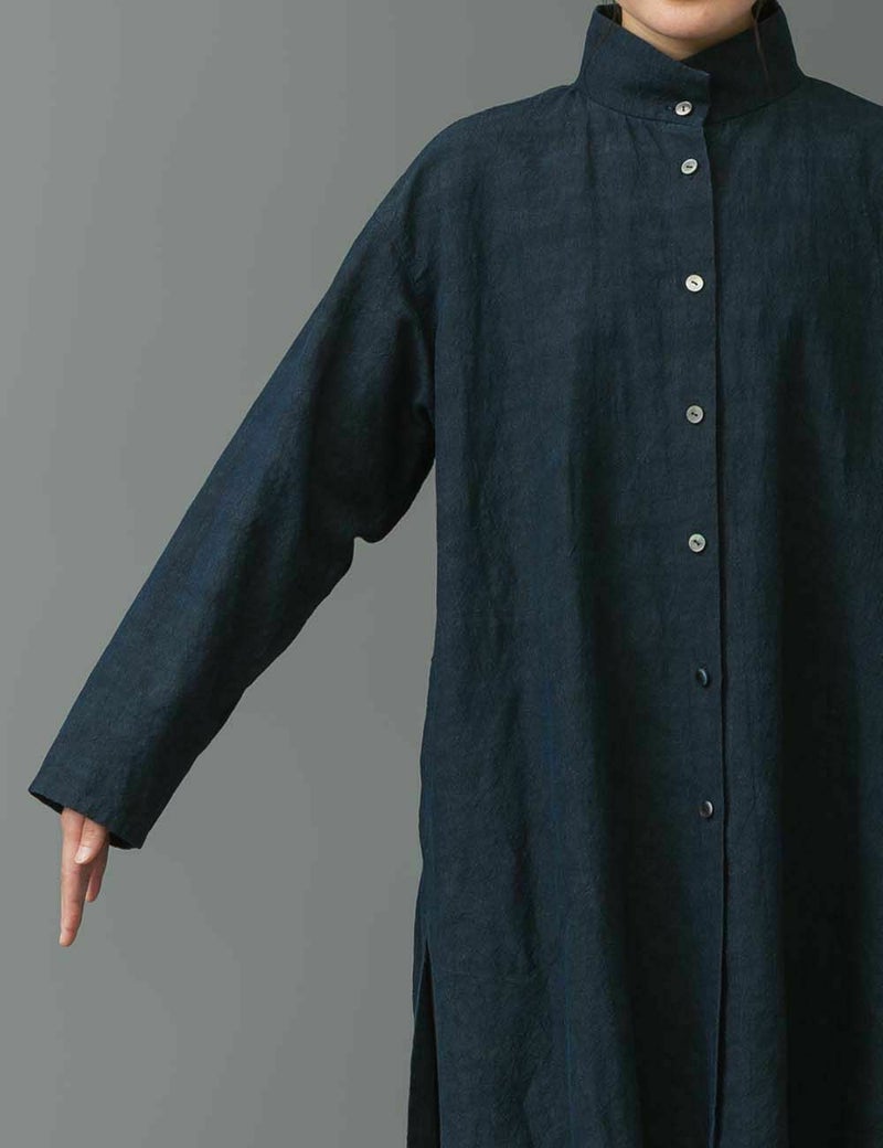 さらりとした綿麻シャンブレーでつくったジャケット風ロングブラウス。クールな立ち襟のみをポイントに生かし、装飾性を抑えたミニマムな仕立てに。引き算の美しさが、藍と墨が混じり合う渋い色味とよく合って、着る人の持ち味を引き立てます。