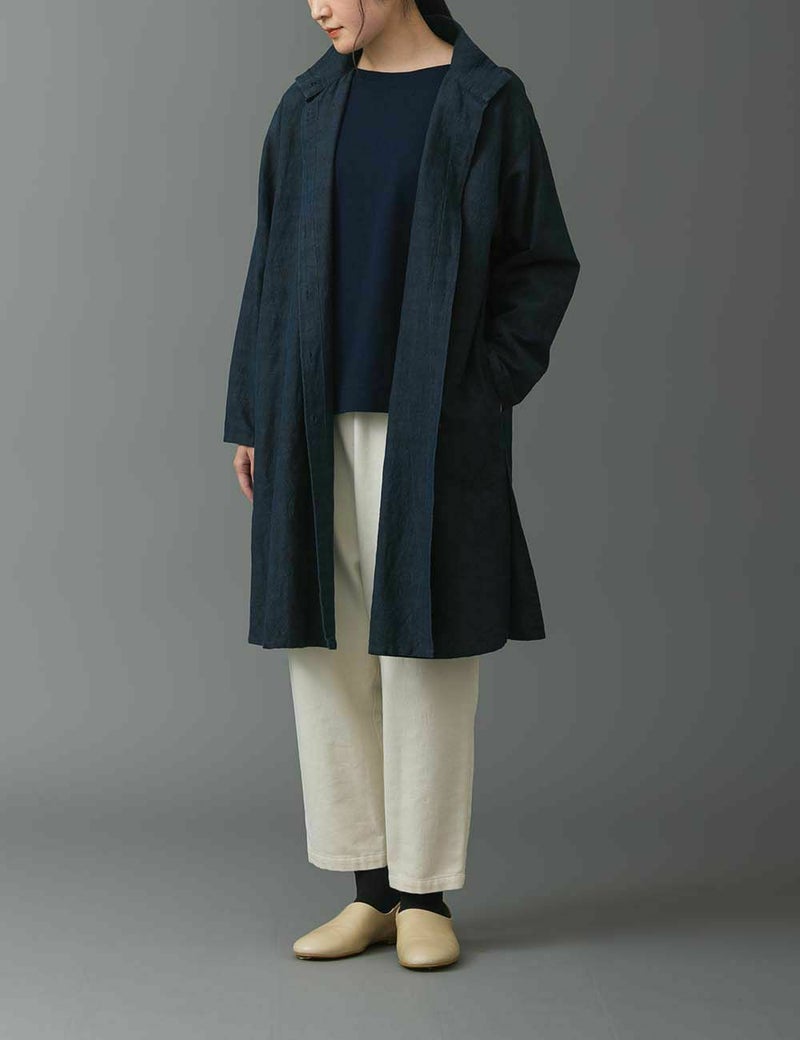 経糸(たていと)に藍の先染め糸、緯糸(よこいと)に白糸を使って織り上げた綿麻シャンブレー生地に、備長炭から抽出した色を重ねました。さらりとした綿麻素材ながら、奥行きのある色味に大人の品格が漂います。