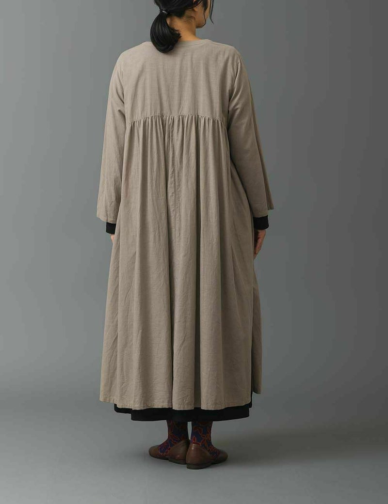 Vネックが首元をすっきり見せてくれる前開きワンピース。胸元の高め位置からたっぷり入ったギャザーがスタイルアップ効果を叶えます。かすかに透け感のある生地は、まるでそよ風のように軽く爽やか。羽織りものとしても着られて着回し力は抜群です。