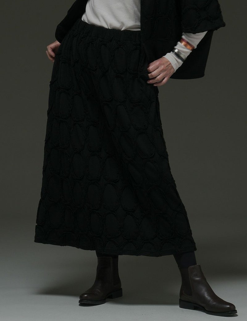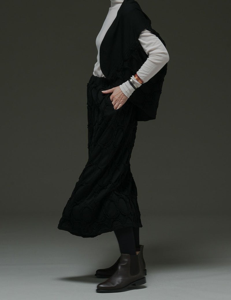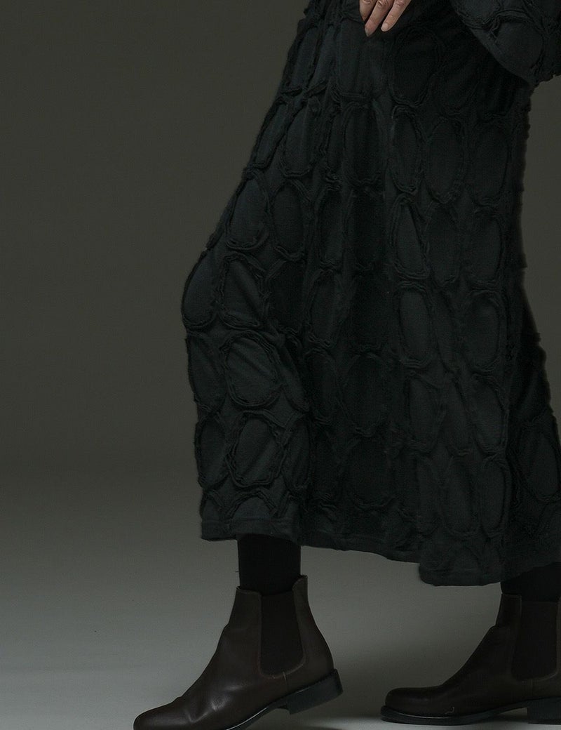 しなやかな上質ウールのカットソー生地に、共生地のテープ刺繍をほどこした、遊び心あふれるテキスタイルを使用。リラックスした着心地ながら粋な個性とインパクトがあり、シンプルなコーディネートでもおしゃれに決まります。