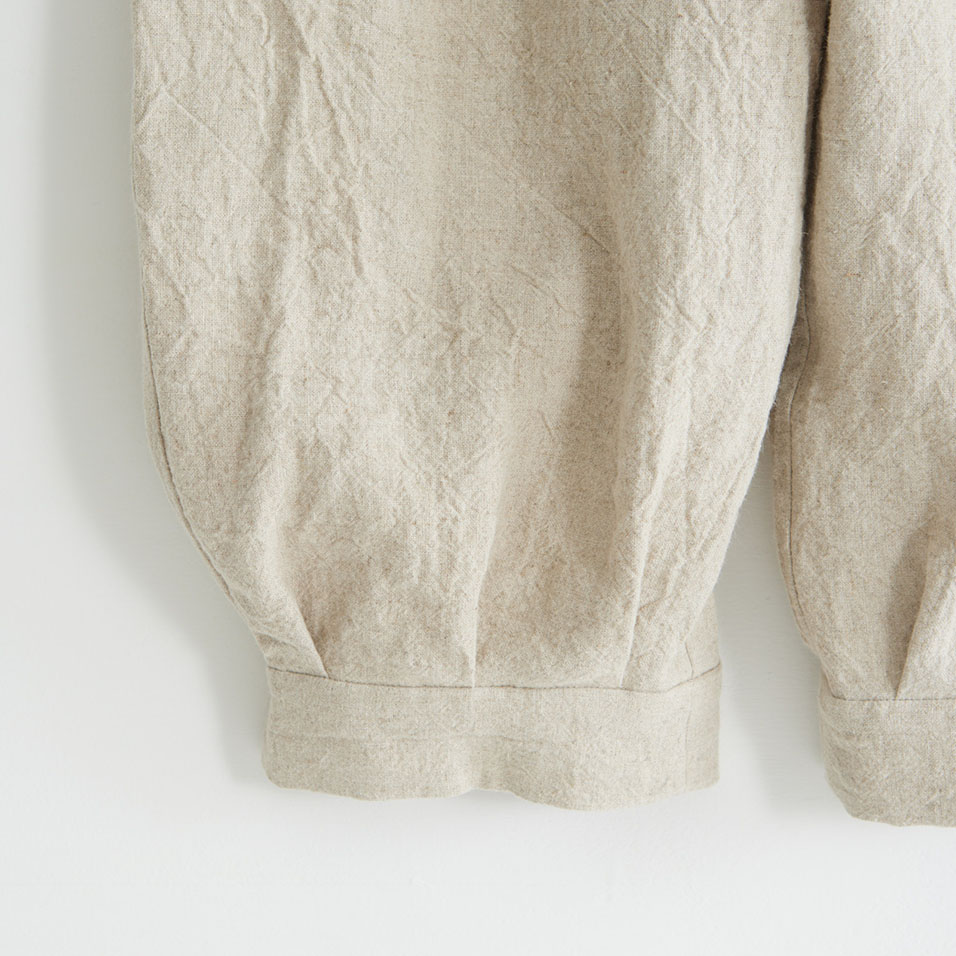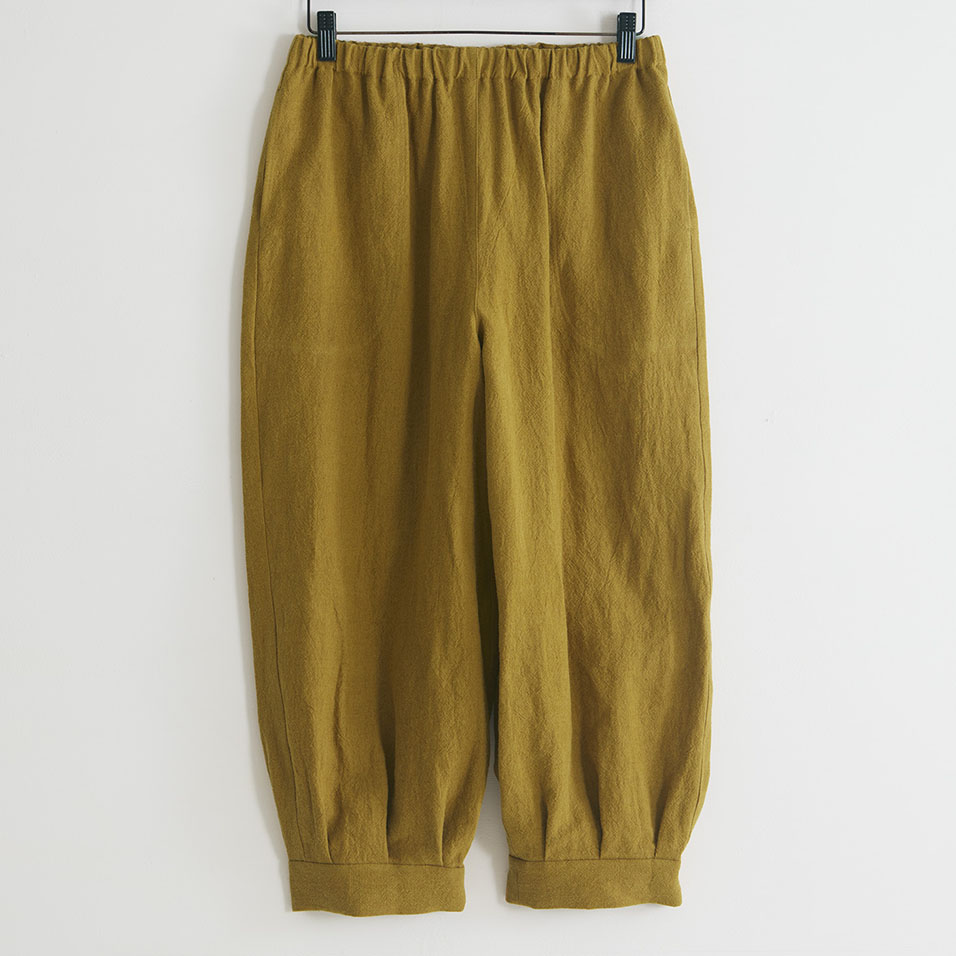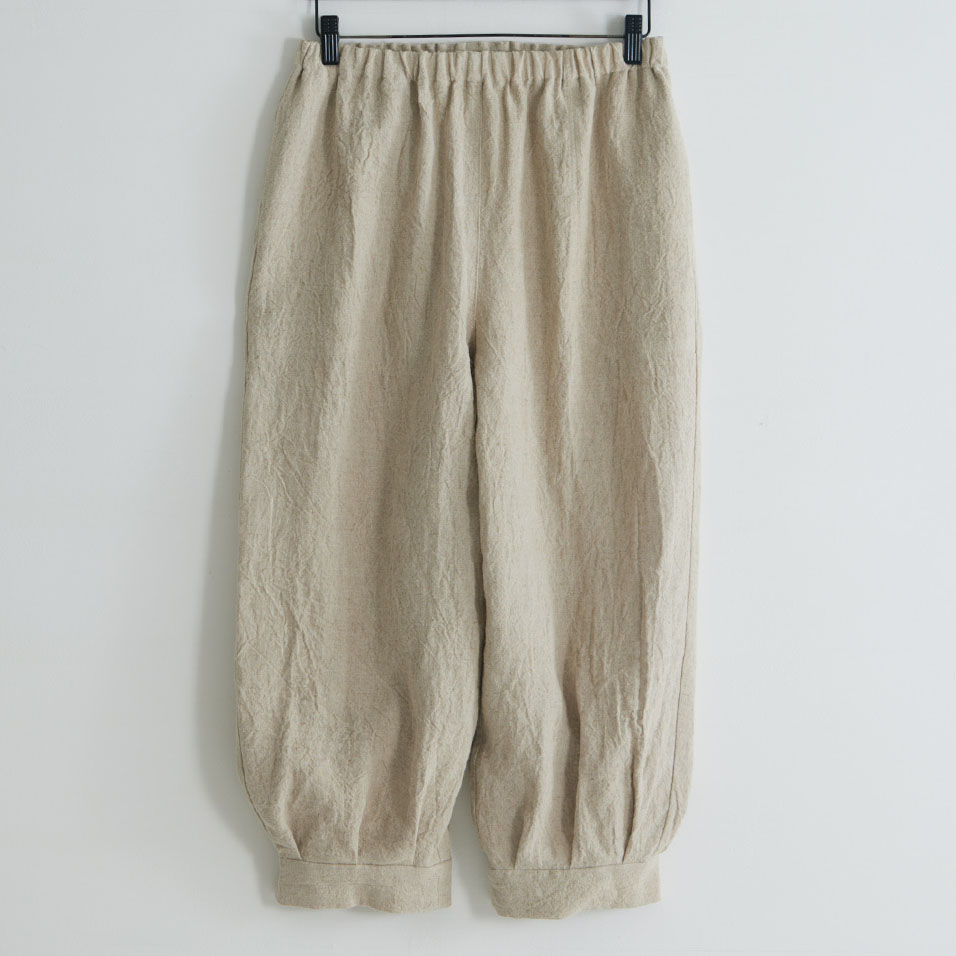 洗いざらし感のある麻の表情が粋なパンツです。裾にタックを入れ、カフスで切り替えた、広がりすぎないシルエットでどなたもはきやすい形です。ウエストはゴム仕様、アイロンいらずで取り扱いも楽です。