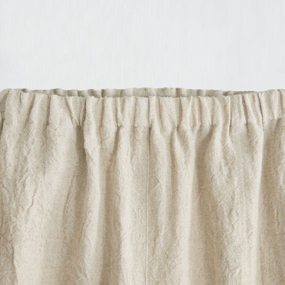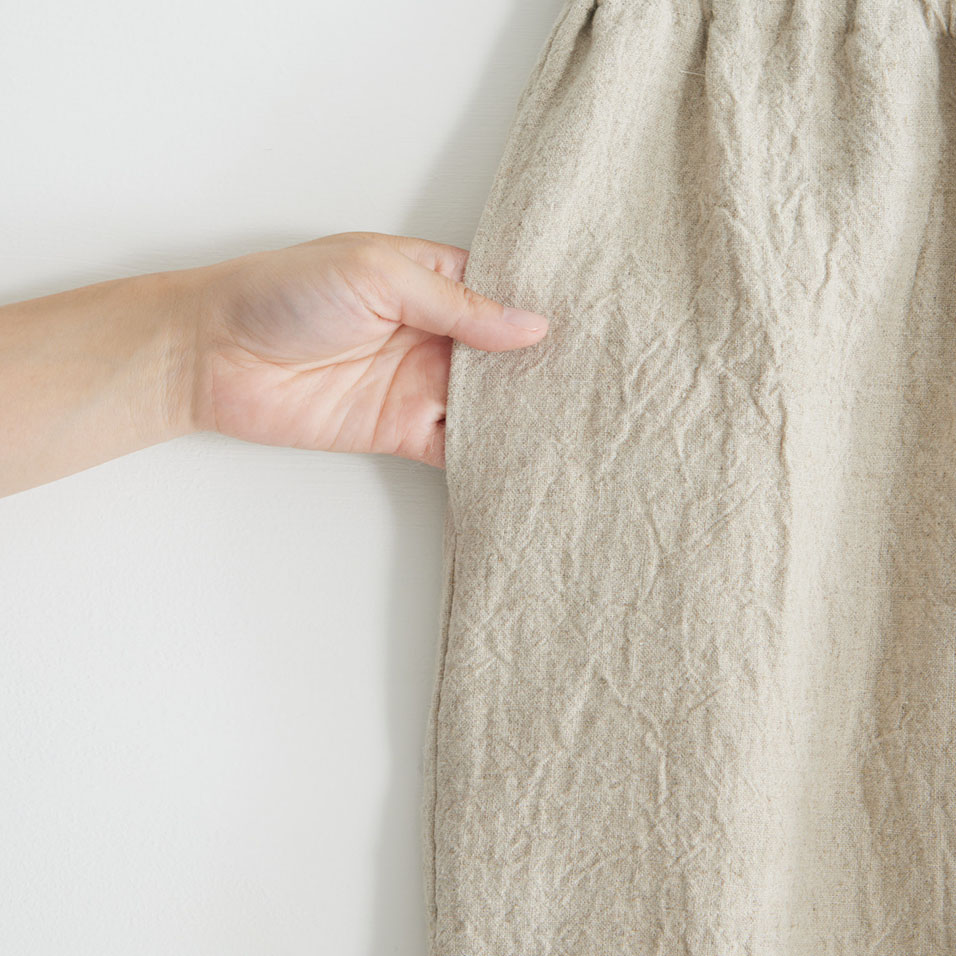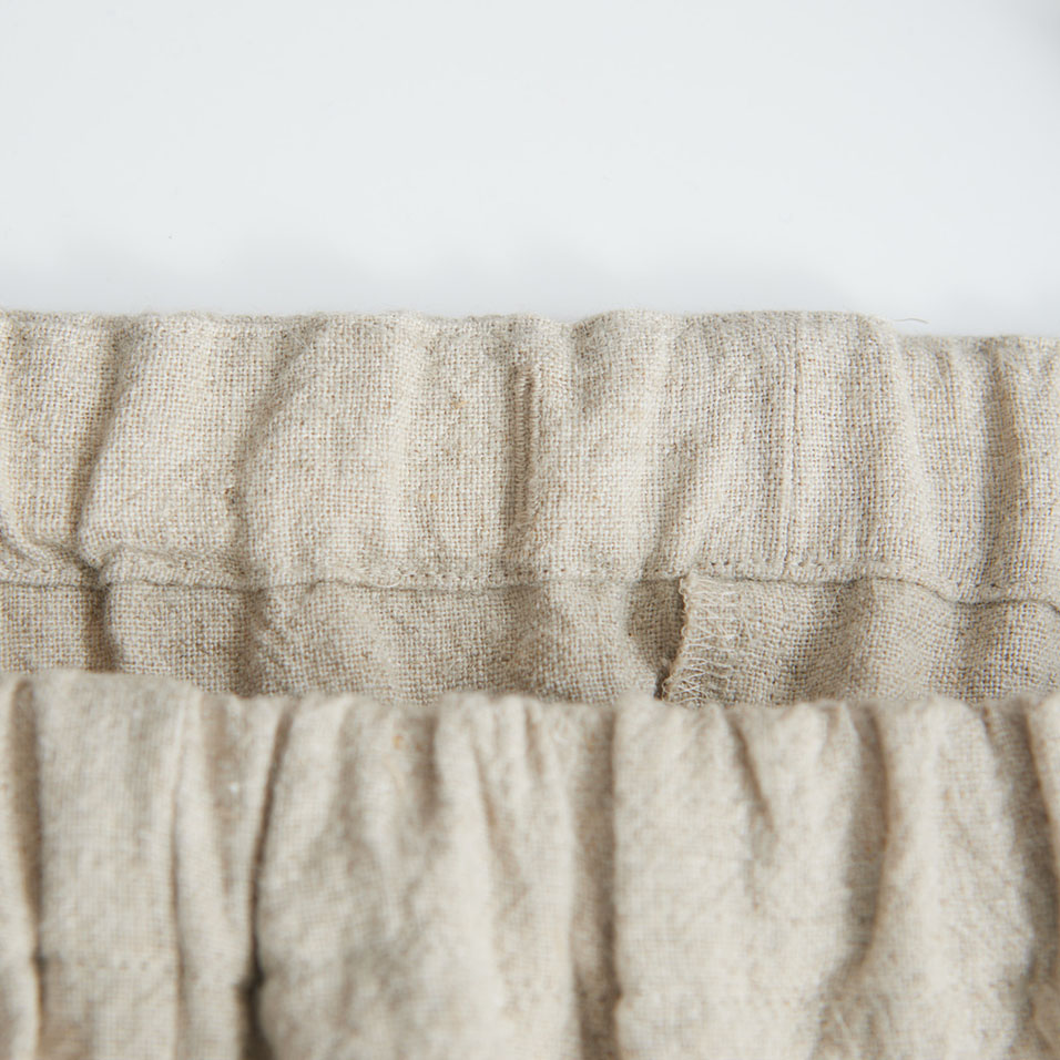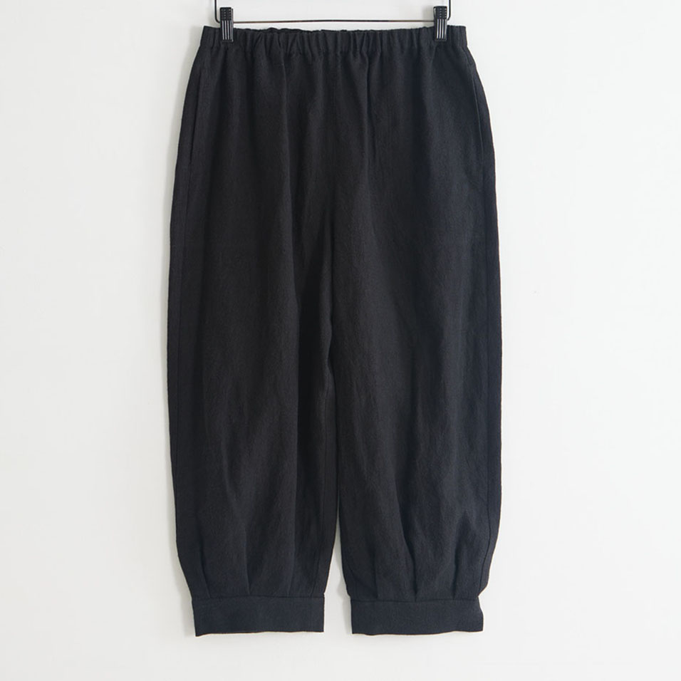 洗いざらし感のある麻の表情が粋なパンツです。裾にタックを入れ、カフスで切り替えた、広がりすぎないシルエットでどなたもはきやすい形です。ウエストはゴム仕様、アイロンいらずで取り扱いも楽です。
