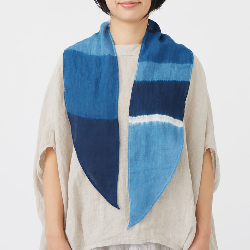 【 藍染め 】天然灰汁発酵建てによる「正藍(しょうあい)染め」のストール。薄手の麻の白生地を、藍の濃淡で段々に染め分け、アクセントに白をきりりときかせました。使い込むほどに藍の色と麻の風合いが育っていくのが楽しみです。