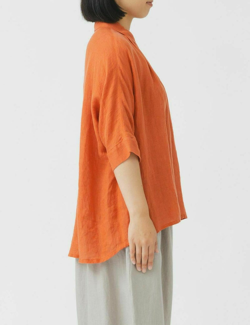 やわらかくて肌ざわりがよく、軽くて通気性にすぐれた、夏にぴったりのこだわりの素材「麻ガーゼ」を使ったブラウスです。袖付けが無く、ゆったりとした身幅なので、さらりと一枚で着やすいです。後ろの丈が長めなのも、うれしいポイントです。