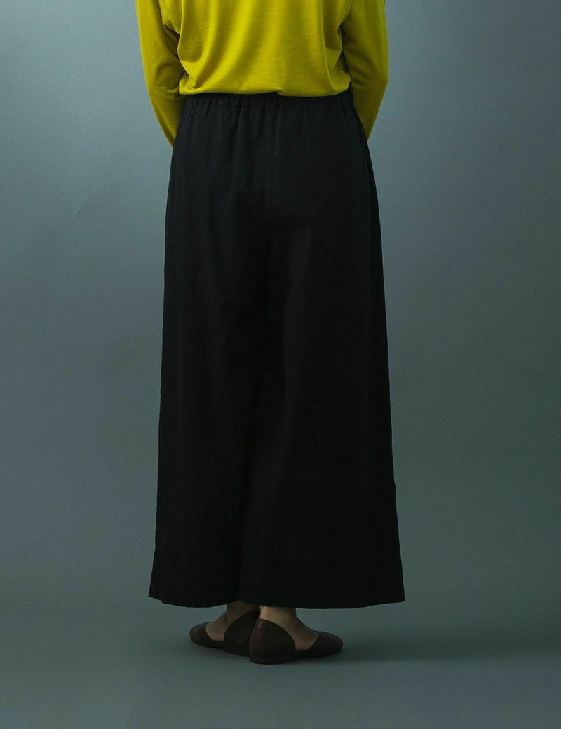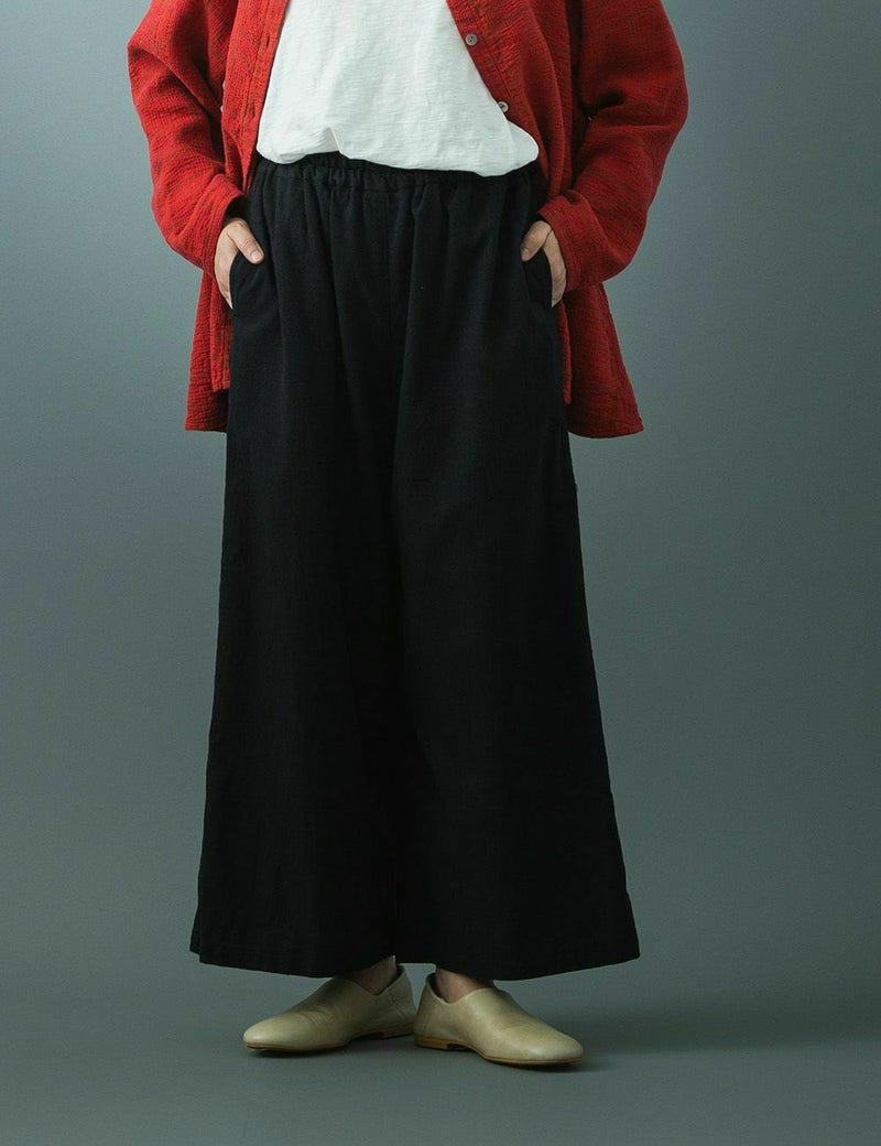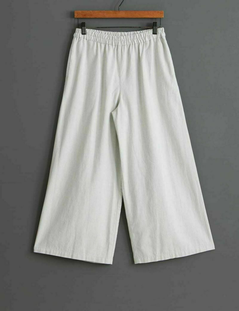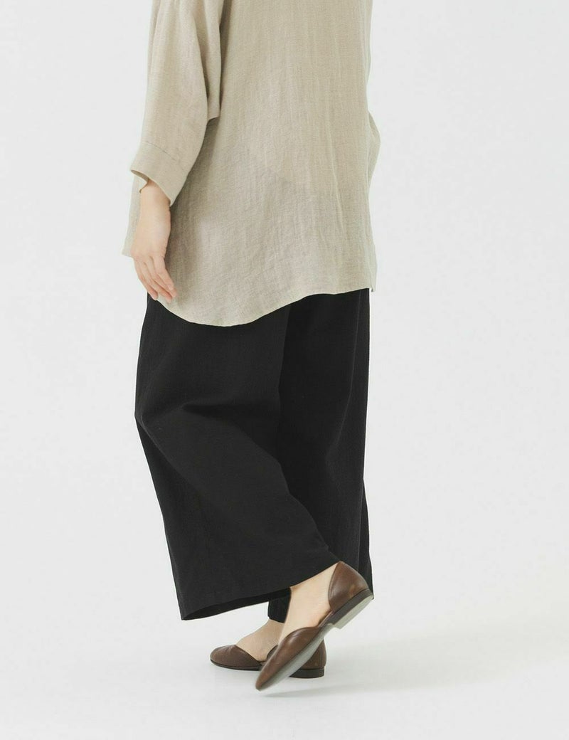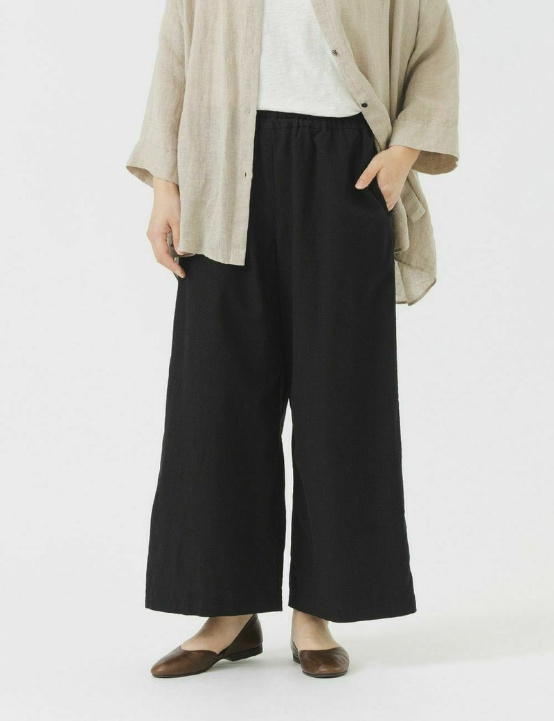 ほどよいワイドシルエットで、カジュアルな中にも上質さと品の良さのあるパンツ。綿のやわらかさと麻のサラッとした肌ざわりで、年中はいていただけます。加工方法を見直したことで、洗濯を繰り返しても毛羽立ちにくく、長くご愛用いただけます。