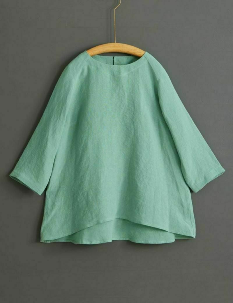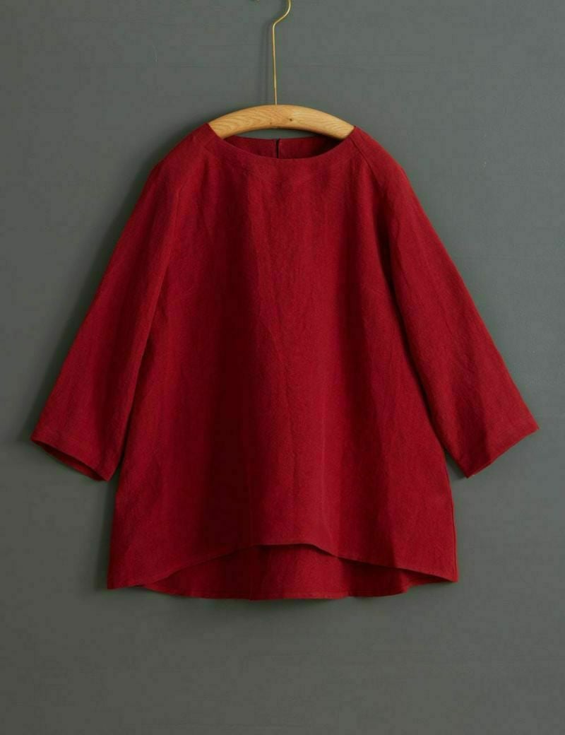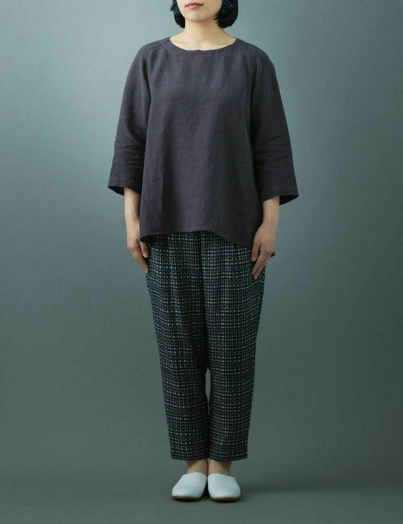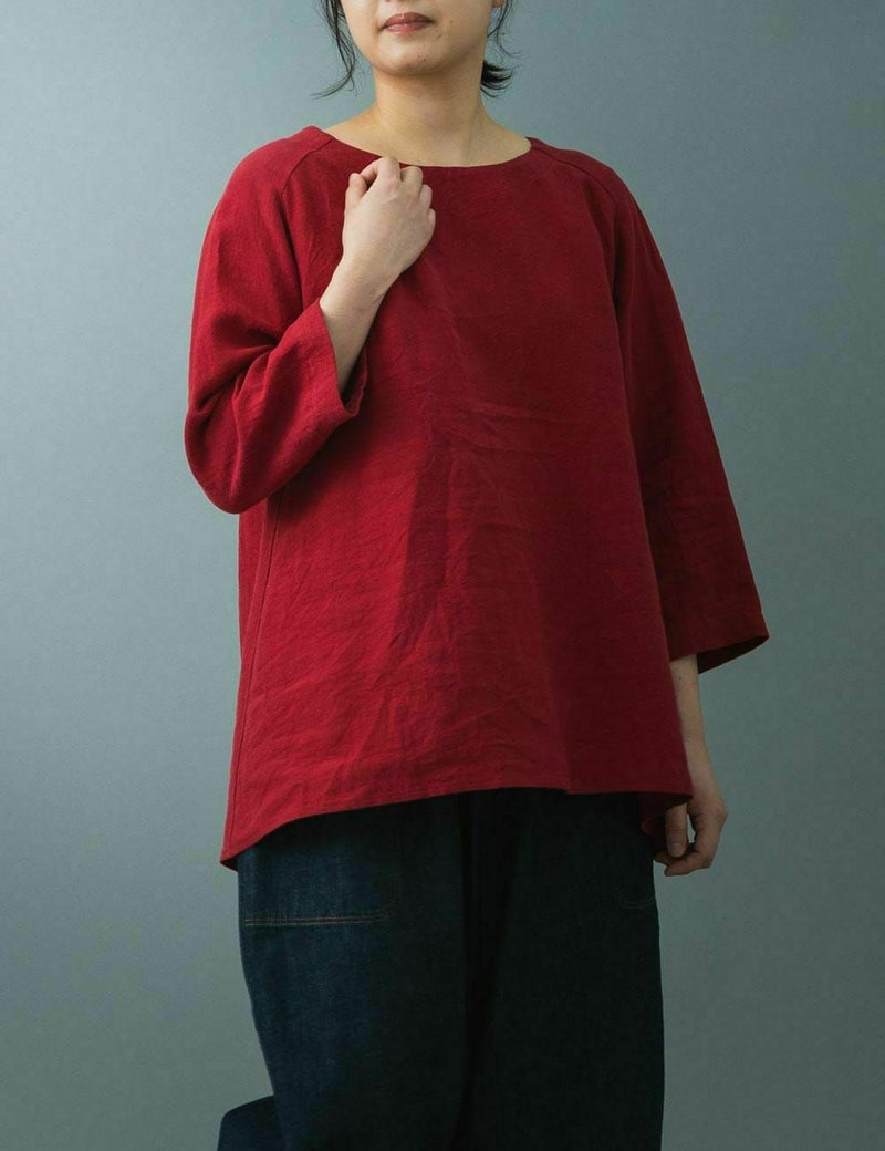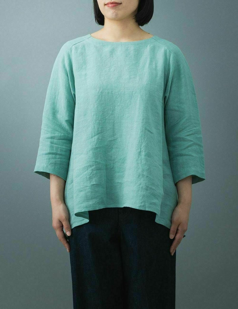 里山の自然からもらった色合いが心地よい、麻のシンプルなブラウス。手首がのぞく八分袖に、ほどよい襟あきのラウンドネック、ヒップが隠れる後ろ下がりのAラインシルエットなど、着やすさのためのこだわりが詰まっています。