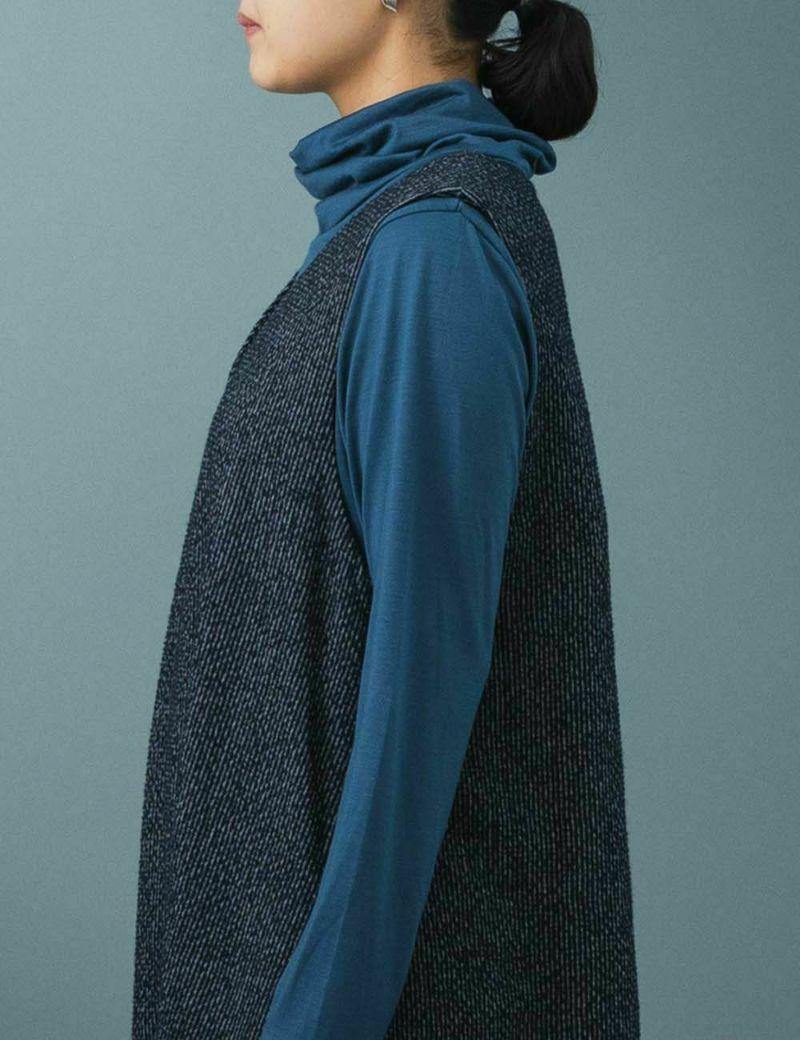 流行りや年齢を問わずに着ていただけるシックでシンプルなストライプ素材です。ウールで暖かく、綿の強度で型崩れが起きにくくなっています。 ウールの糸は綿糸よりも切れやすくデリケートなため、織り機を低速で動かすことで糸に負担をかけずゆっくりと丁寧に織り上げました。また綿とウール、異なる素材の糸を交ぜて織るには高い技術が必要となり、ウール生地の産地、尾州産地で織りから仕上げまでを一貫して行い、柄の凹凸や風合いを出しています。