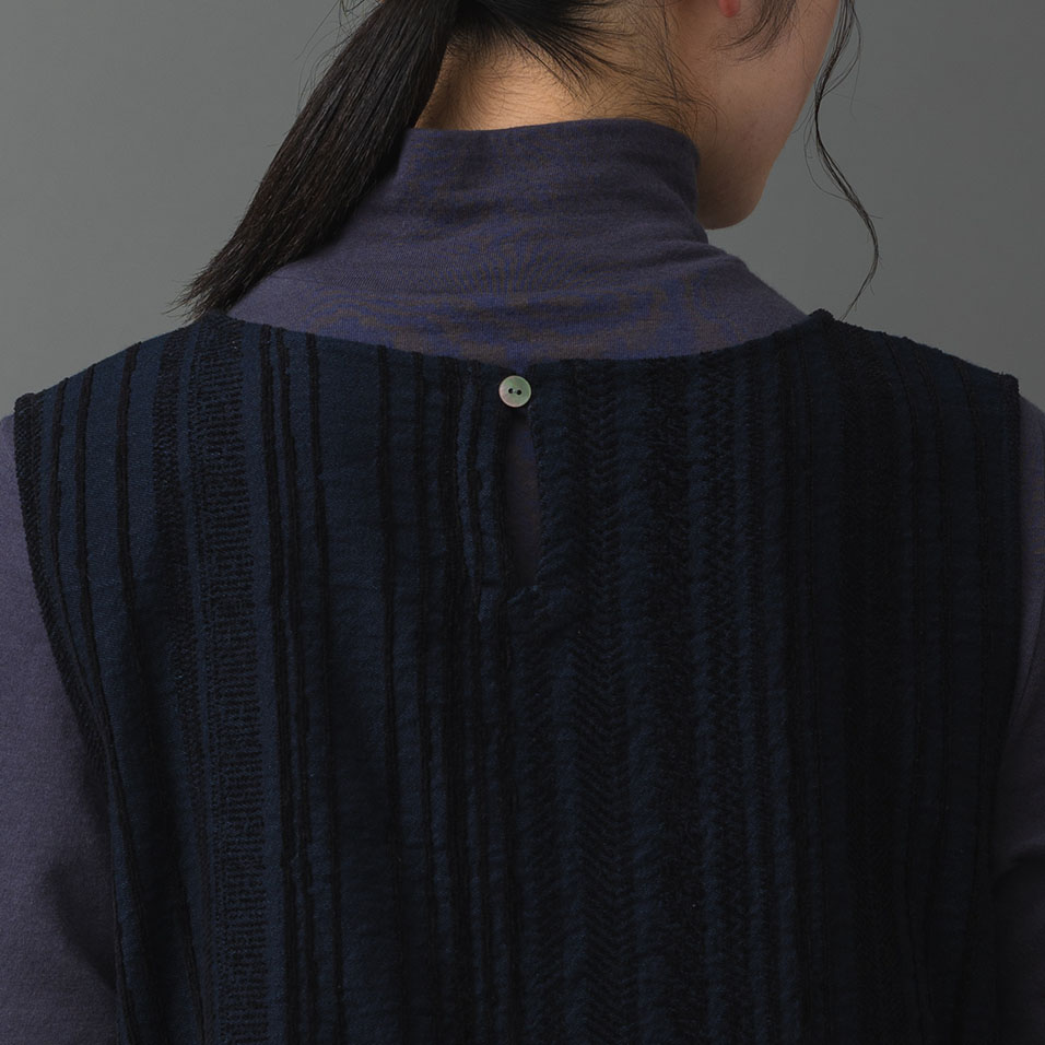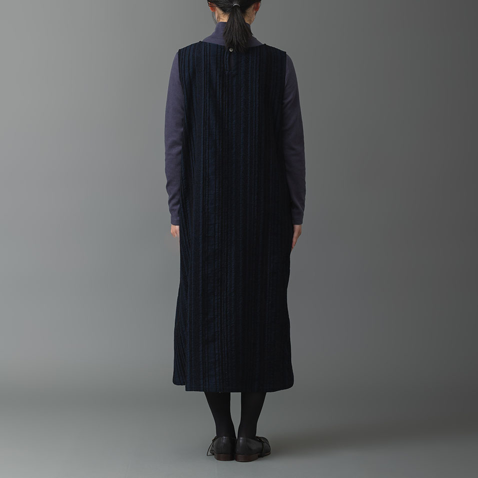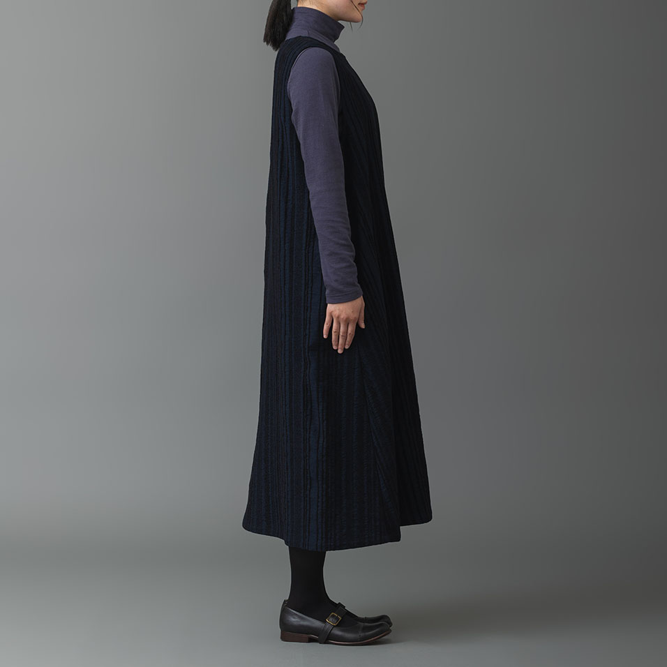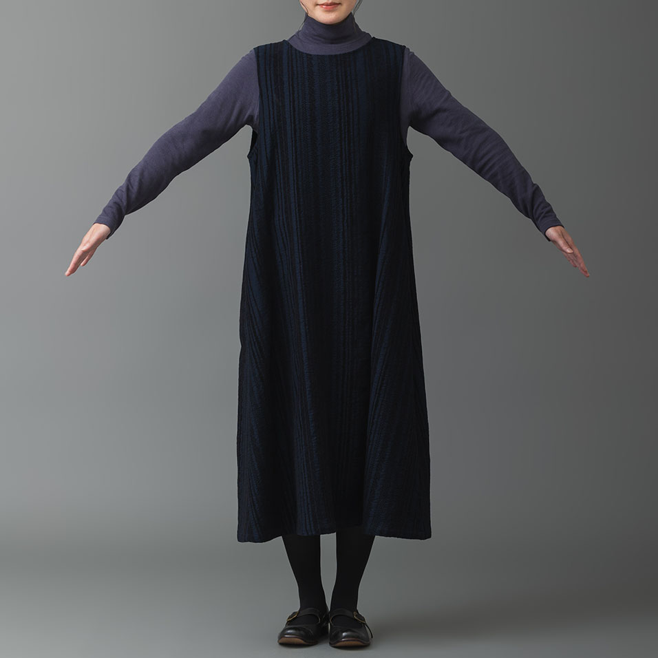 インナーを変えて長い季節の着こなしが楽しめるジャンパースカート。タテ縞とAラインの効果ですっきりと見える美しいシルエットです。刺繍を施したような立体的なジャガード織は、手仕事から生まれる温もりや優しさをこぎん刺子やギャッベの柄からインスパイアされ、織柄で表現しました。綿モール糸をストライプ状に織り込み、立体的で肌ざわりのよい仕上がりになっています