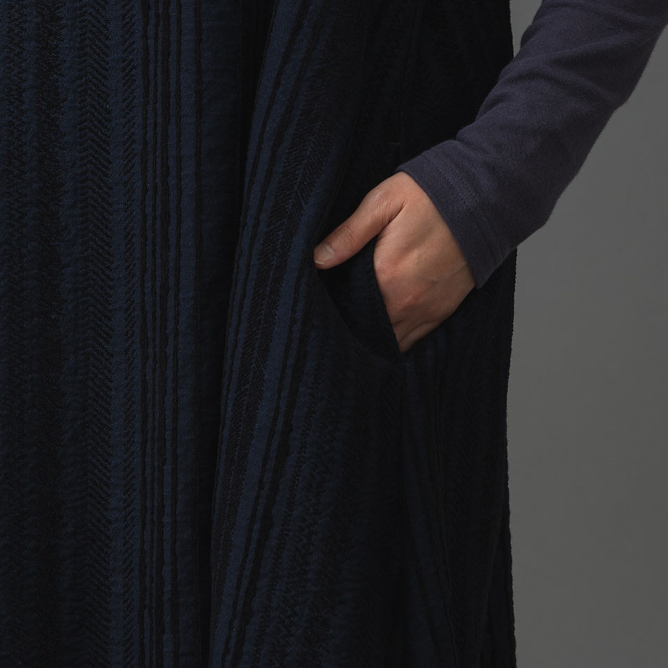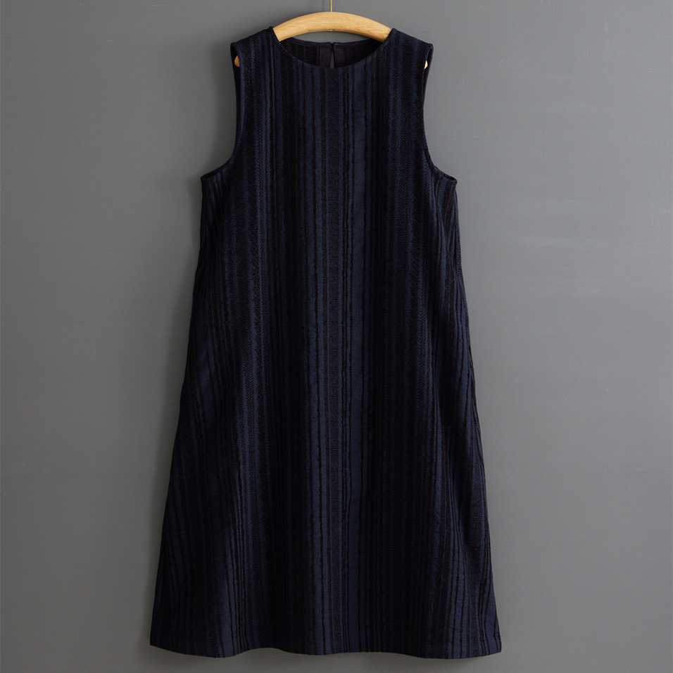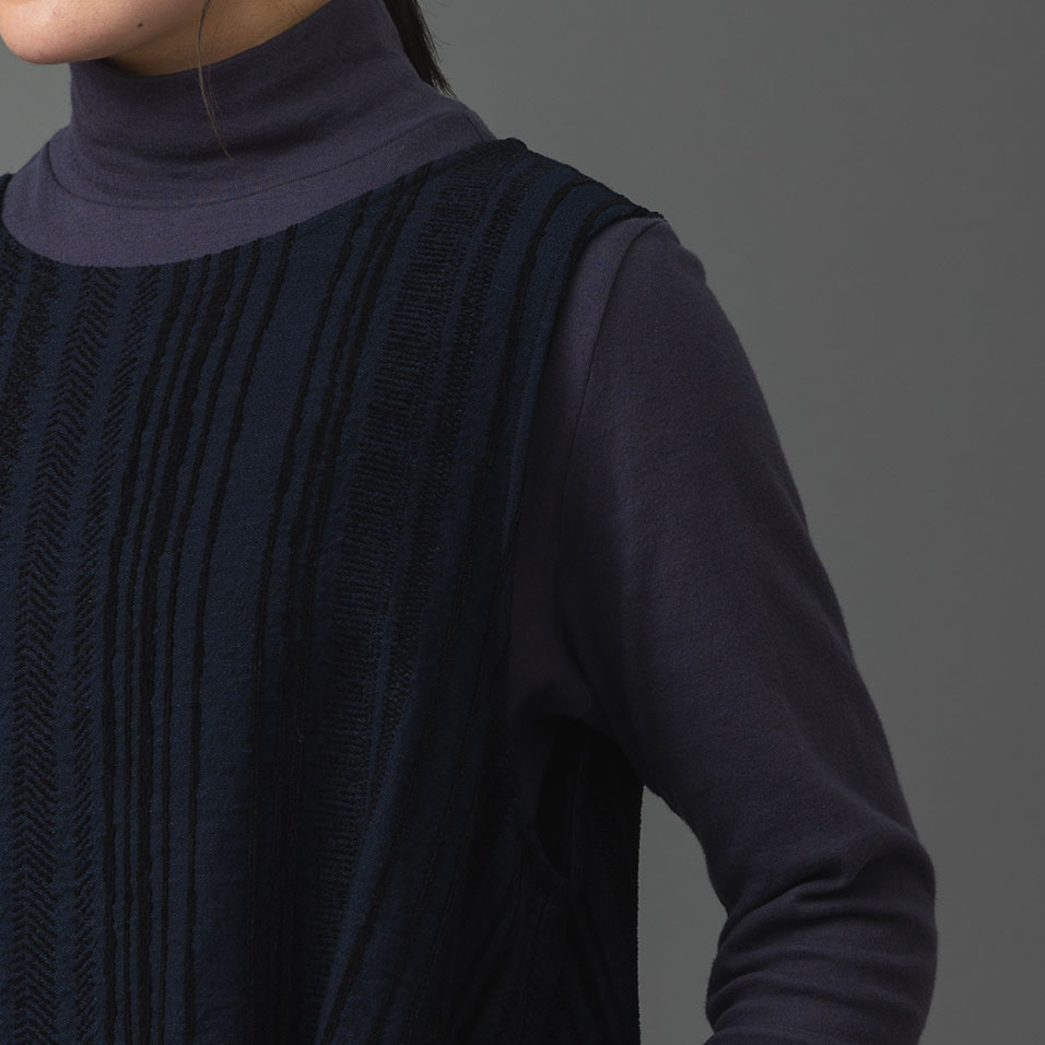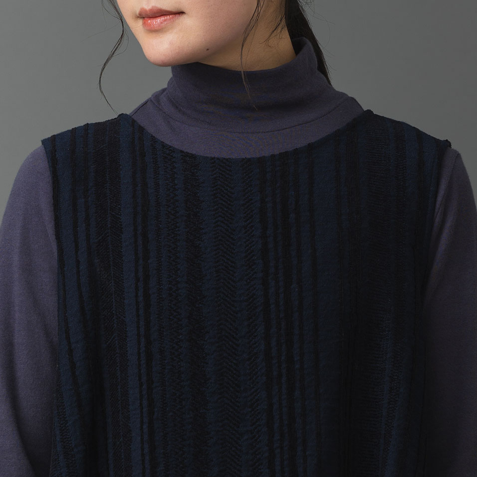 インナーを変えて長い季節の着こなしが楽しめるジャンパースカート。タテ縞とAラインの効果ですっきりと見える美しいシルエットです。刺繍を施したような立体的なジャガード織は、手仕事から生まれる温もりや優しさをこぎん刺子やギャッベの柄からインスパイアされ、織柄で表現しました。綿モール糸をストライプ状に織り込み、立体的で肌ざわりのよい仕上がりになっています