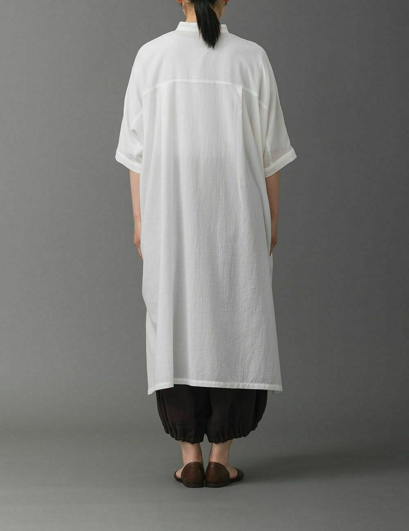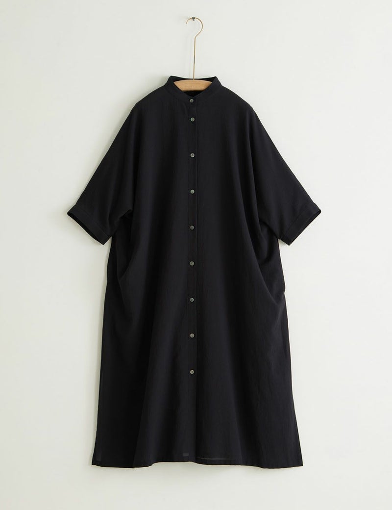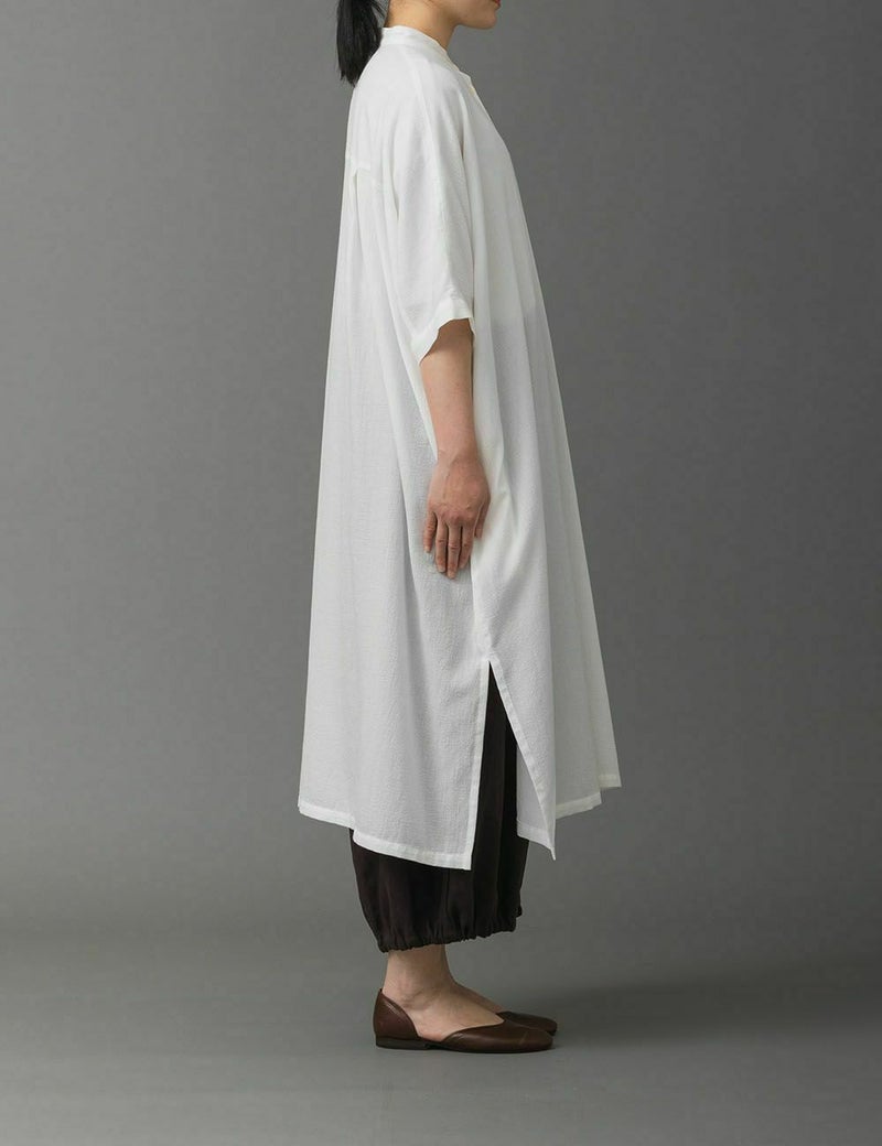 たっぷりしたシルエットを、風が通り抜けていくようなバンドカラーの前開きワンピース。プレーンなスタイルながら、格子状の織柄がひと味違うこだわりを感じさせます。前を開けて羽織もののように着てもしゃれています。