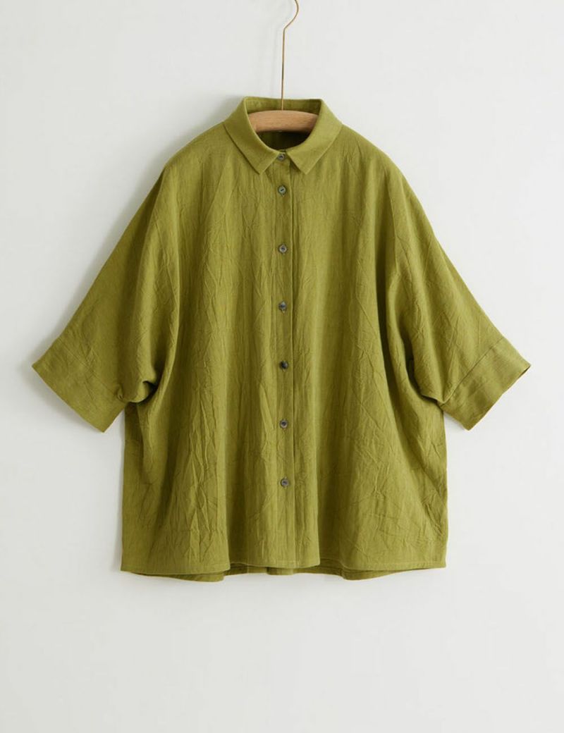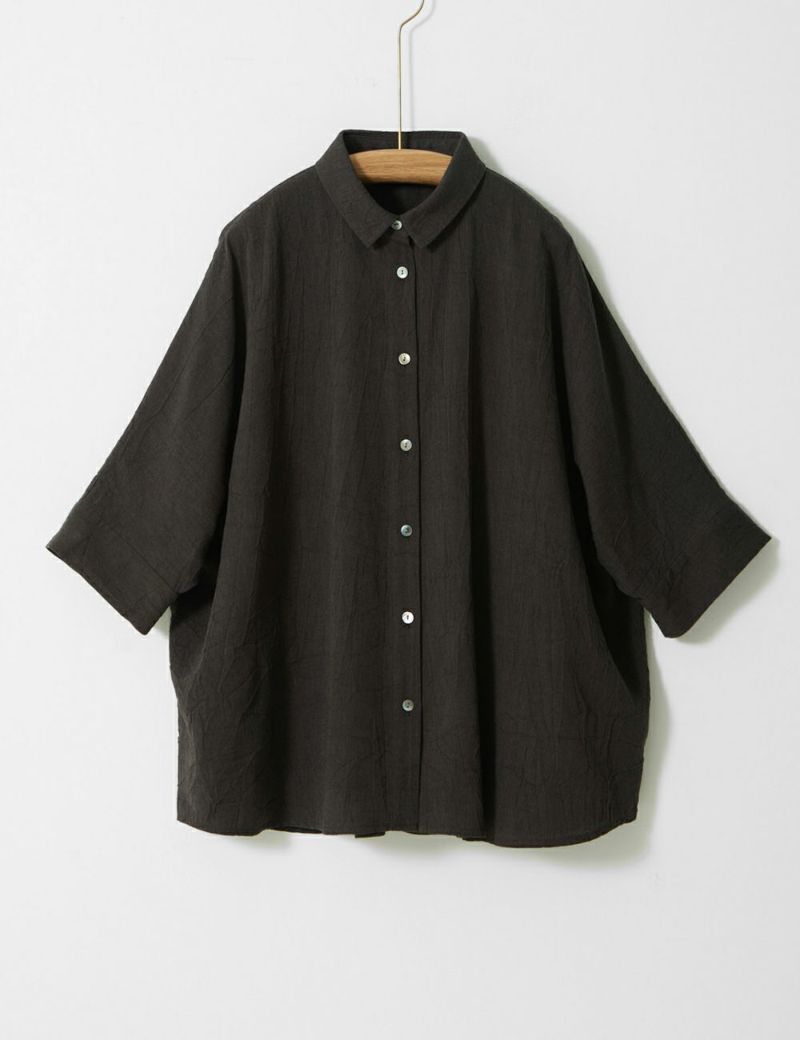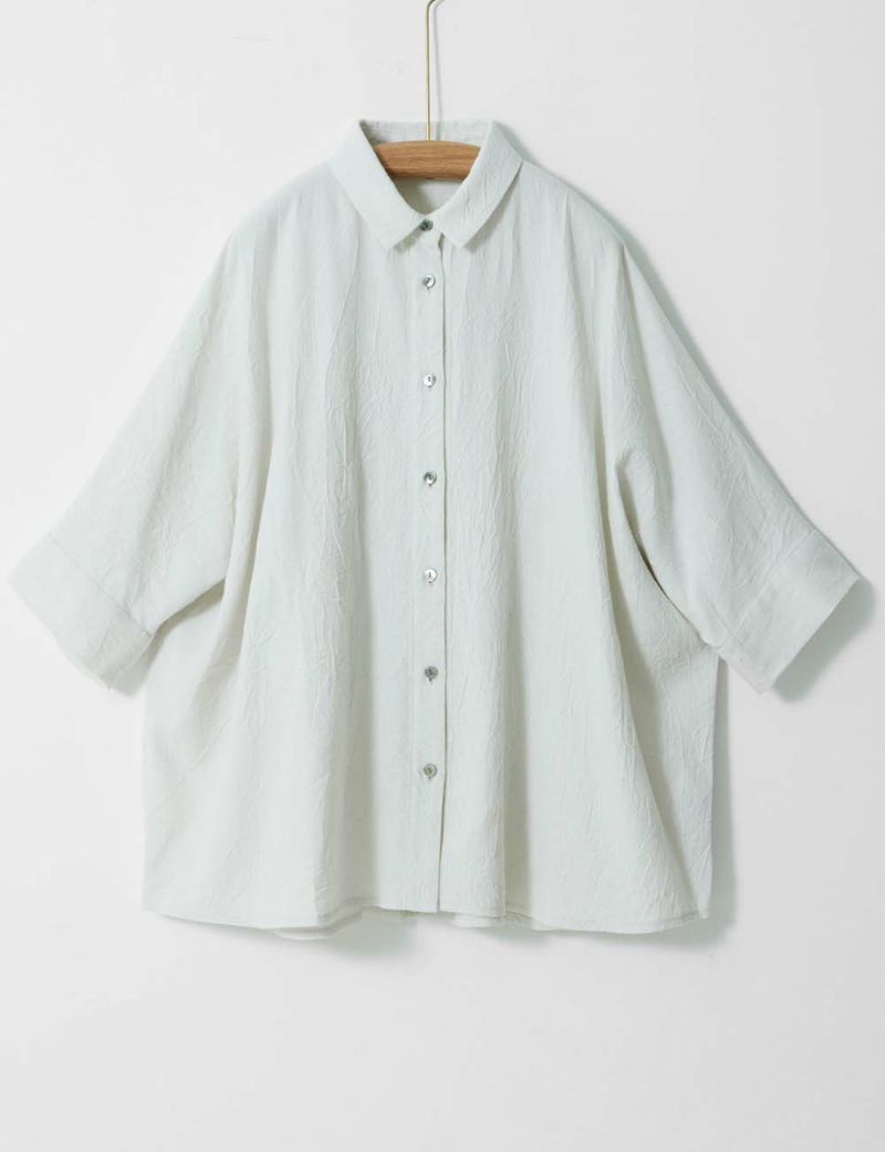 シワの表情が肌にくっつきにくく涼しい着心地のブラウスです。ゆったりとしたドルマンスリーブのワイドなシルエットは、襟と袖口でキチンと引き締めてくれます。