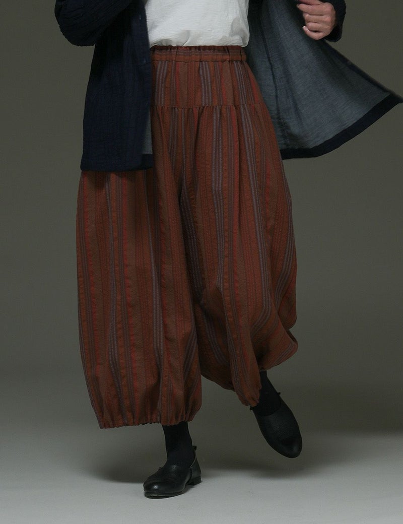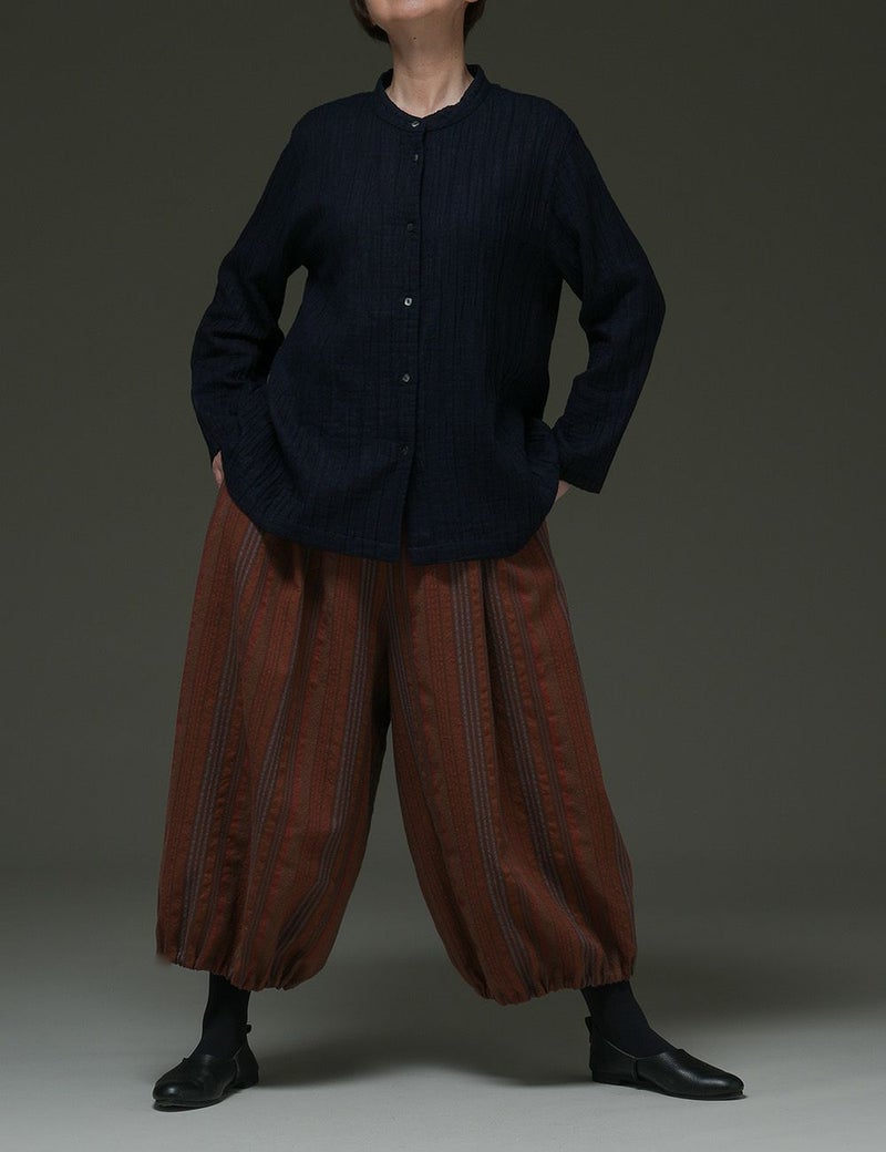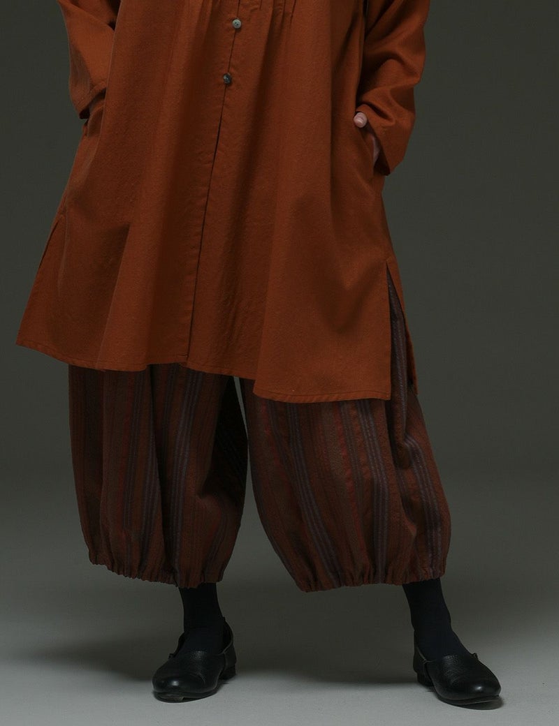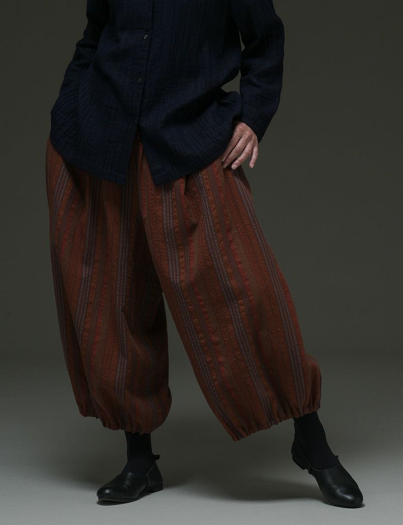 渋い色味の縞柄生地で仕立てた、ボリューミーなバルーンパンツ。はっと人目を惹きつける個性があり、着こなしの主役にうってつけ。体型悩みを隠して、着姿に自信を与えてくれそうです。背の高い方におすすめのMトールサイズもラインナップに加わりました。