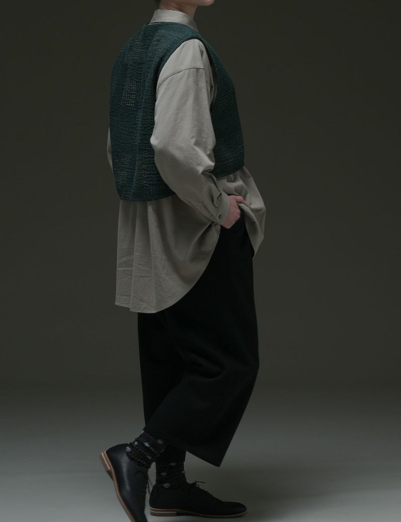 ふっくらあたたかな刺子調ジャガード織生地で仕立てたショートベスト。面積は小さくても存在感は抜群で、シンプルなブラウスやニット、ワンピースなどに重ねるだけで、粋な大人の遊び心を感じさせるスタイリングが完成します。