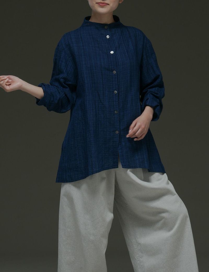 ブラウスとジャケットを足して2で割ったような、使い勝手のいい形が人気の定番「吾亦紅(われもこう)」を、繊細な藍の雨絣生地でつくりました。綿麻の風合いもさらりと心地よく、ちょうどいいきちんと感で季節の変わり目を美しく彩ります。