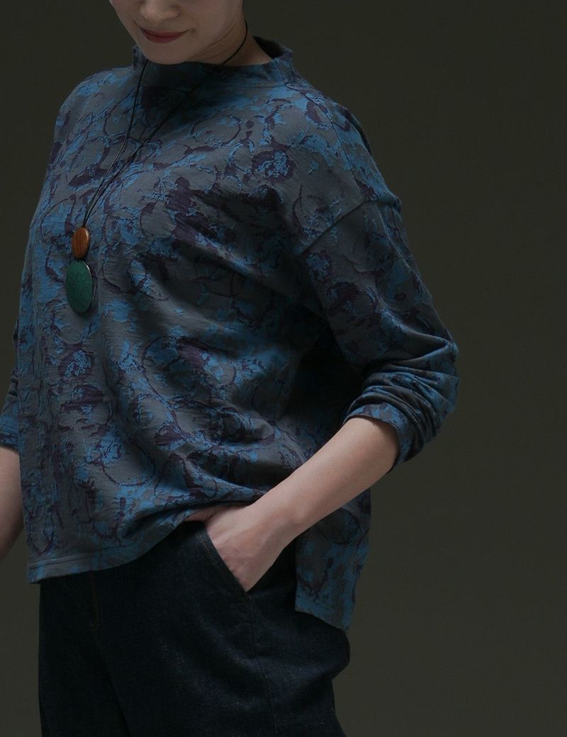 少し立ち上がったボートネックがポイントの、シンプルな長袖カットソー。繊細でなめらかな糸を使用したハイゲージのニット生地は、綿とウールがそれぞれに違う表情を描き出して、味わい豊か。抽象画のような美しさを、コーディネートの主役としてお楽しみください。