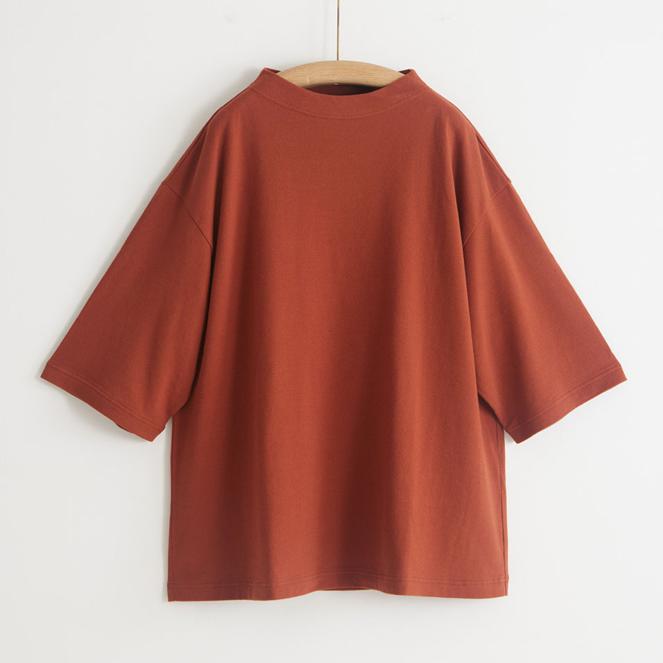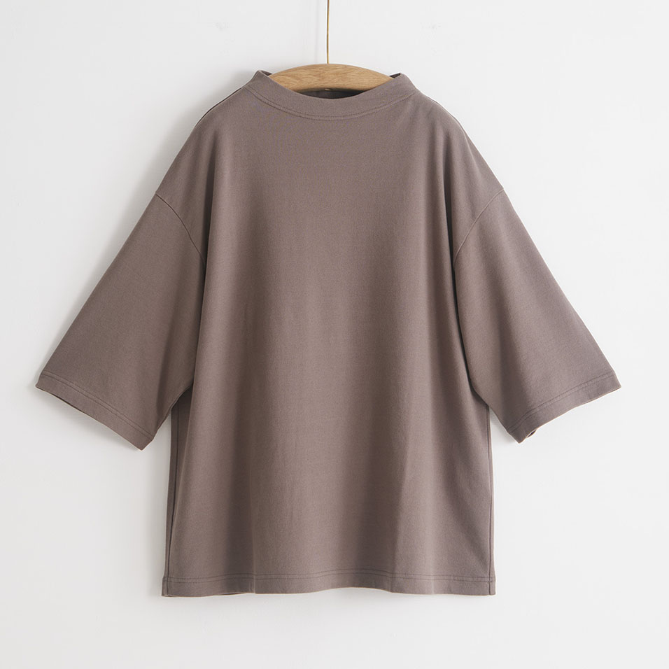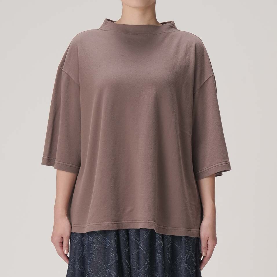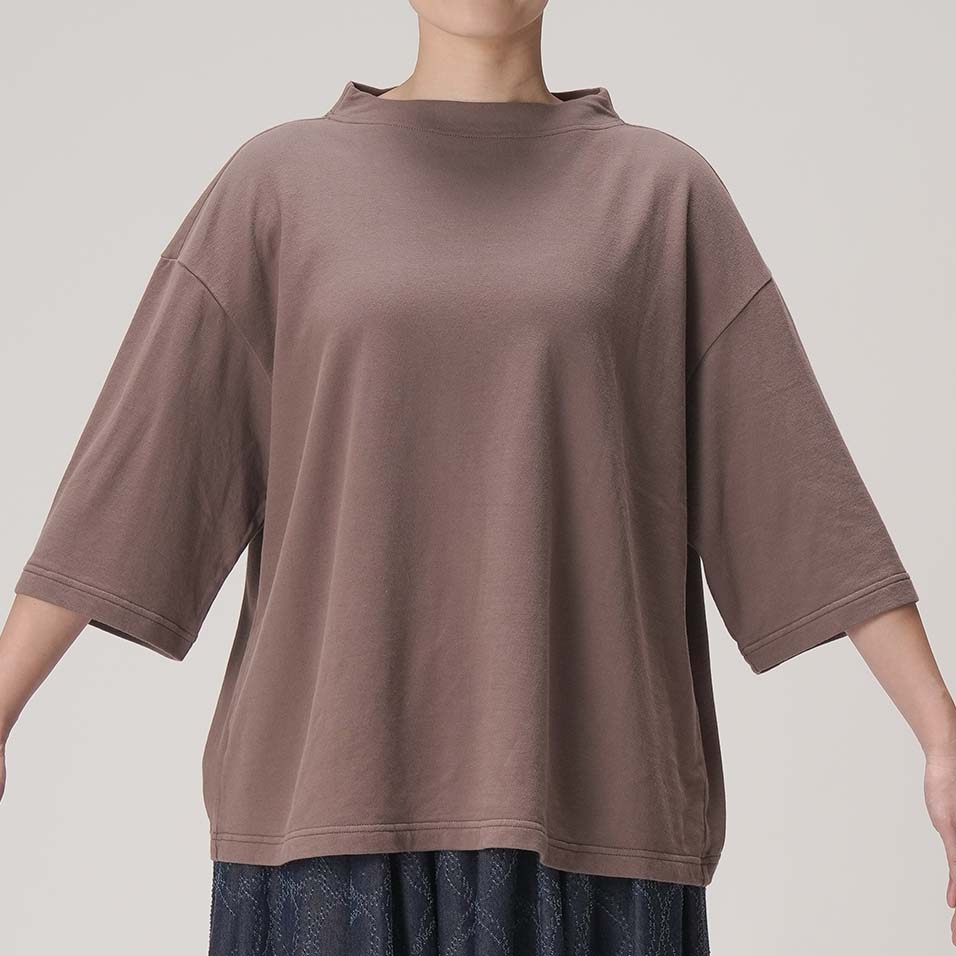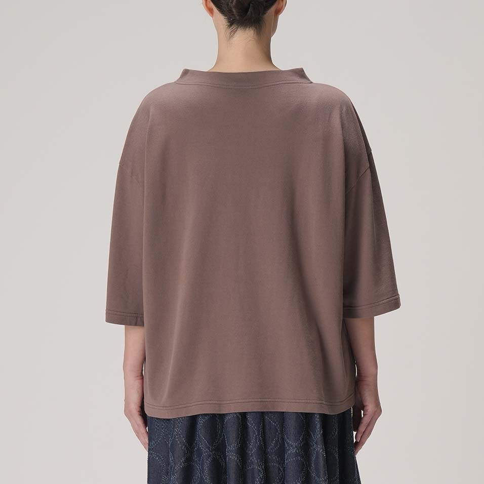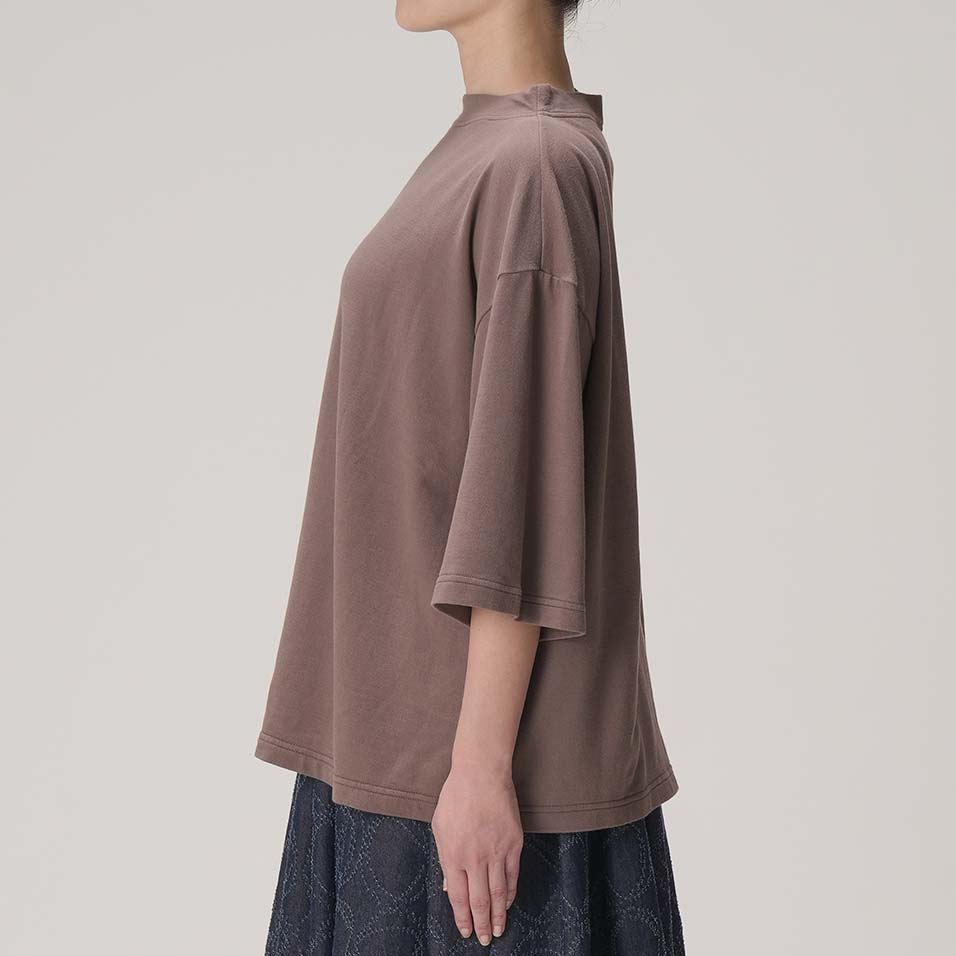 やや立ち上がりのある襟元と、ひじまで隠れる袖丈が、着こなしに豊かな表情を与えてくれるプルオーバー。さらりとした裏毛生地と、植物からもらったシックな色は、晩夏から秋へと移りゆく季節にぴったり。着るものに迷う時期に重宝する一着です。
