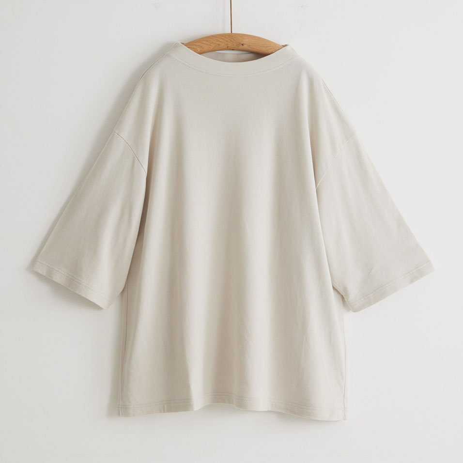 強い撚りをほどこした細番手の糸を、ややシャリ感のある裏毛のカットソー生地に編み上げました。スムースでなめらかな表面と、さらりとした肌面のバランスもほどよく、ありきたりなTシャツとはひと味違う上質さが特長。晩夏から秋本番まで心地よく着られます。