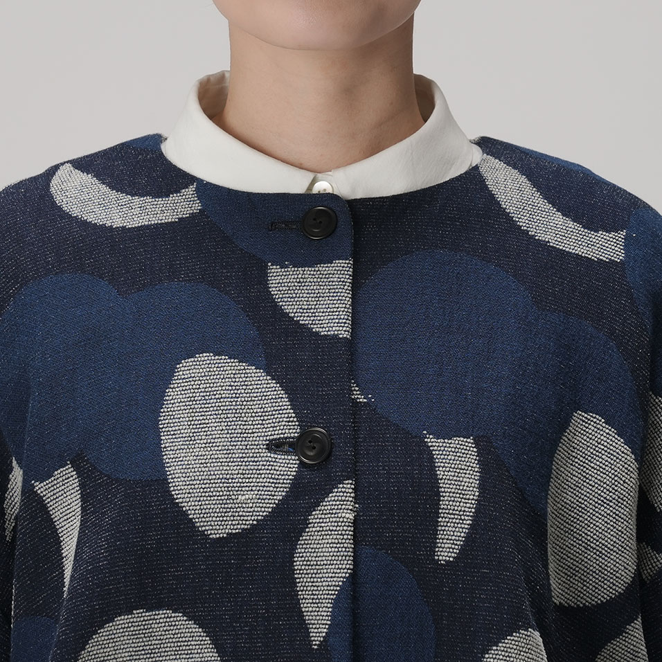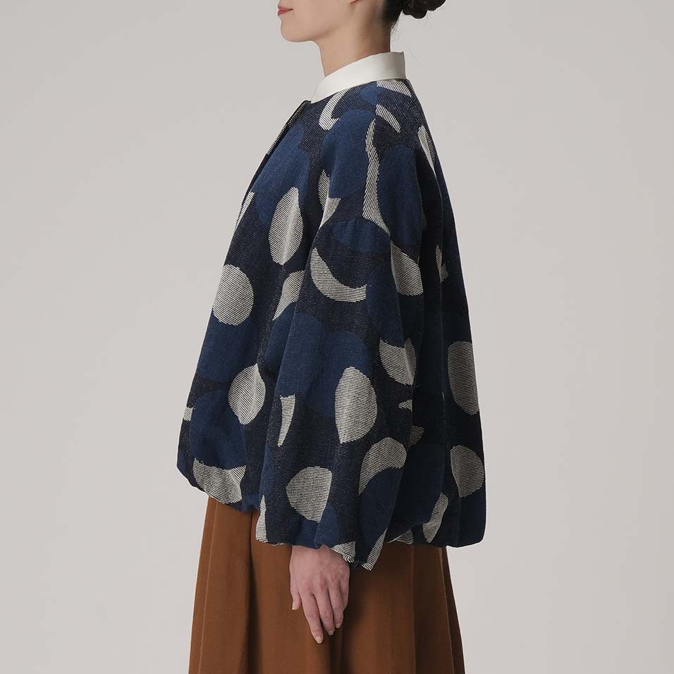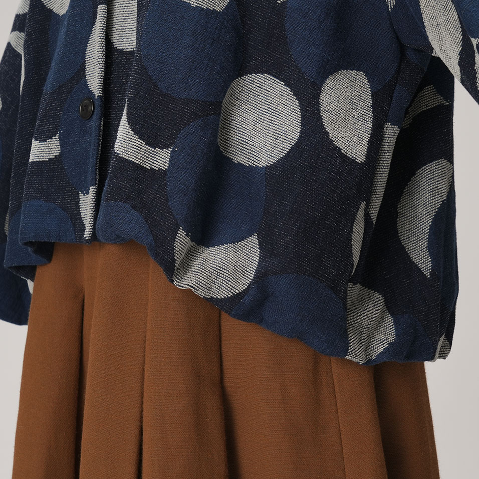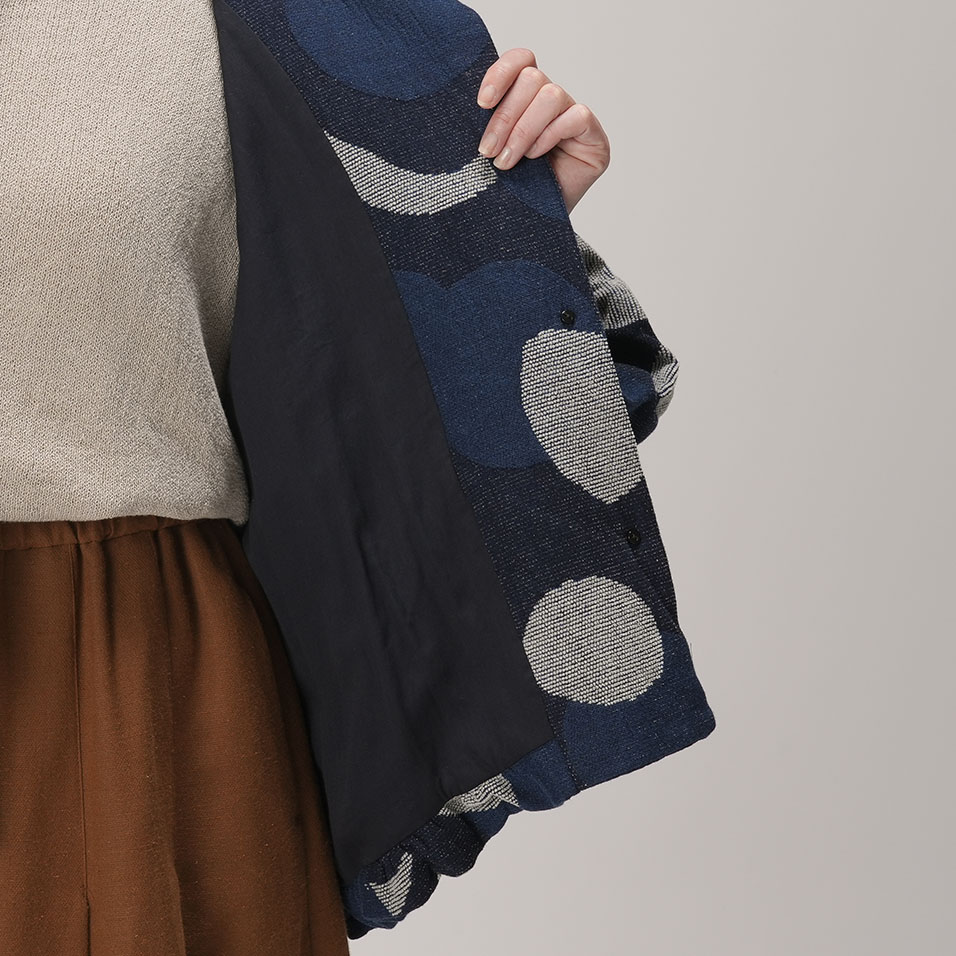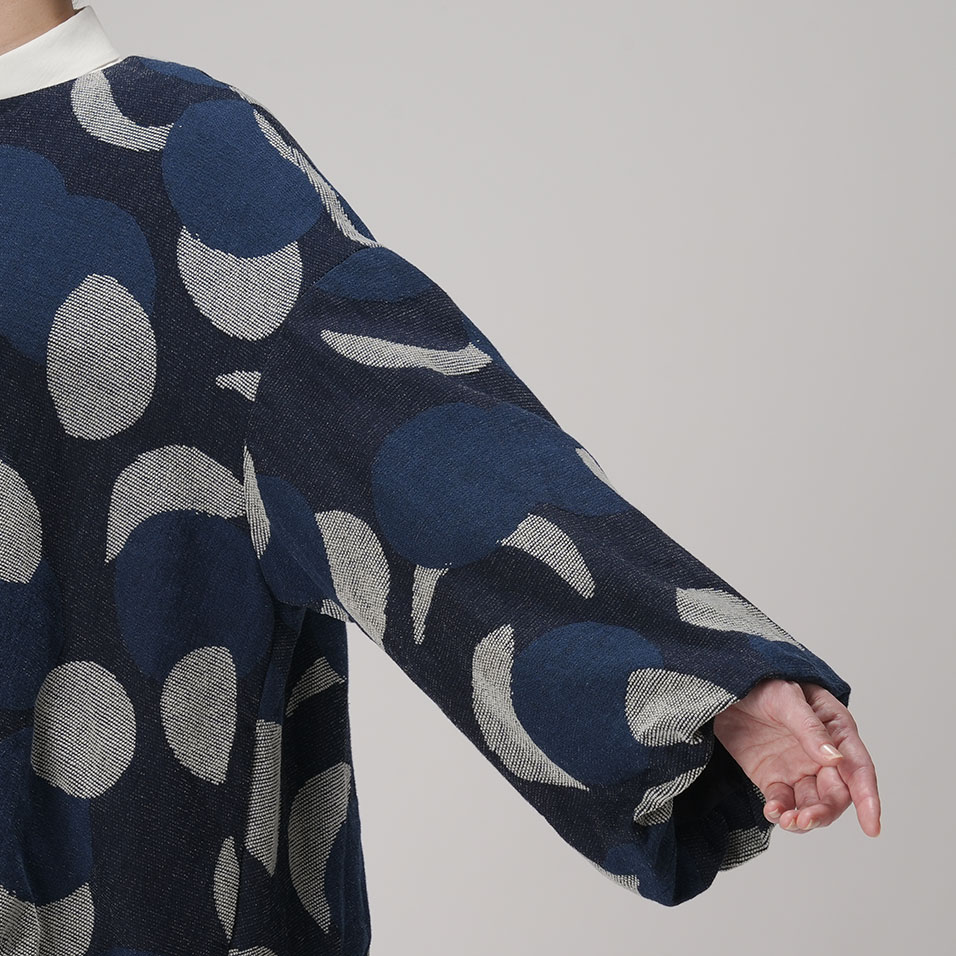 新月から満月まで、移りゆく月の表情を表現した、ちょっと贅沢なジャガード織。毛羽のある綿モール糸のふくらみを生かしつつ、重くならないよう糸量の調整や織り方に工夫を重ね、何度も試作を繰り返して完成させました。手の込んだ織柄とインディゴの深い色合いが、着る人を存在感豊かに引き立てます。