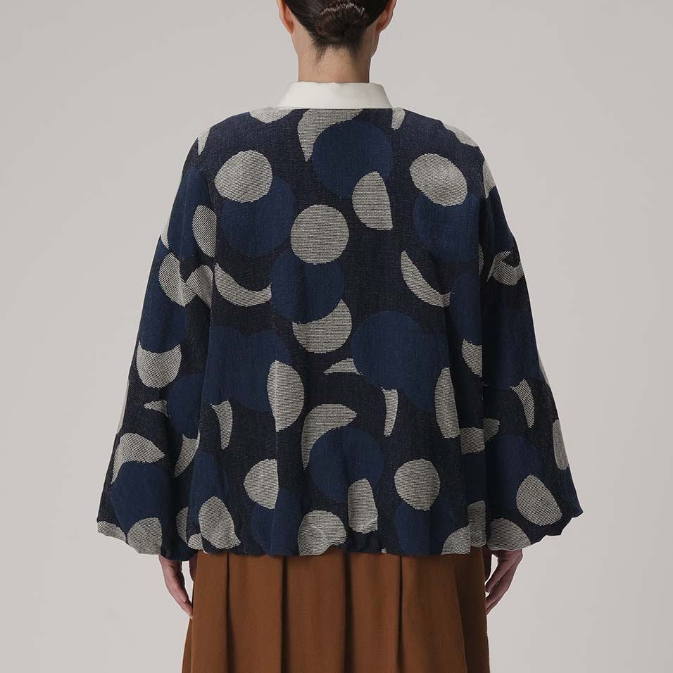 月の満ち欠けを描き出す綿モール糸の表情と、ボリューム豊かに広がるバルーンスリーブが印象的な、総裏地付きのショートジャケット。インディゴの色合いを生かしたファブリックを贅沢に使って、可愛らしさと大人っぽさが同居する、唯一無二の個性を表現します。