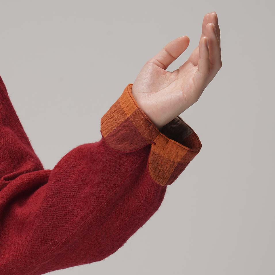 表にあたたかなウール、裏に肌ざわりのやさしい綿を織りなした二重織。織り上がった生地に縮絨(しゅくじゅう)加工をほどこしてウールを縮ませることで、裏面にはポコポコとした凹凸を持たせています。この凹凸感が空気を含むため、薄手で軽いのに着心地あたたか。裏面の大柄チェックも小粋で、着こなしの楽しみを広げます。