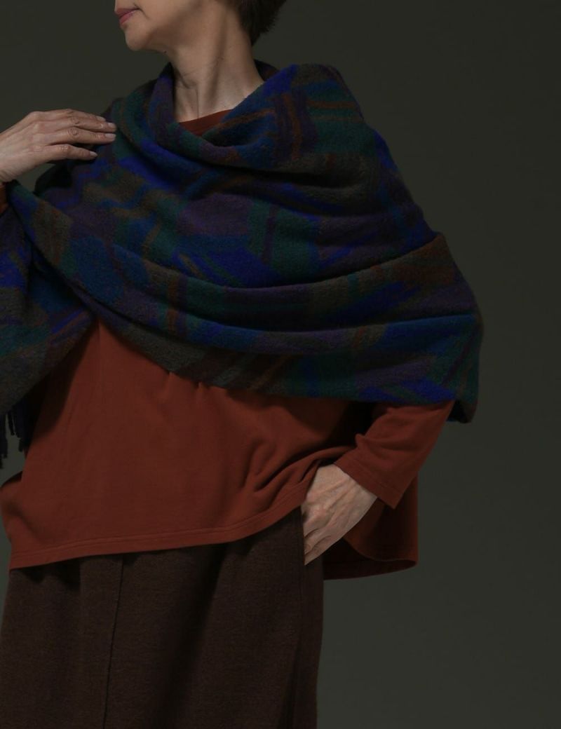 米沢市の老舗・青文テキスタイルさんとつくりあげた、ふんわり軽いパイルジャガードをストールに。寒い冬の朝に地表を覆う氷をイメージした柄が、アーティスティックな印象です。綿とウールを絶妙に組み合わせた素材感は、デリケートな肌にもスムーズ。