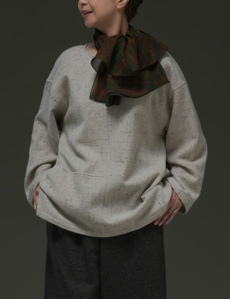 静岡の福田織物さんとつくり上げた、肌にやさしい最高級スーピマコットンの薄手生地に、すすきをイメージしたパターンを浮かび上がらせました。墨と筆で点描したタッチが微妙なゆらぎを醸し出して、シンプルなツートンカラーでも、きらりと個性が光ります。