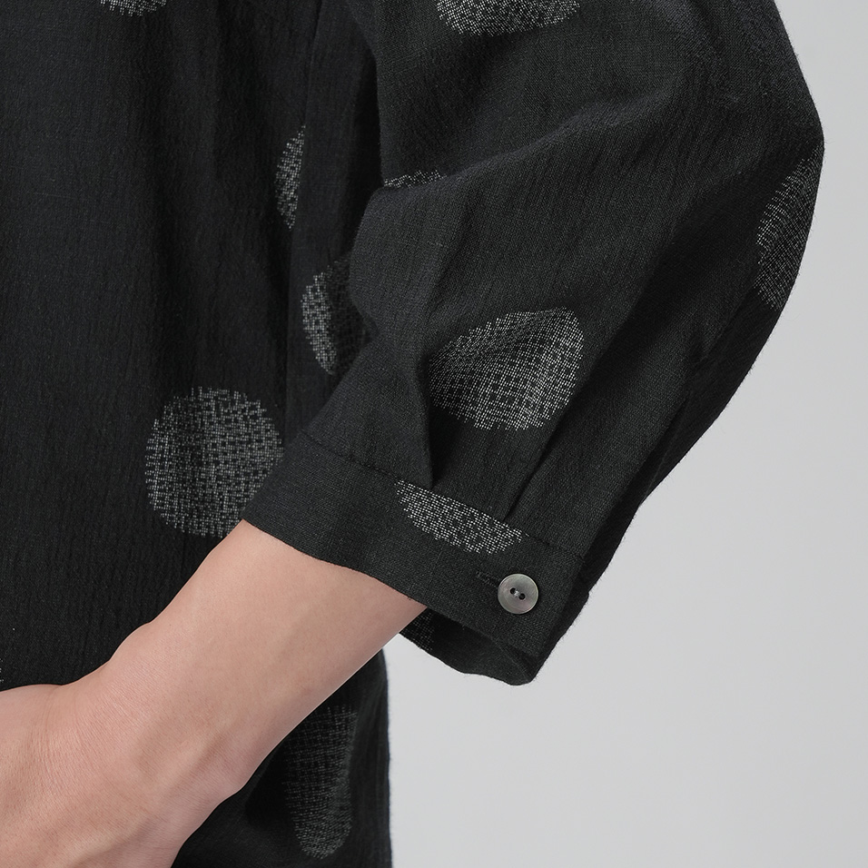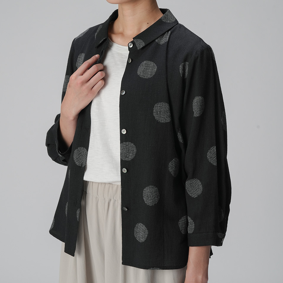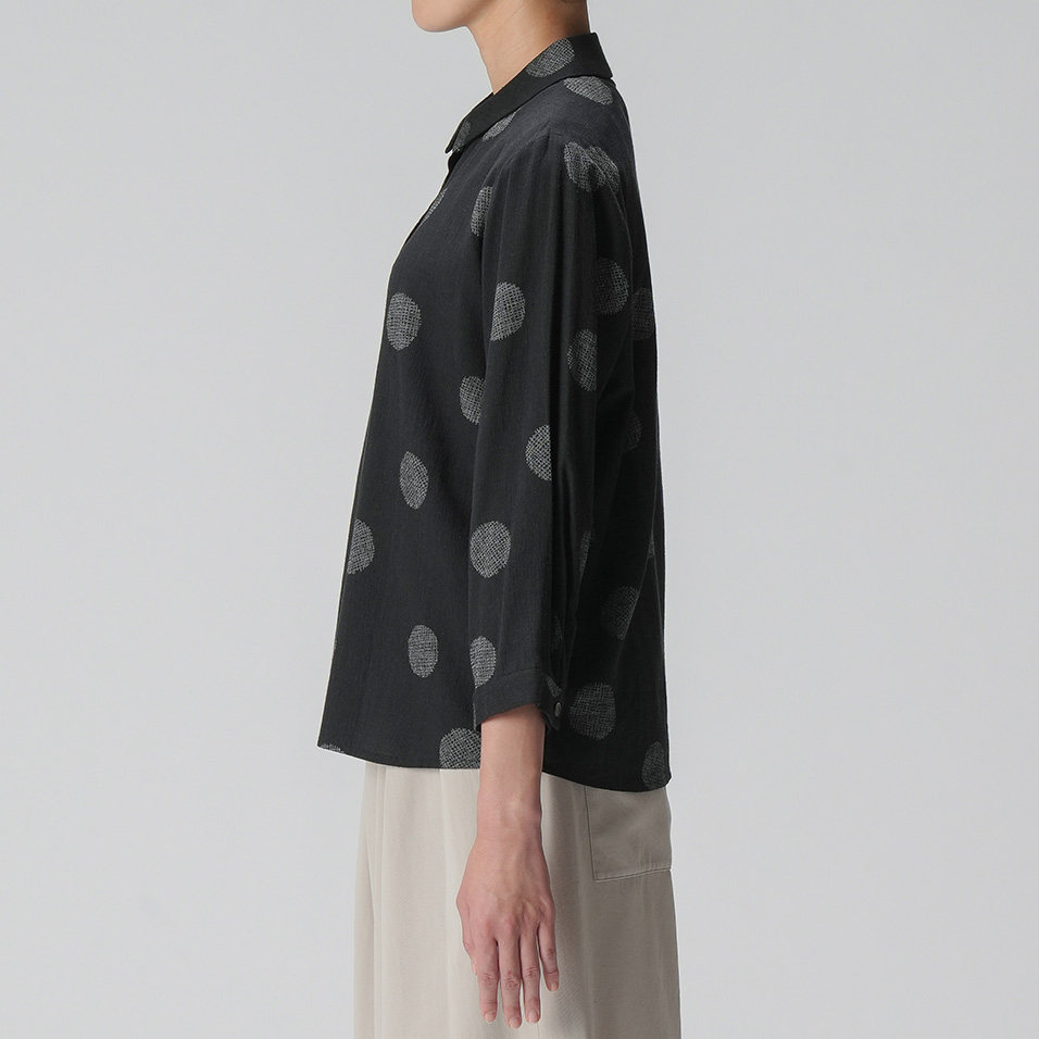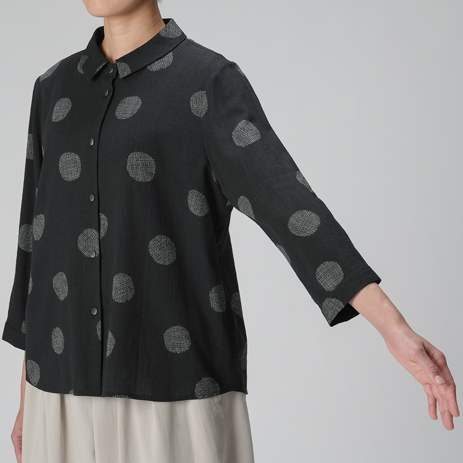 しなやかな涼感素材に、「マンガン絣」による繊細な柄が映えるブラウス。小さめの襟や手首がのぞく袖丈に、上品な可憐さが漂います。オーバーブラウスとして着るのはもちろん、裾をボトムにインしたり、前を開けて軽く羽織ったりと着方次第で表情も多彩に。