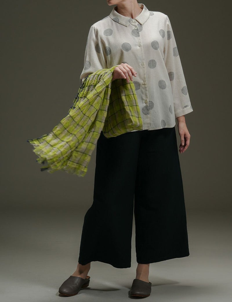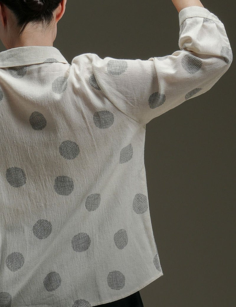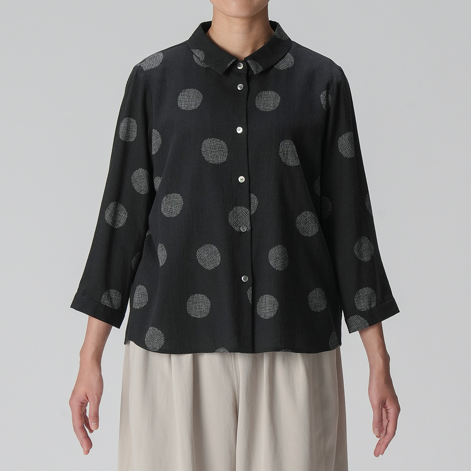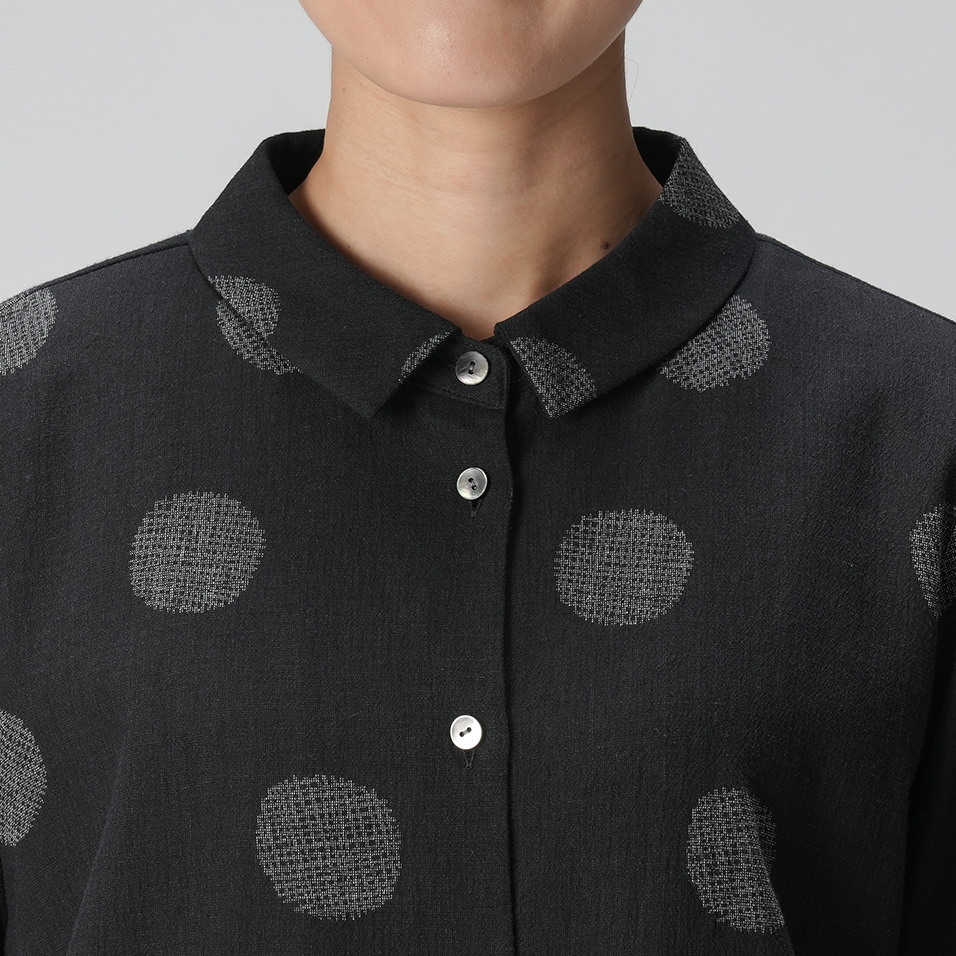 しなやかな涼感素材に、「マンガン絣」による繊細な柄が映えるブラウス。小さめの襟や手首がのぞく袖丈に、上品な可憐さが漂います。オーバーブラウスとして着るのはもちろん、裾をボトムにインしたり、前を開けて軽く羽織ったりと着方次第で表情も多彩に。