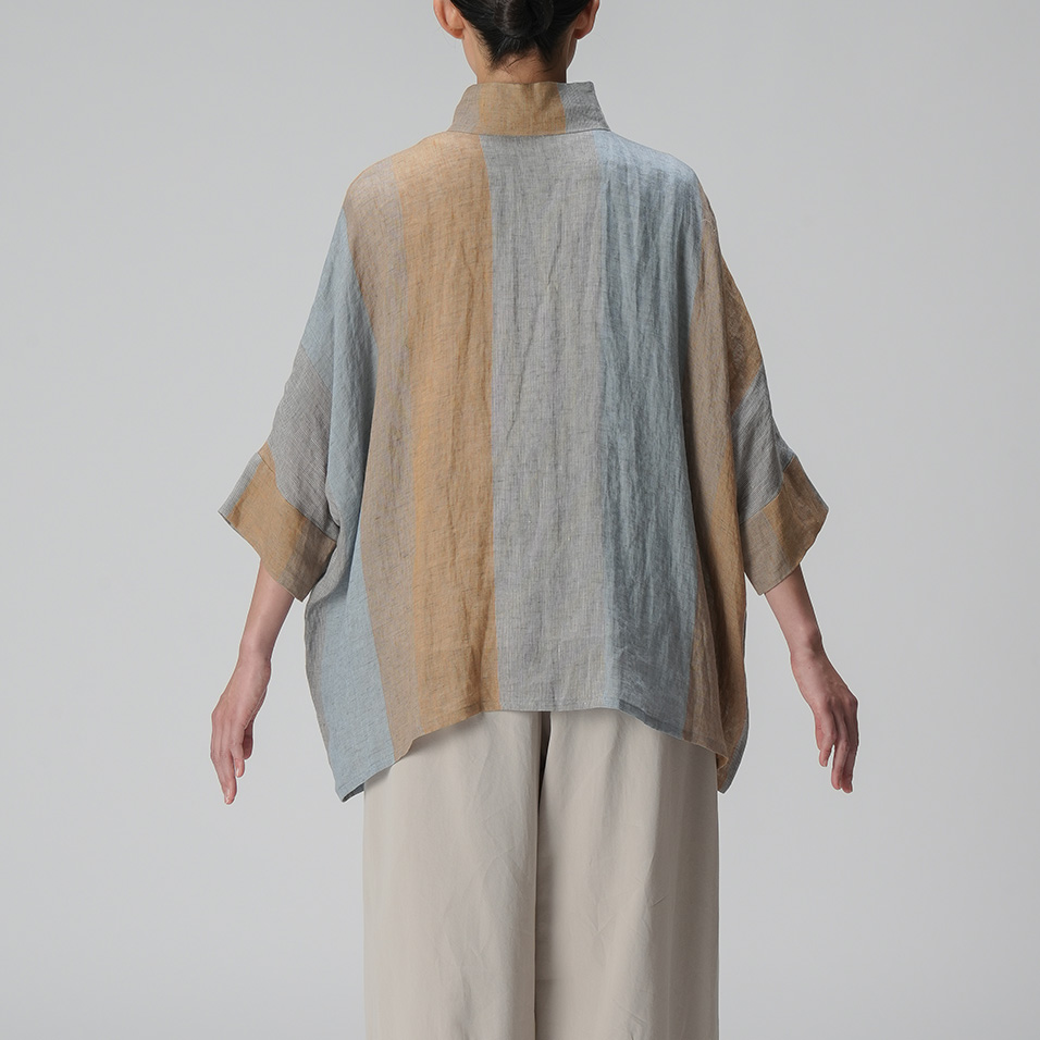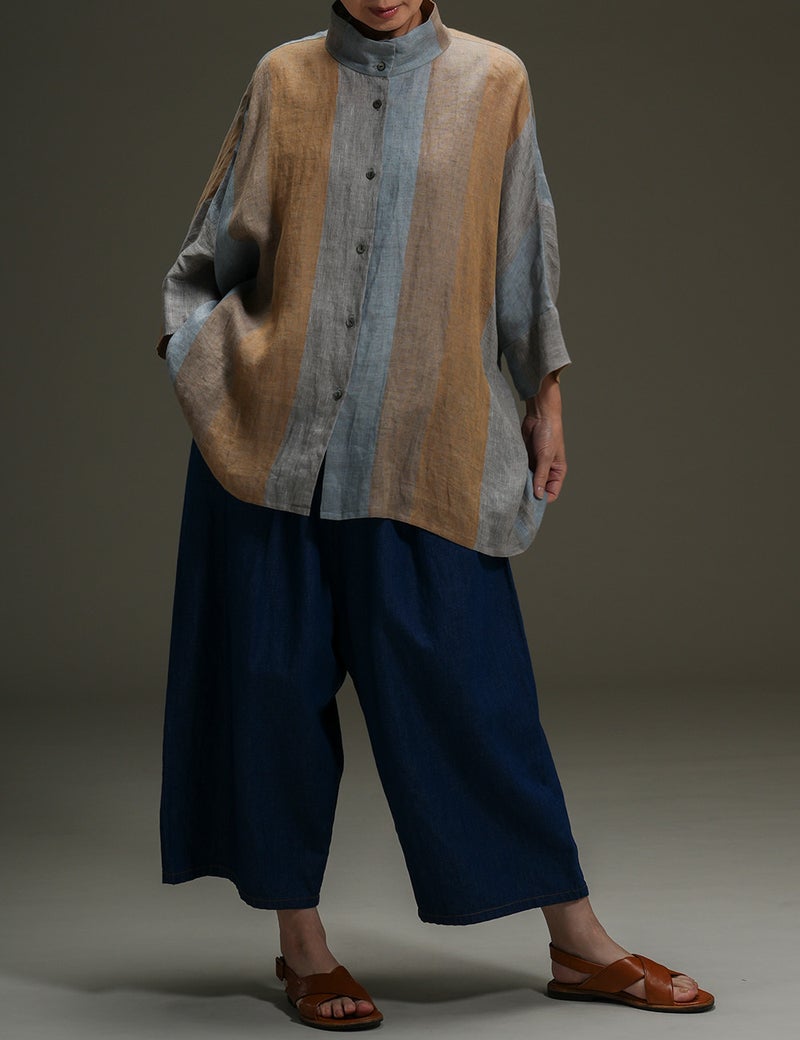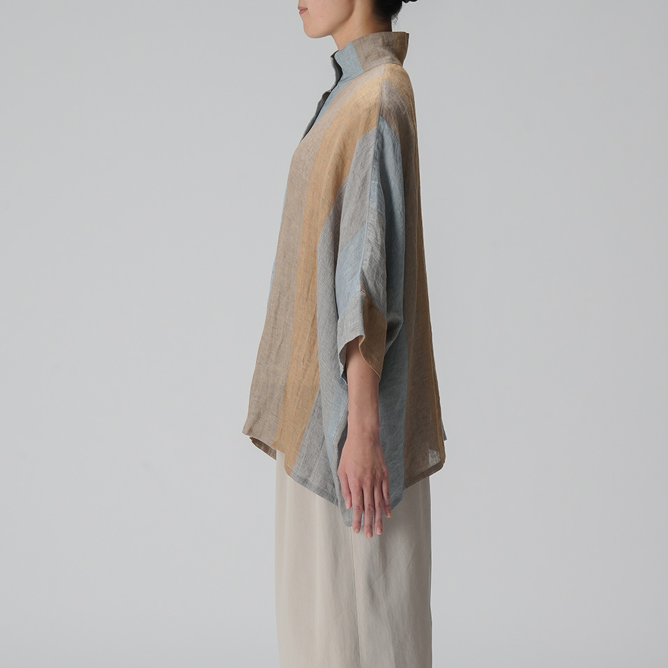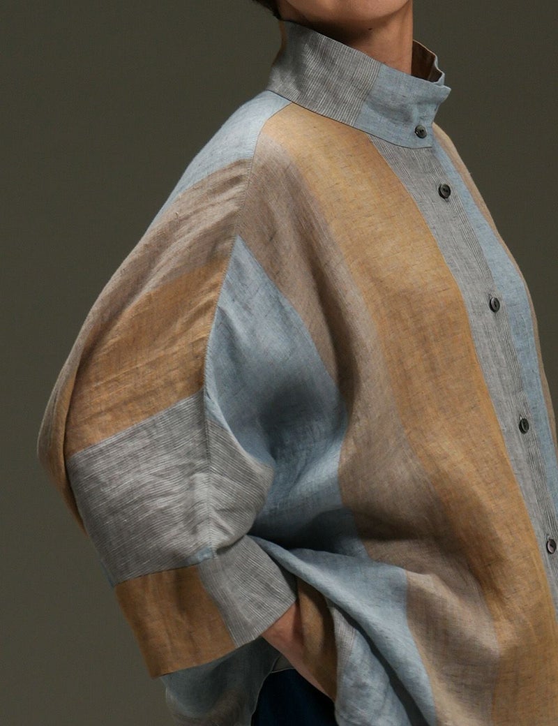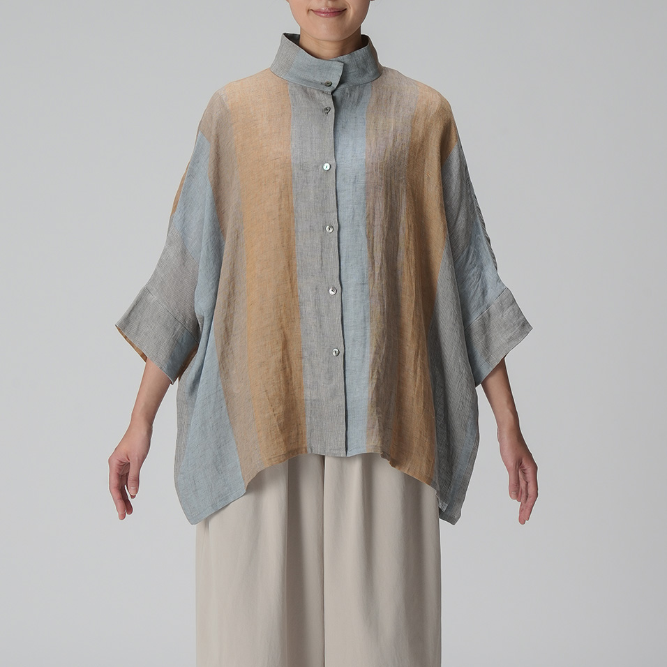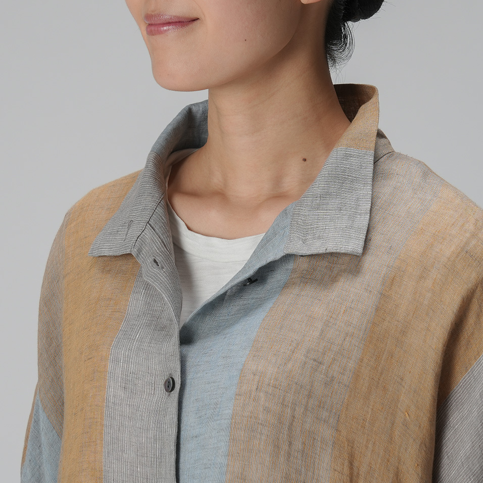 高めの襟や幅広のカフスなど、辛口のディテールをきかせた麻のワイドシルエットブラウス。近江生まれ「ルポワン染め」の糸を生かした艶やかな表情と、繊細なピンストライプを織り込んだ太い縦縞が、成熟した大人のおしゃれを感じさせます。