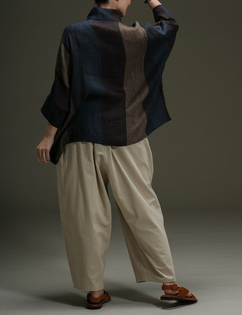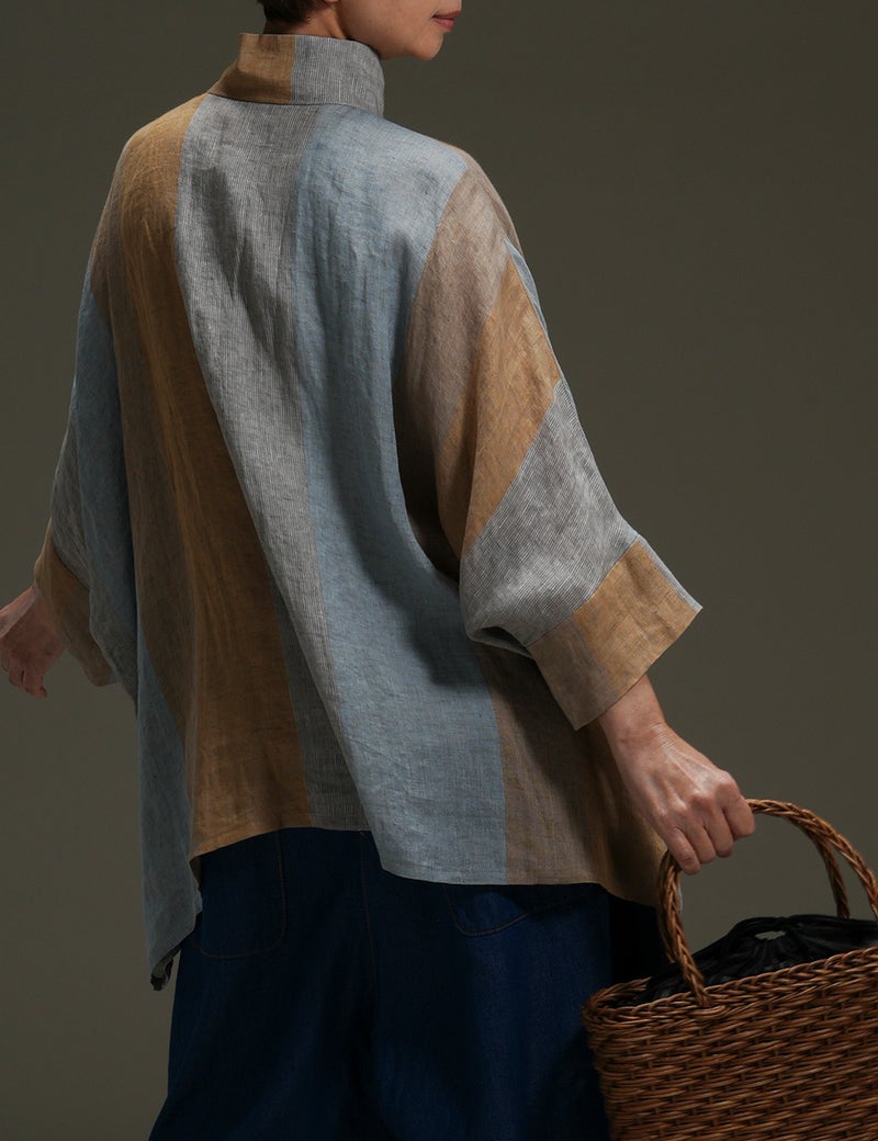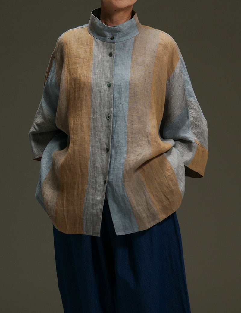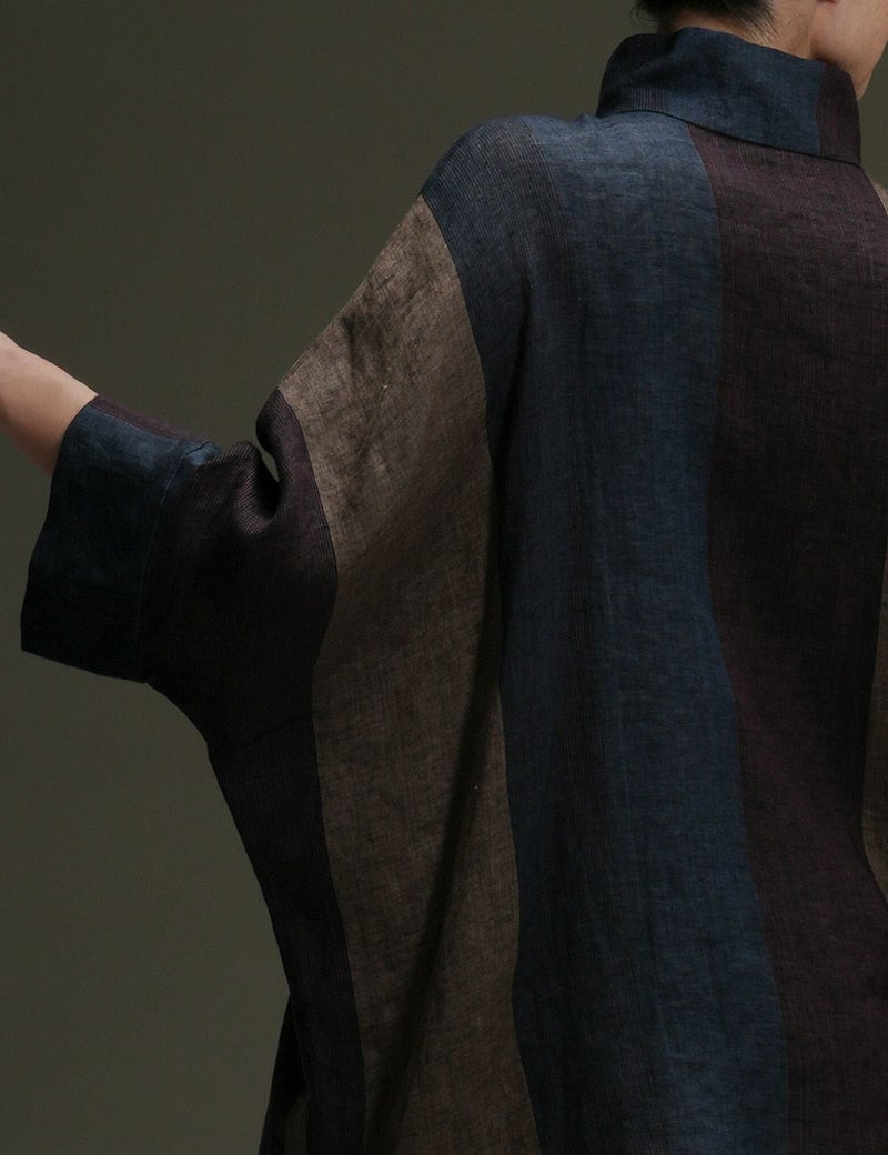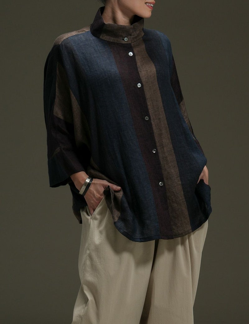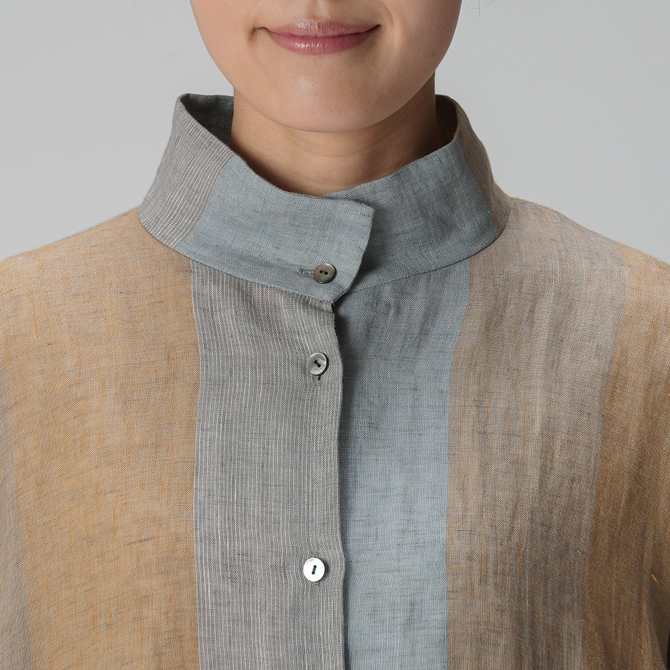 高めの襟や幅広のカフスなど、辛口のディテールをきかせた麻のワイドシルエットブラウス。近江生まれ「ルポワン染め」の糸を生かした艶やかな表情と、繊細なピンストライプを織り込んだ太い縦縞が、成熟した大人のおしゃれを感じさせます。