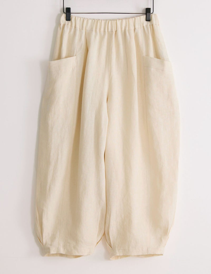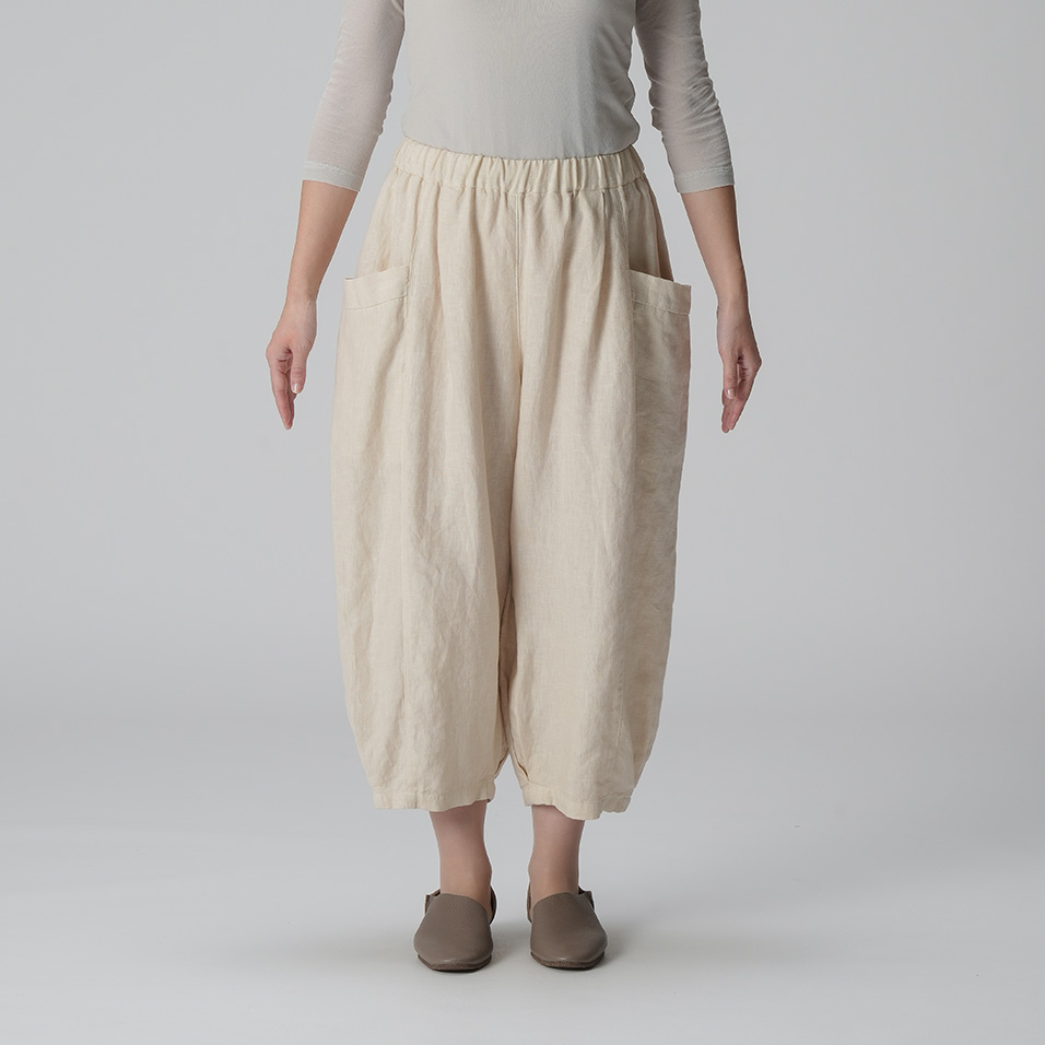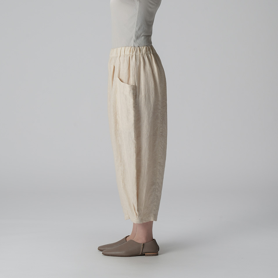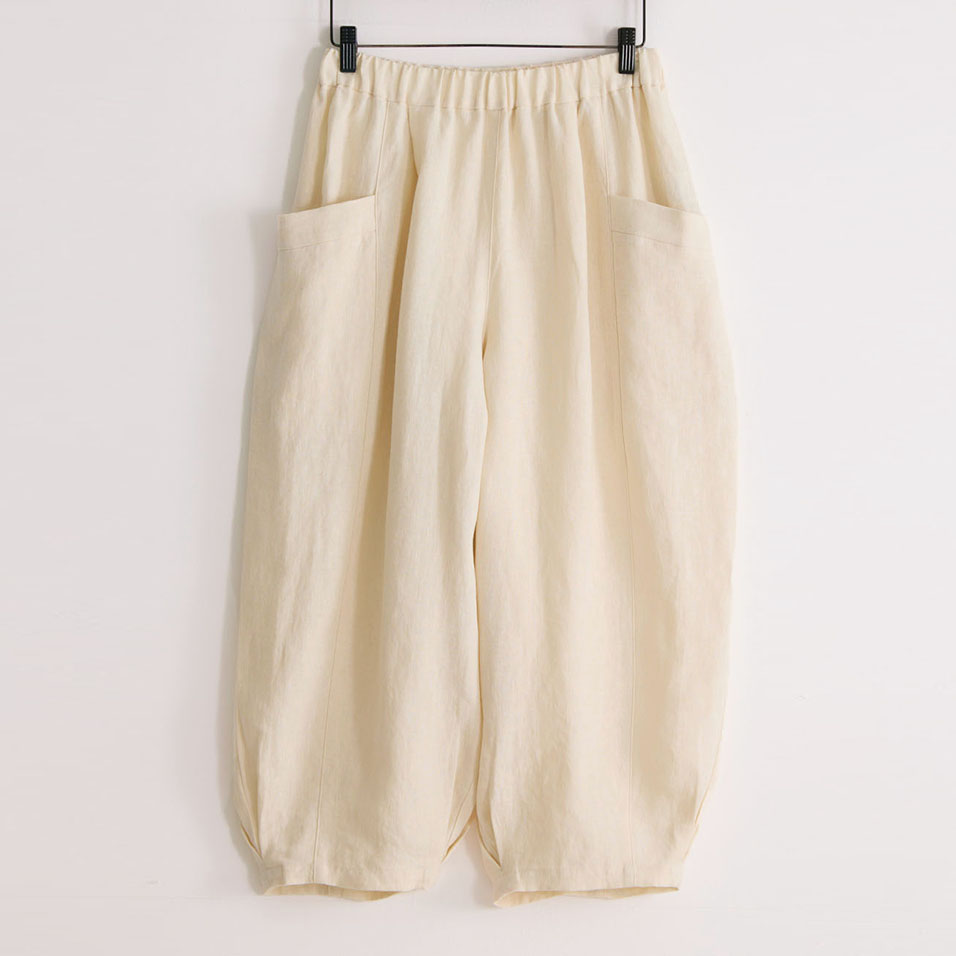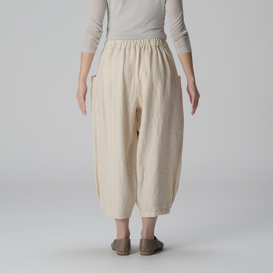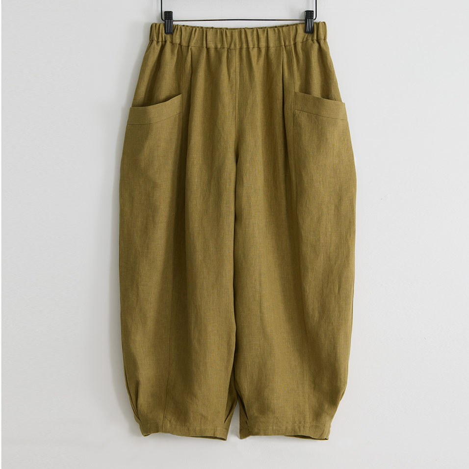 ほどよい肉厚感とやわらかな風合いが心地よいリネンのバルーンパンツ。足首の見えるクロップド丈や、縦に走る切り替え線+サイドポケットの効果で、体型悩みをカバーして、全身バランスをセンスよくまとめてくれます。自信を持って闊歩したくなる一着です。