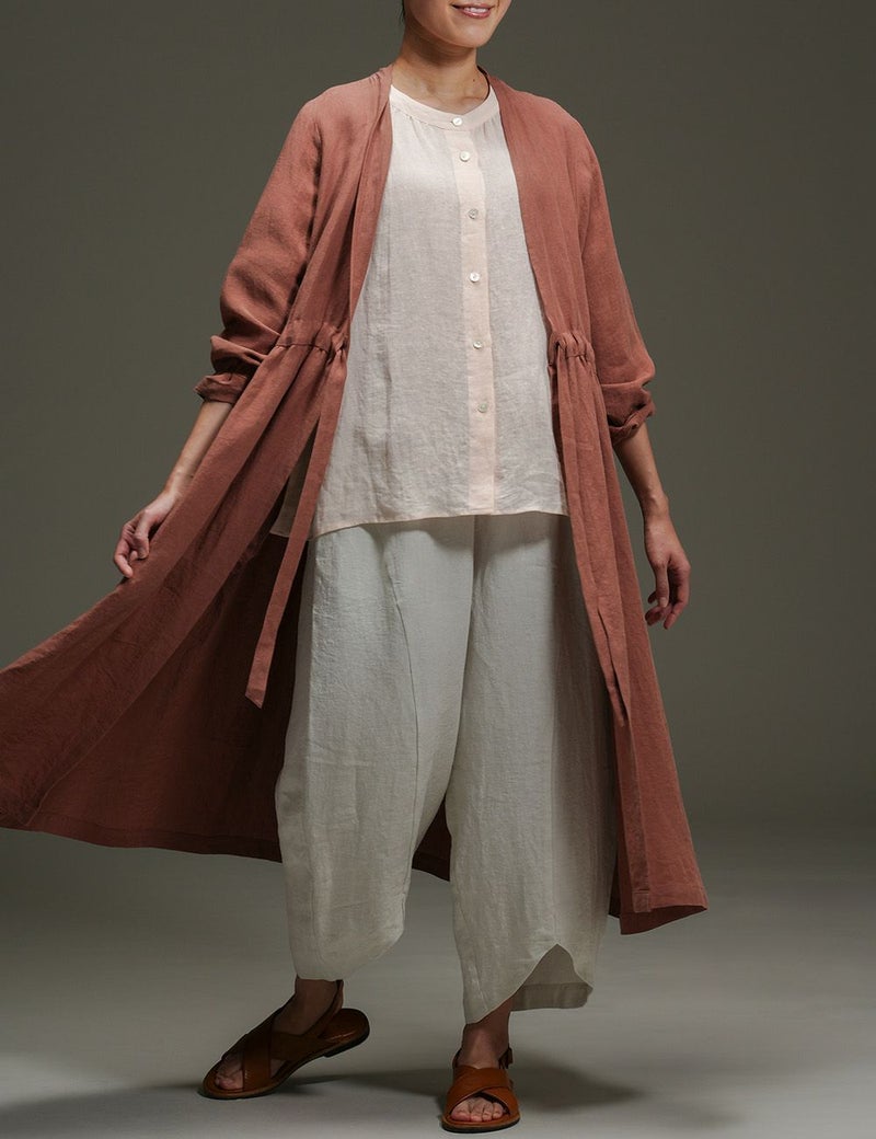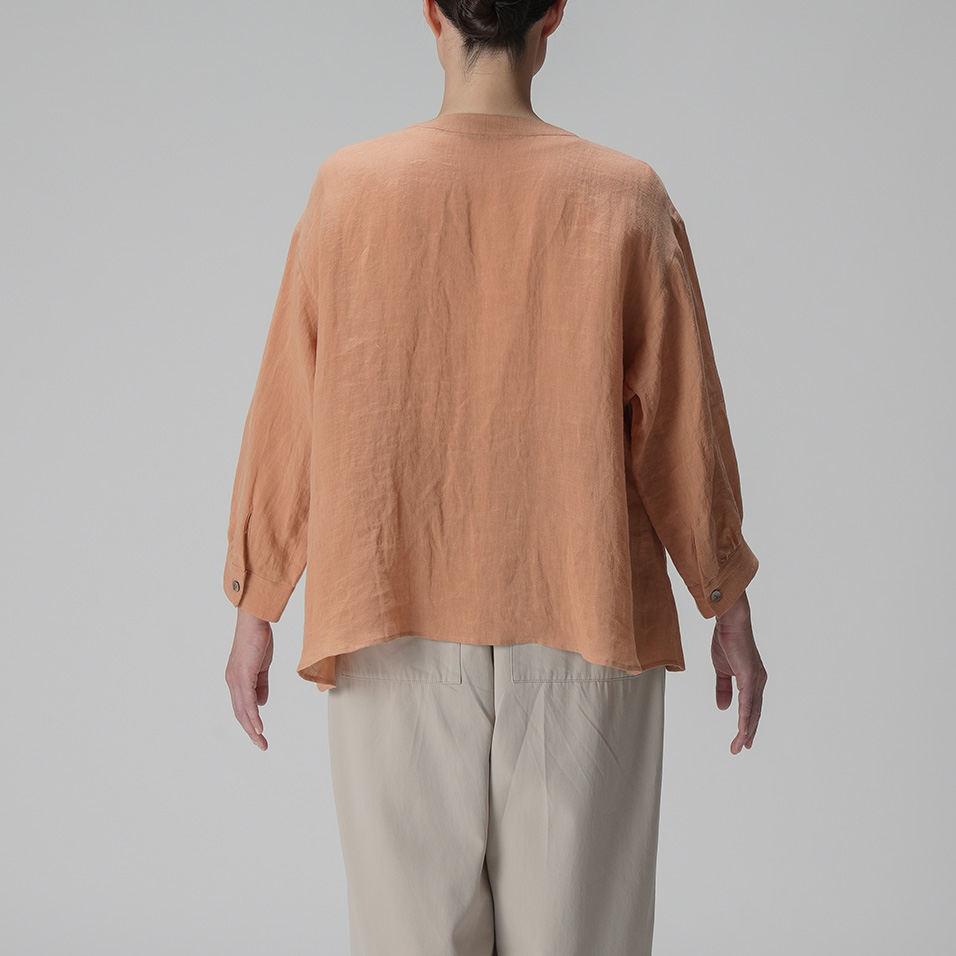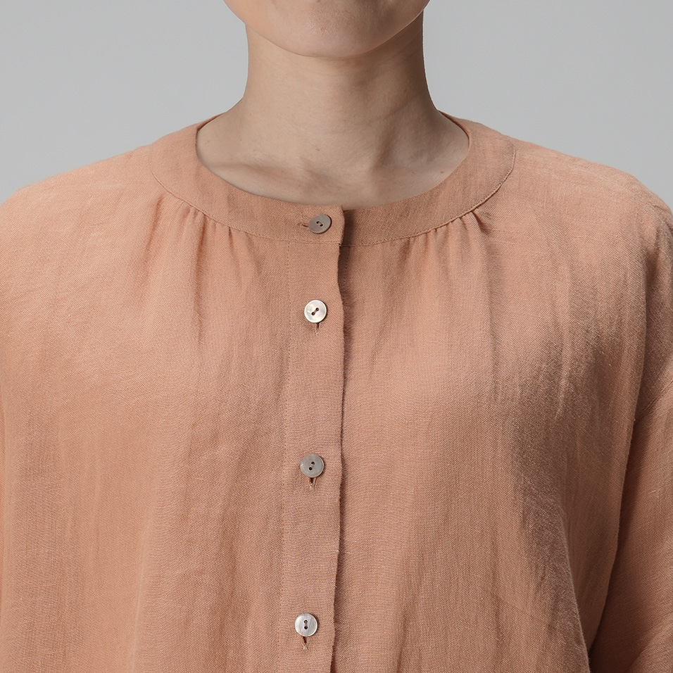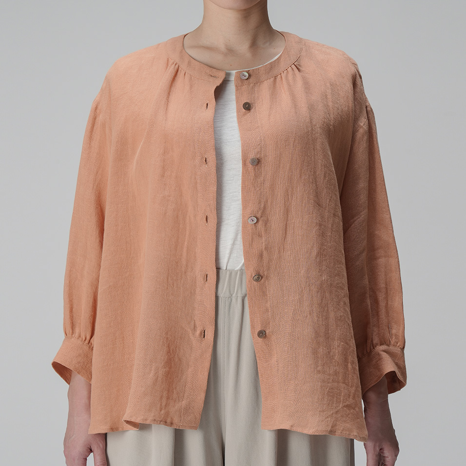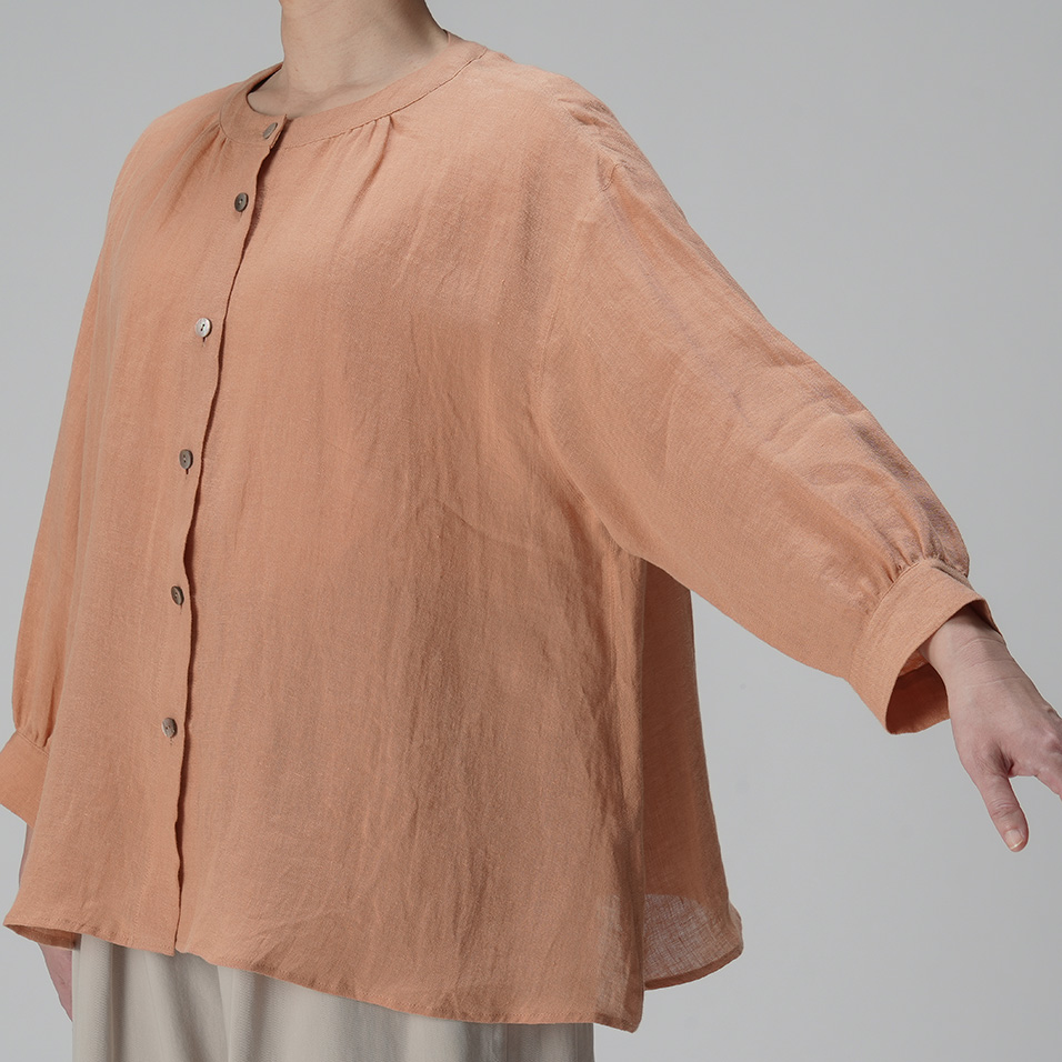 里山に春の訪れを告げる山桜。その枝などを集めて染め上げた、薄手リネンのバンドカラーブラウス。色の抽出方法の違いによって生じる色味の違いも楽しく、化学染料だけでは出せないたおやかな奥行き感に愛着が深まります。