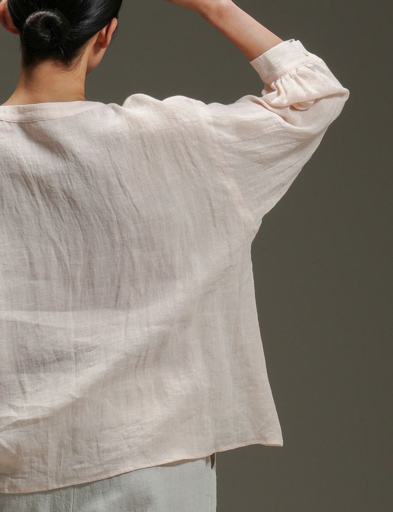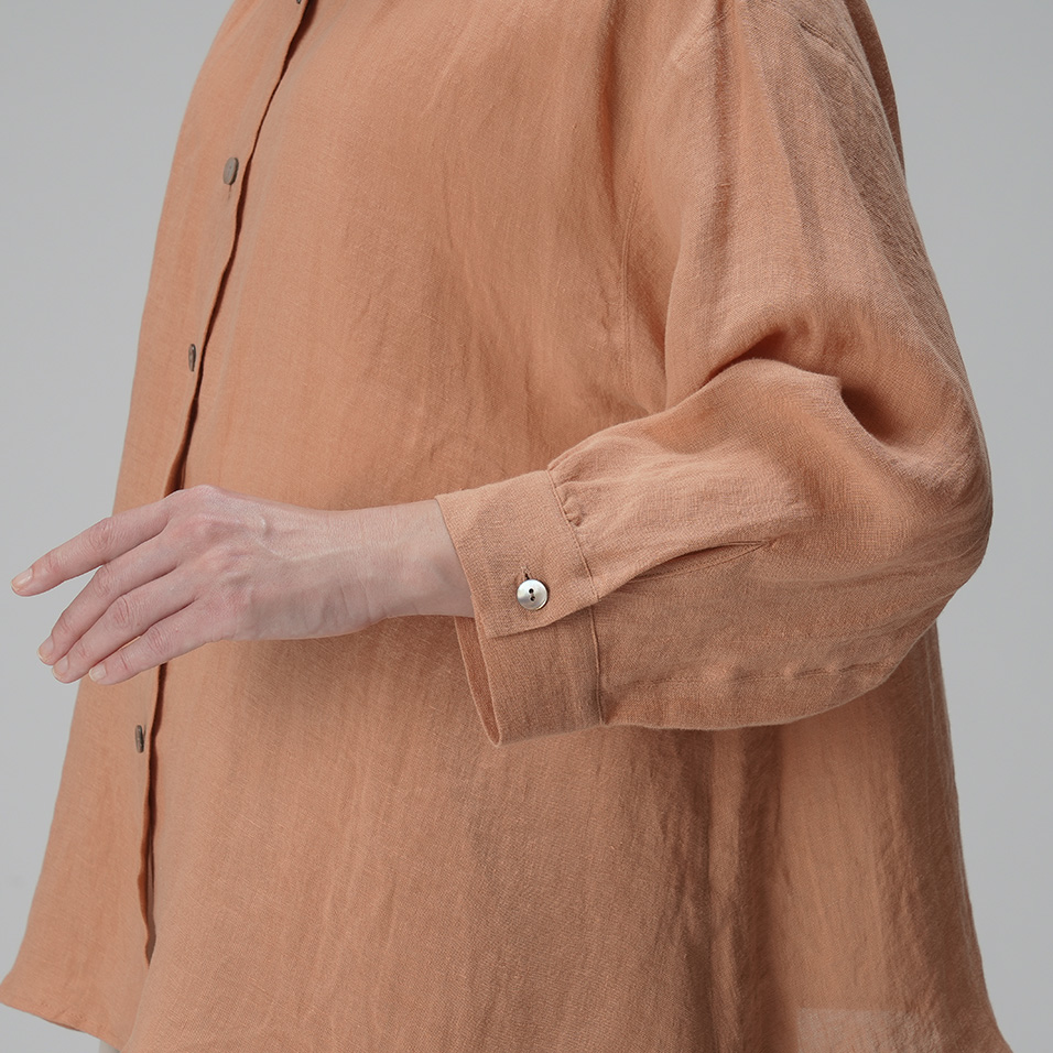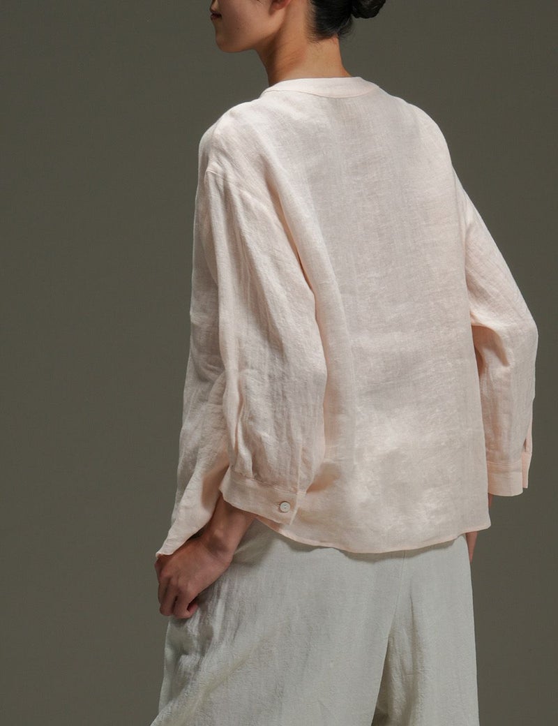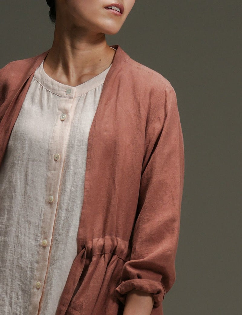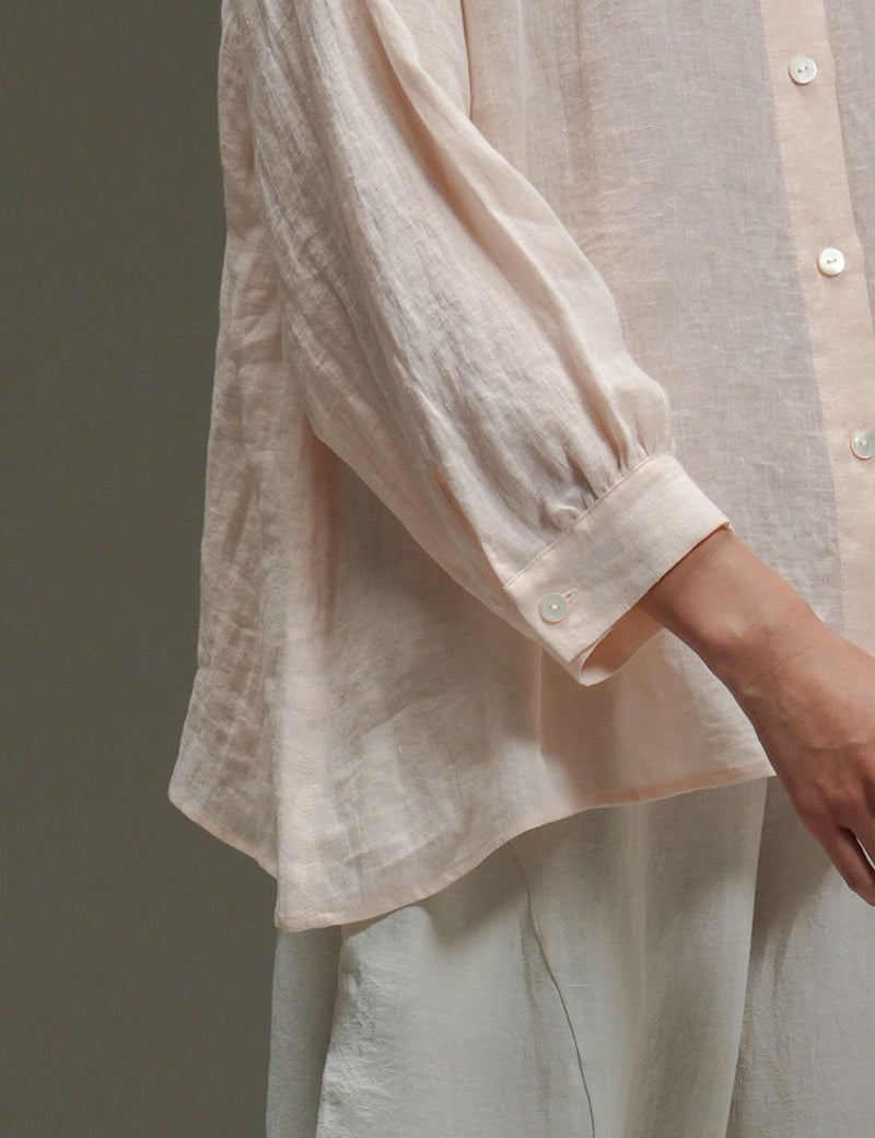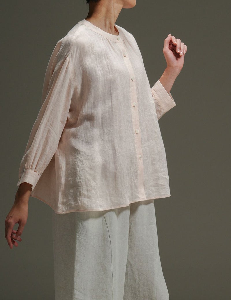 里山に春の訪れを告げる山桜。その枝などを集めて染め上げた、薄手リネンのバンドカラーブラウス。色の抽出方法の違いによって生じる色味の違いも楽しく、化学染料だけでは出せないたおやかな奥行き感に愛着が深まります。