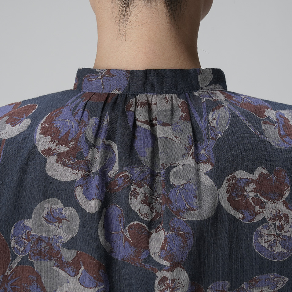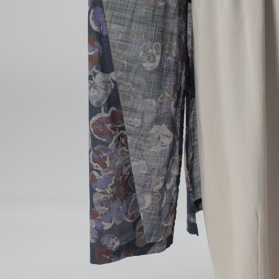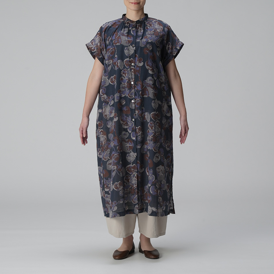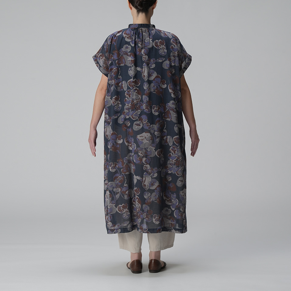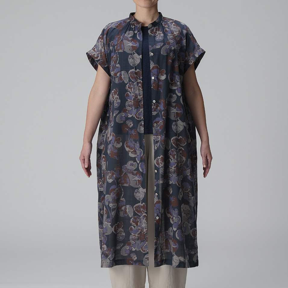 太さにムラのある極細スラブ糸をシャトル織機でゆっくり織り上げた薄手ローン。浜松の古橋織物さんと長年つくり続けている定番素材で、使い込むほどにやわらかく肌になじんで手放せなくなります。初夏の海岸に咲く浜昼顔を、繊細に重なり合う色で描き出して、大人の華やぎを表現しました。