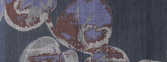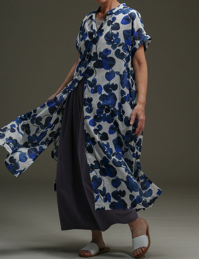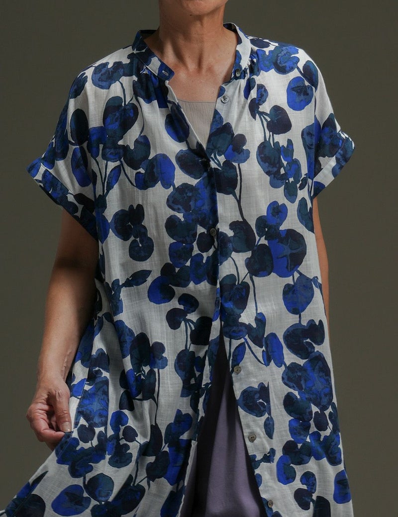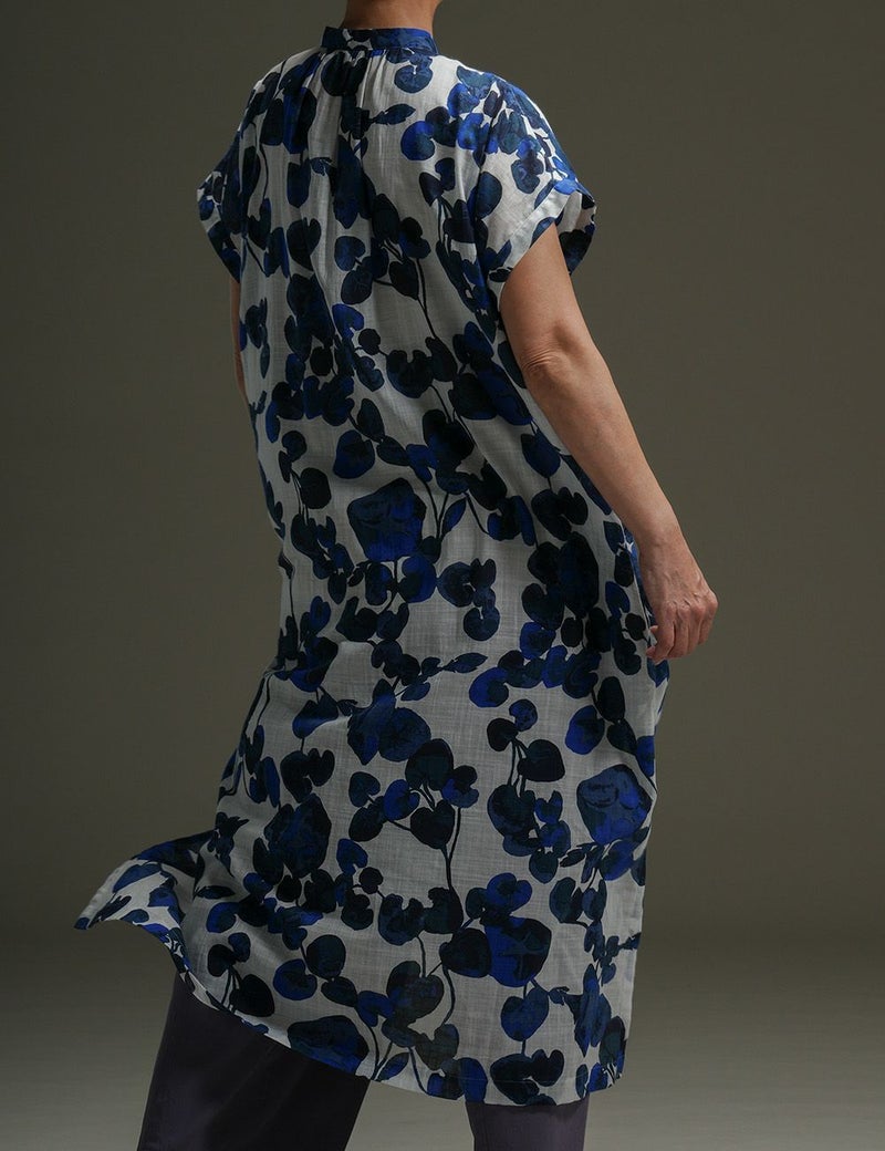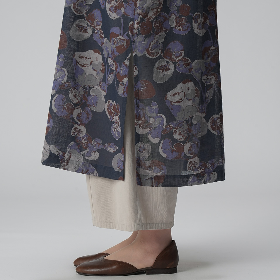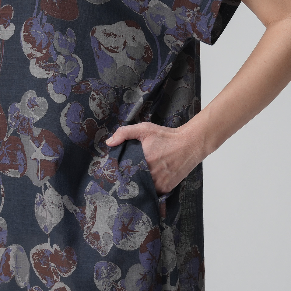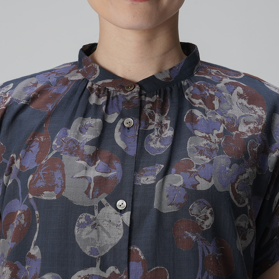 太さにムラのある極細スラブ糸をシャトル織機でゆっくり織り上げた薄手ローン。浜松の古橋織物さんと長年つくり続けている定番素材で、使い込むほどにやわらかく肌になじんで手放せなくなります。初夏の海岸に咲く浜昼顔を、繊細に重なり合う色で描き出して、大人の華やぎを表現しました。
