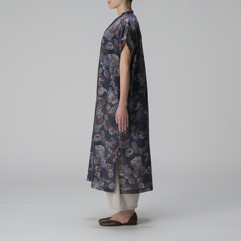 肌にやさしい極上綿ローンのかろやかさを贅沢に生かしたロングワンピース。透け感のある美しい風合いにシックなプリント柄が冴えて、まばゆい太陽の下、はっと人目を惹きつける着姿に。かさばらずシワも気にならないから、夏の旅にも重宝します。