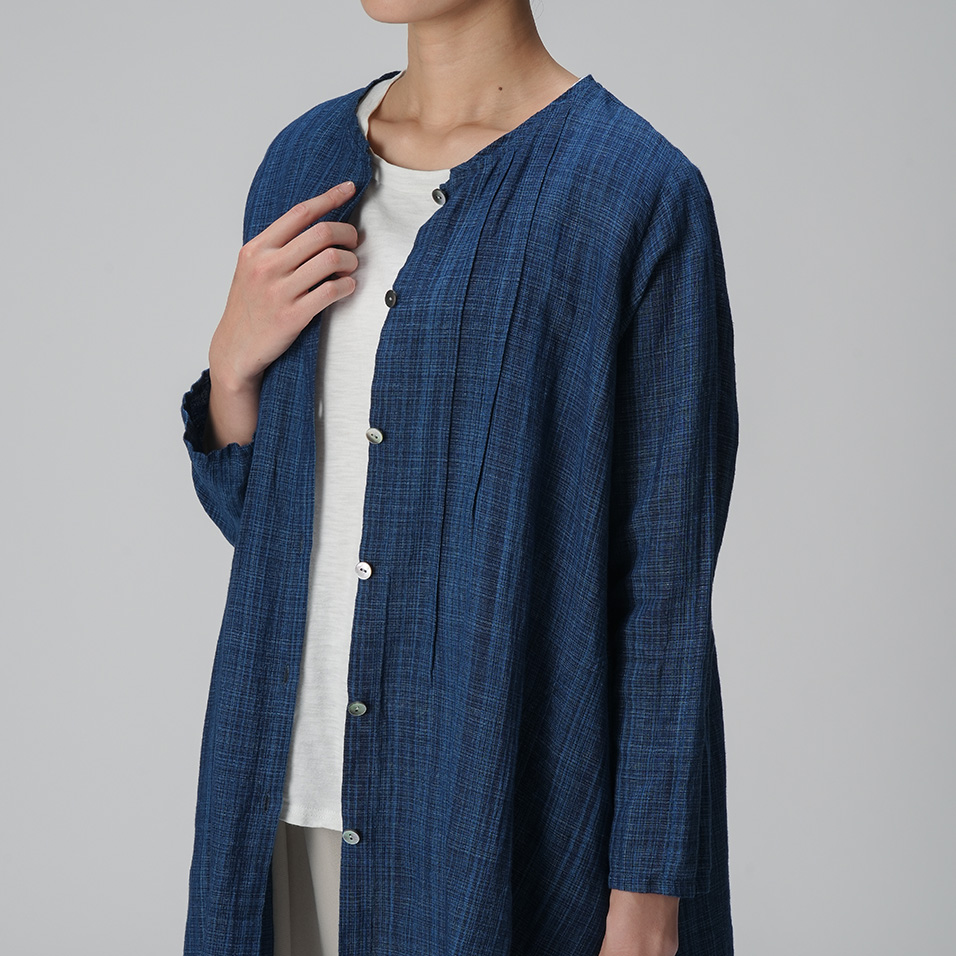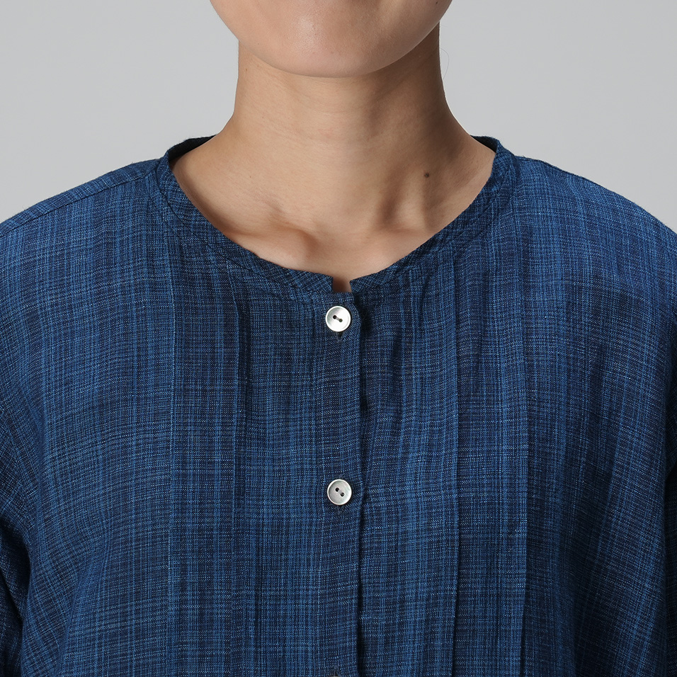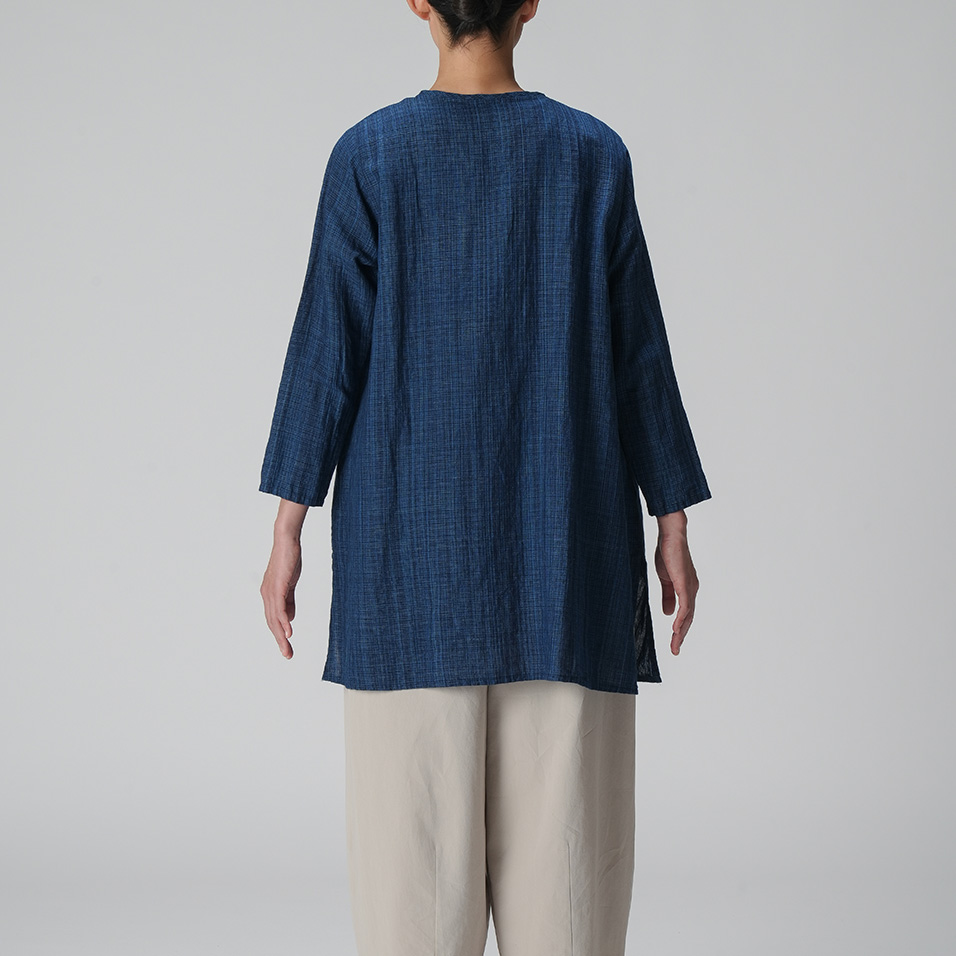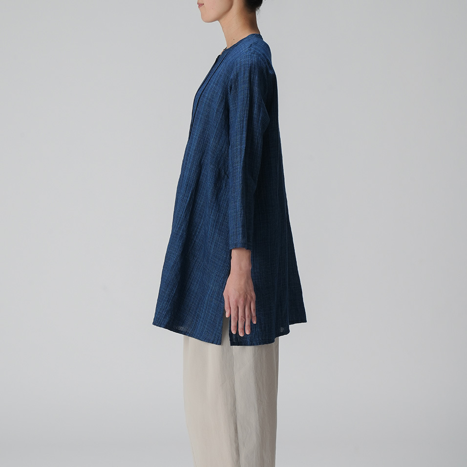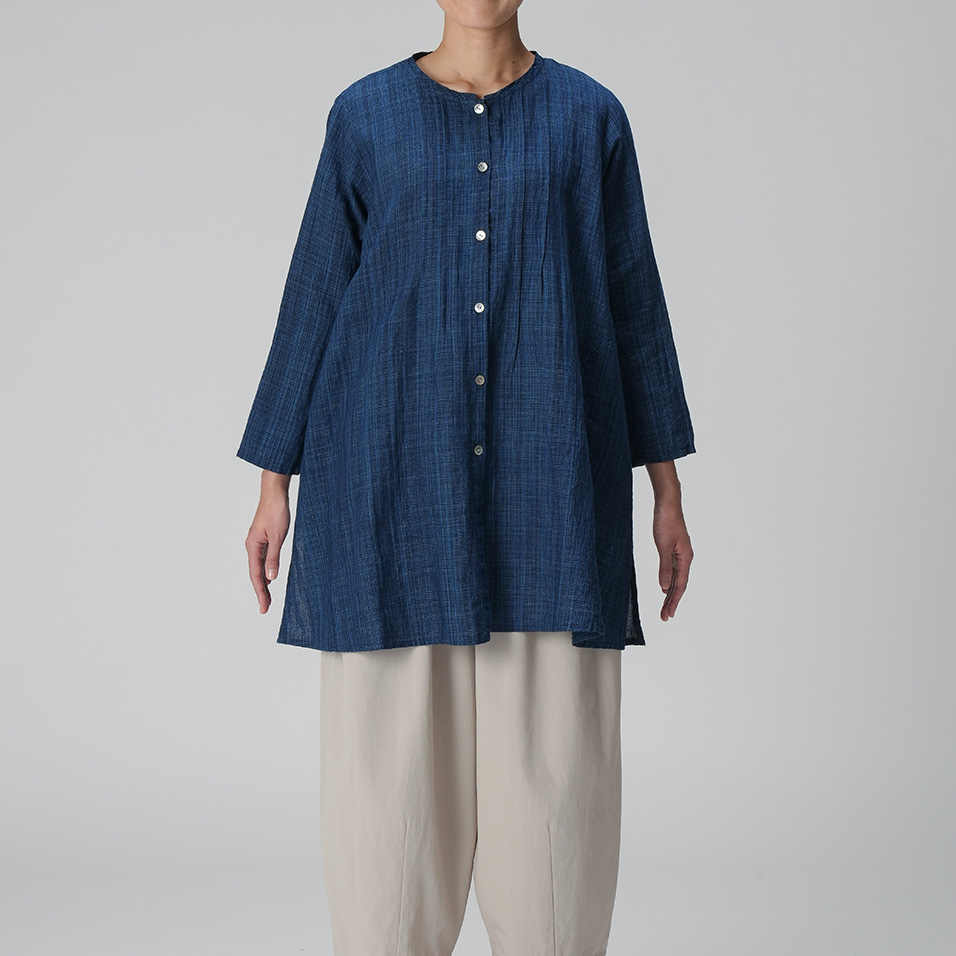 藍染め糸の表情が一本一本際立つ綿麻生地の美しさを生かしたロングブラウス。胸元ピンタックを効かせたシンプルな形で、ブラウスとしても羽織ものとしても活躍します。シンプルな着こなしでもこだわりが伝わる、とっておきの一枚です。
