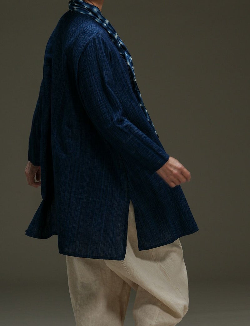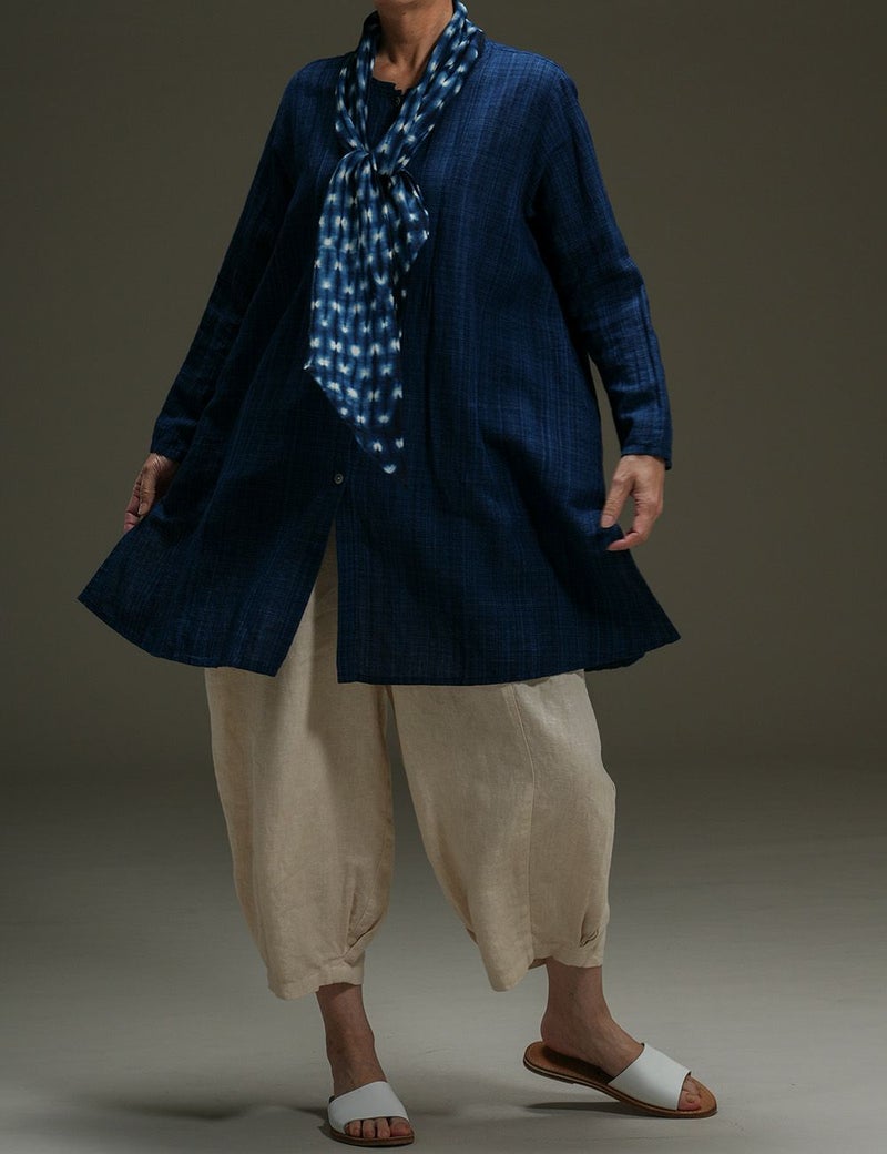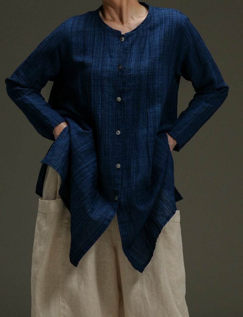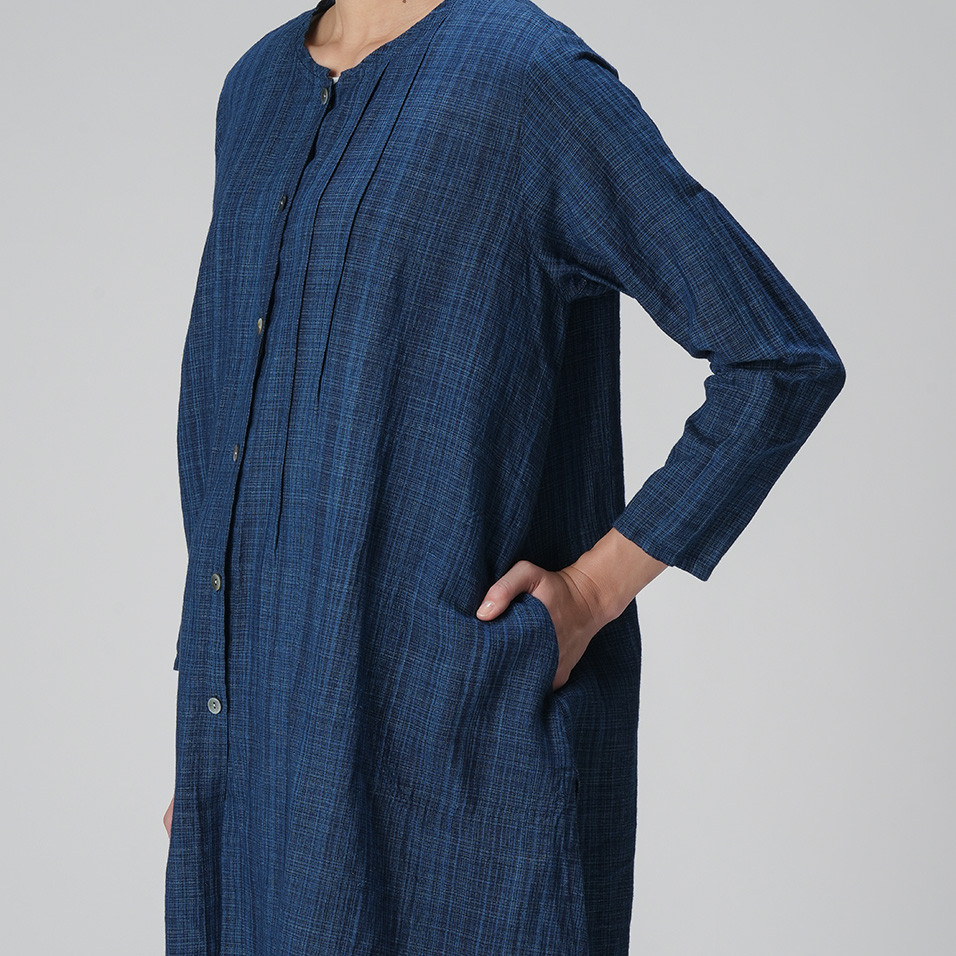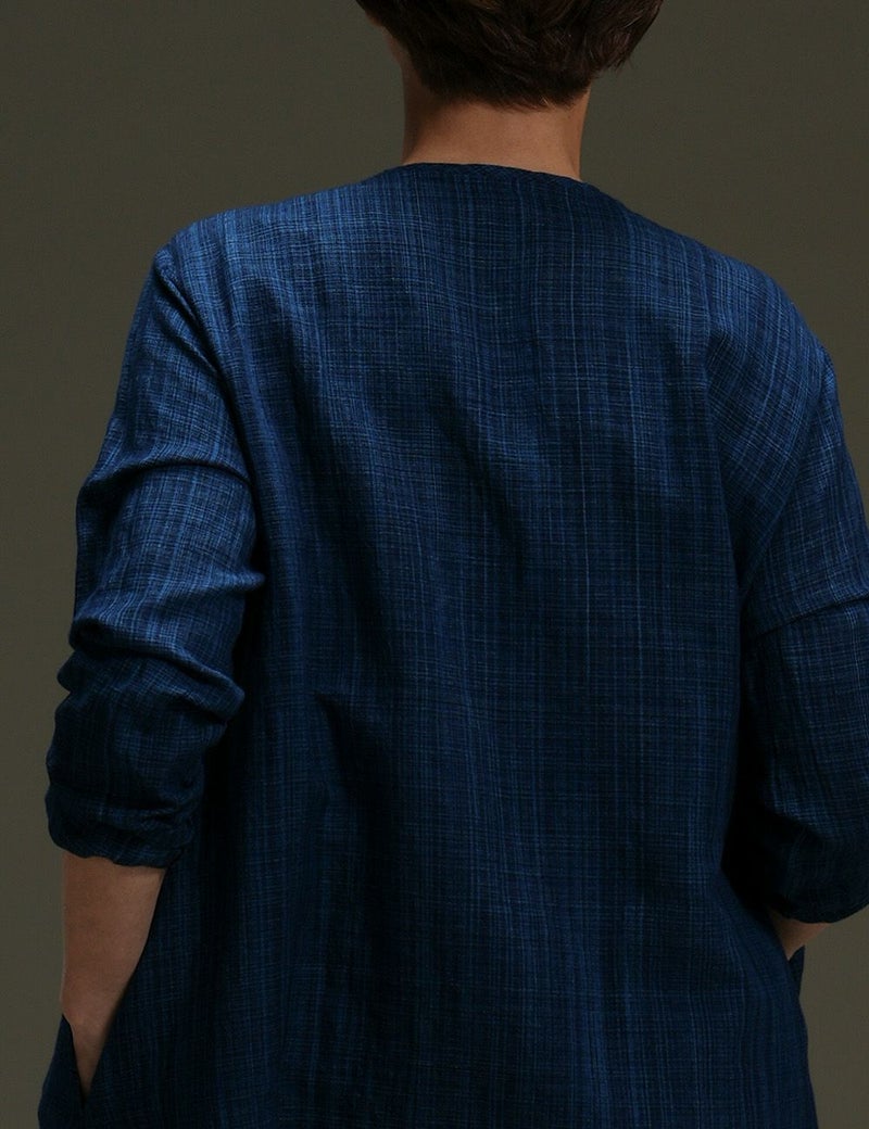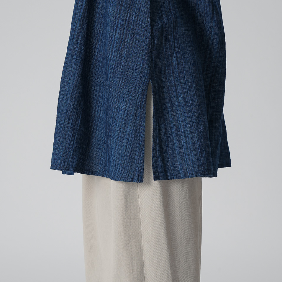 藍染め糸の表情が一本一本際立つ綿麻生地の美しさを生かしたロングブラウス。胸元ピンタックを効かせたシンプルな形で、ブラウスとしても羽織ものとしても活躍します。シンプルな着こなしでもこだわりが伝わる、とっておきの一枚です。