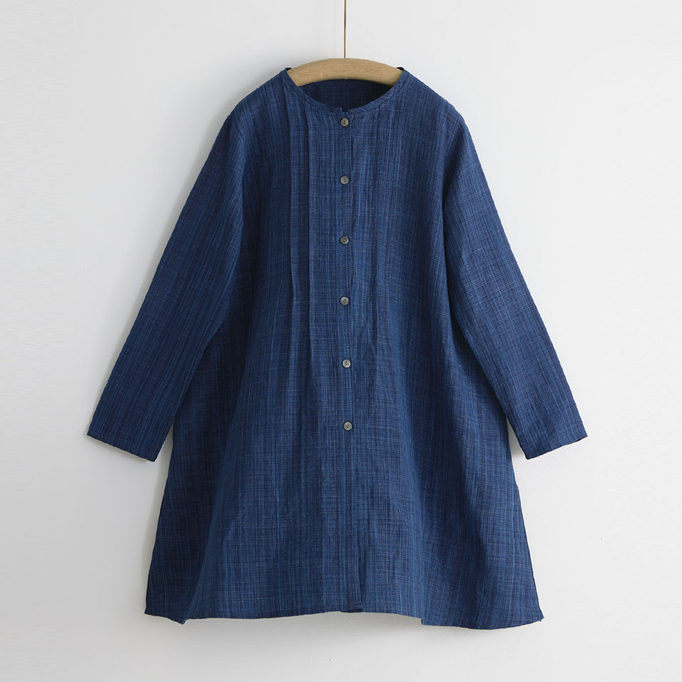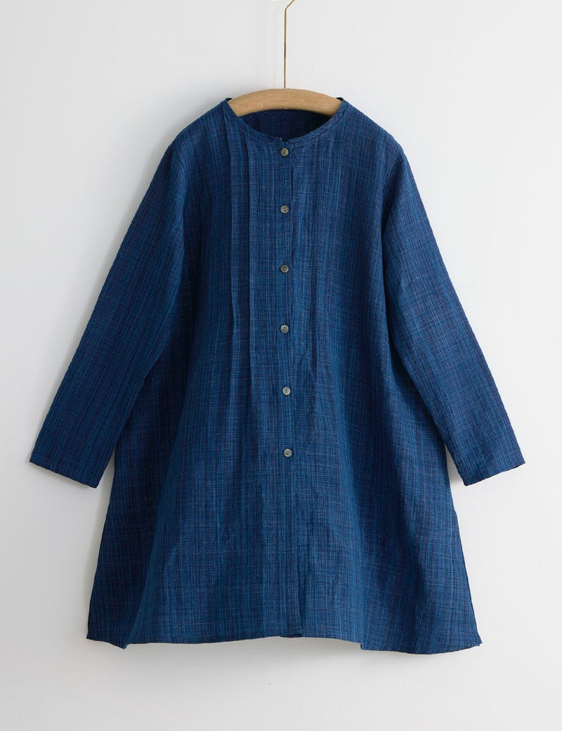 冴えた藍の濃淡が醸し出す、繊細なみじん格子のような表情。経糸(たていと)には絣染めした綿糸を、緯糸(よこいと)には濃淡2色の麻糸を使用して、ほのかな光沢とシャリ感のある風合いに織り上げました。長く付き合うほどに自分だけの色合いに育っていくのも楽しみです。