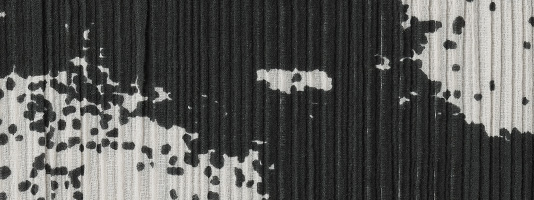 横方向のストレッチ性に富んだプリーツ生地に、鳴き砂で知られる島根・琴ヶ浜の海岸をイメージしたプリントをほどこしました。生地裏には横方向にポリウレタン糸を走らせて、安定性も良好に。凹凸の多い生地にプリントするという難易度の高い仕事に、京都の老舗染工所の技が光っています。