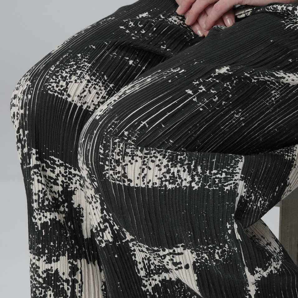 墨絵のような大胆プリントとプリーツの粋な出会い。