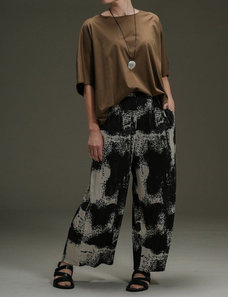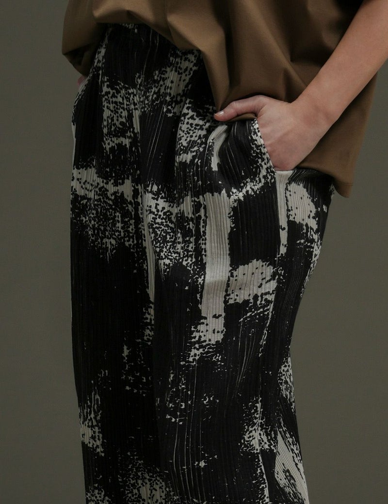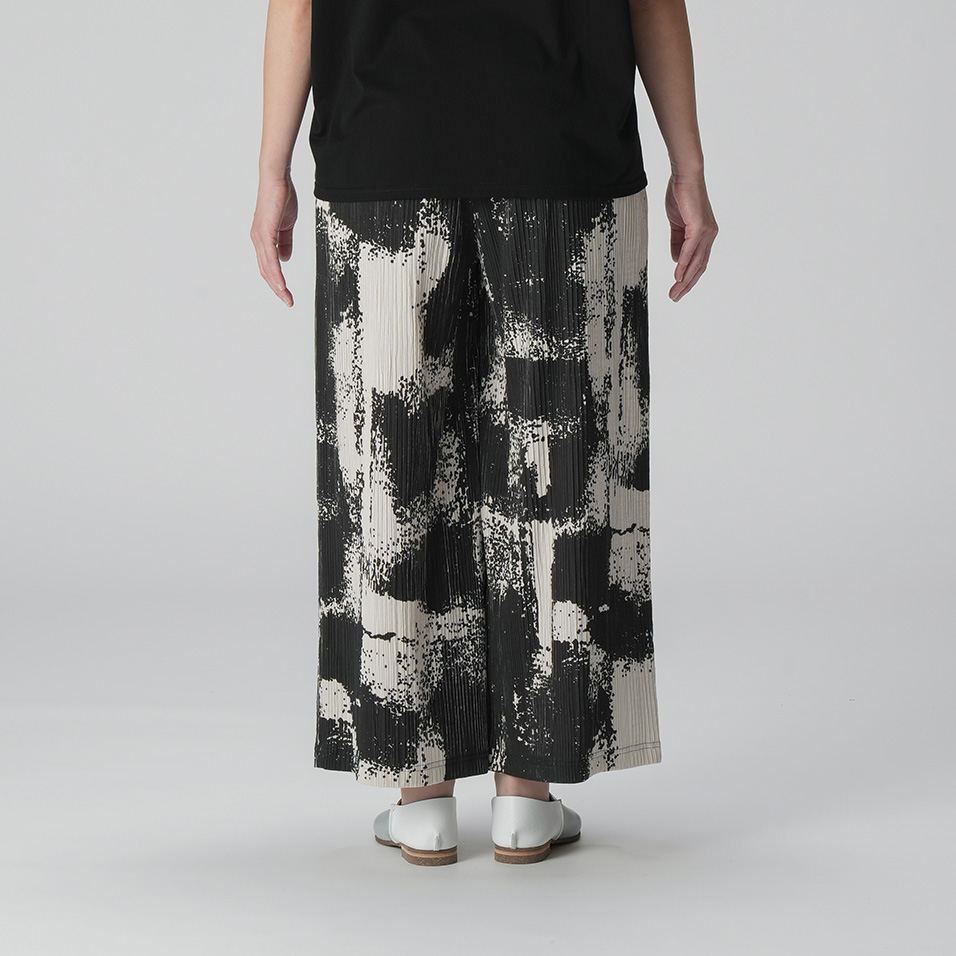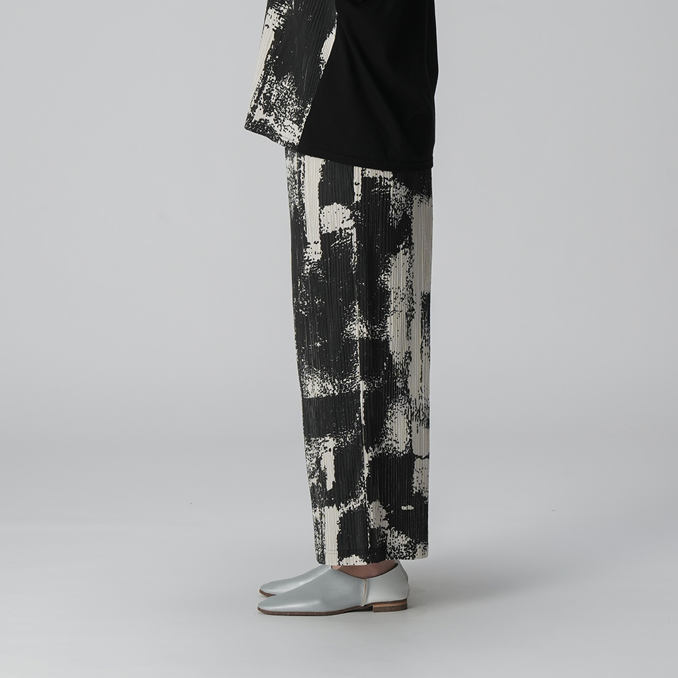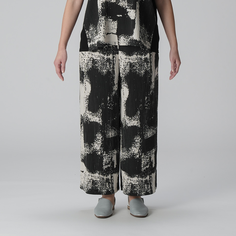ストレッチ性にすぐれたプリーツ生地を生かしたストレートパンツ。島根・琴ヶ浜の「鳴き砂」をイメージした墨絵のような大胆プリントが、現代的な和の美を漂わせて、シンプルな着こなしでも存在感を発揮。シワが気にならないので旅行のおともにも活躍します。